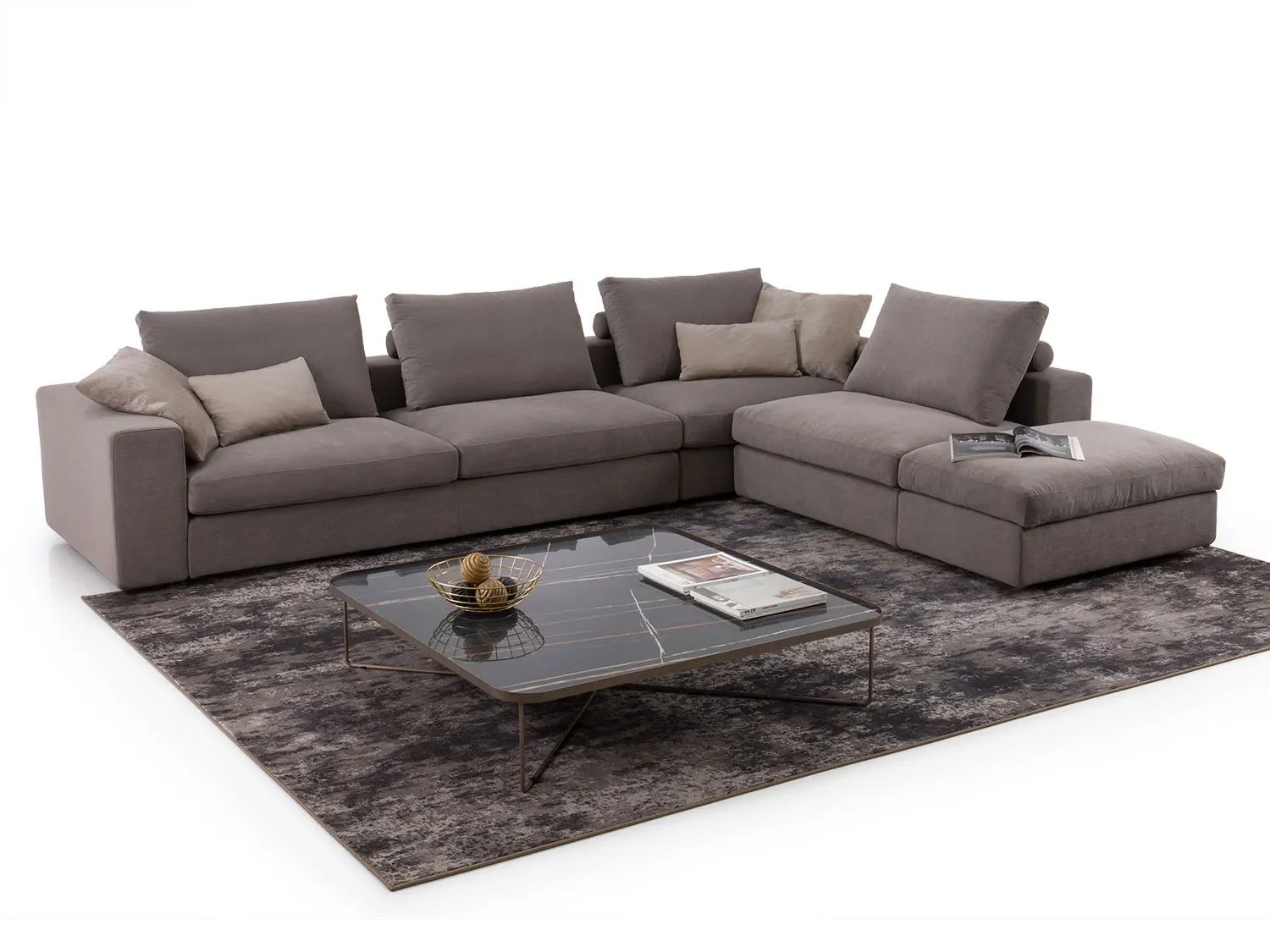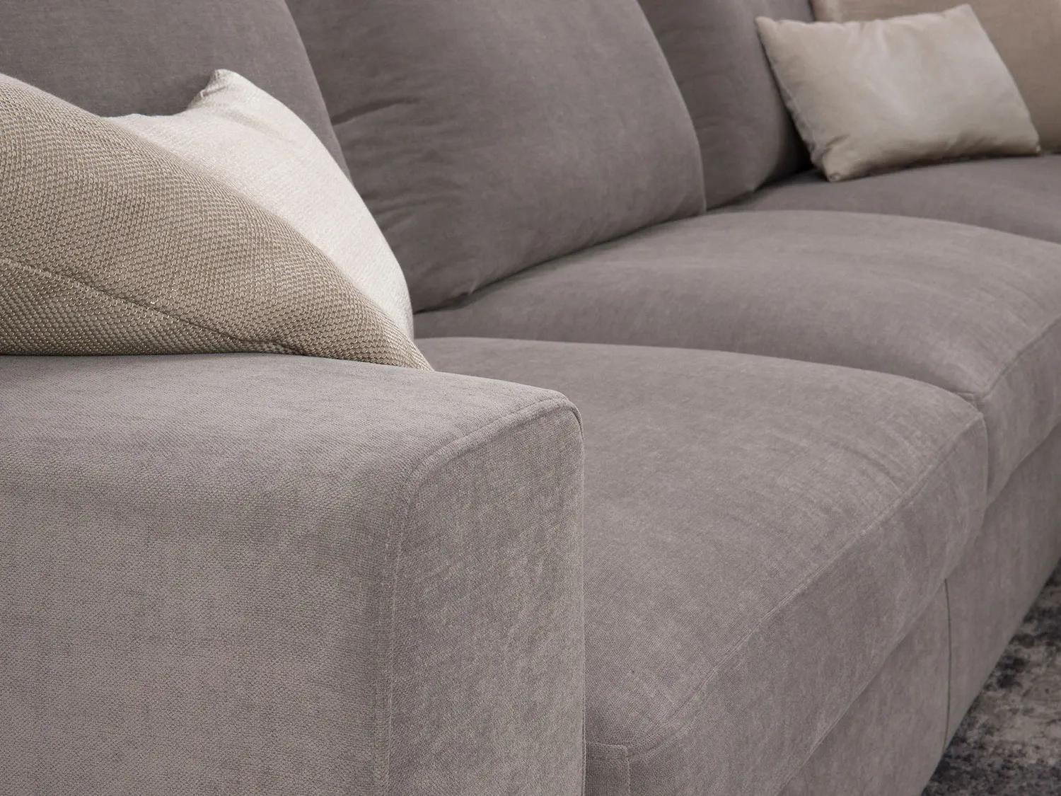 Hyeres outlet è un divano angolare con pouf terminale, rivestito in un tessuto antimacchia resistente ma piacevolmente morbido al tatto, con effetto ciniglia in tonalità grigio. Completano la proposta cinque raffinati cuscini decorativi, rivestiti con tessuti eleganti e luminosi, inclusi nell'offerta.