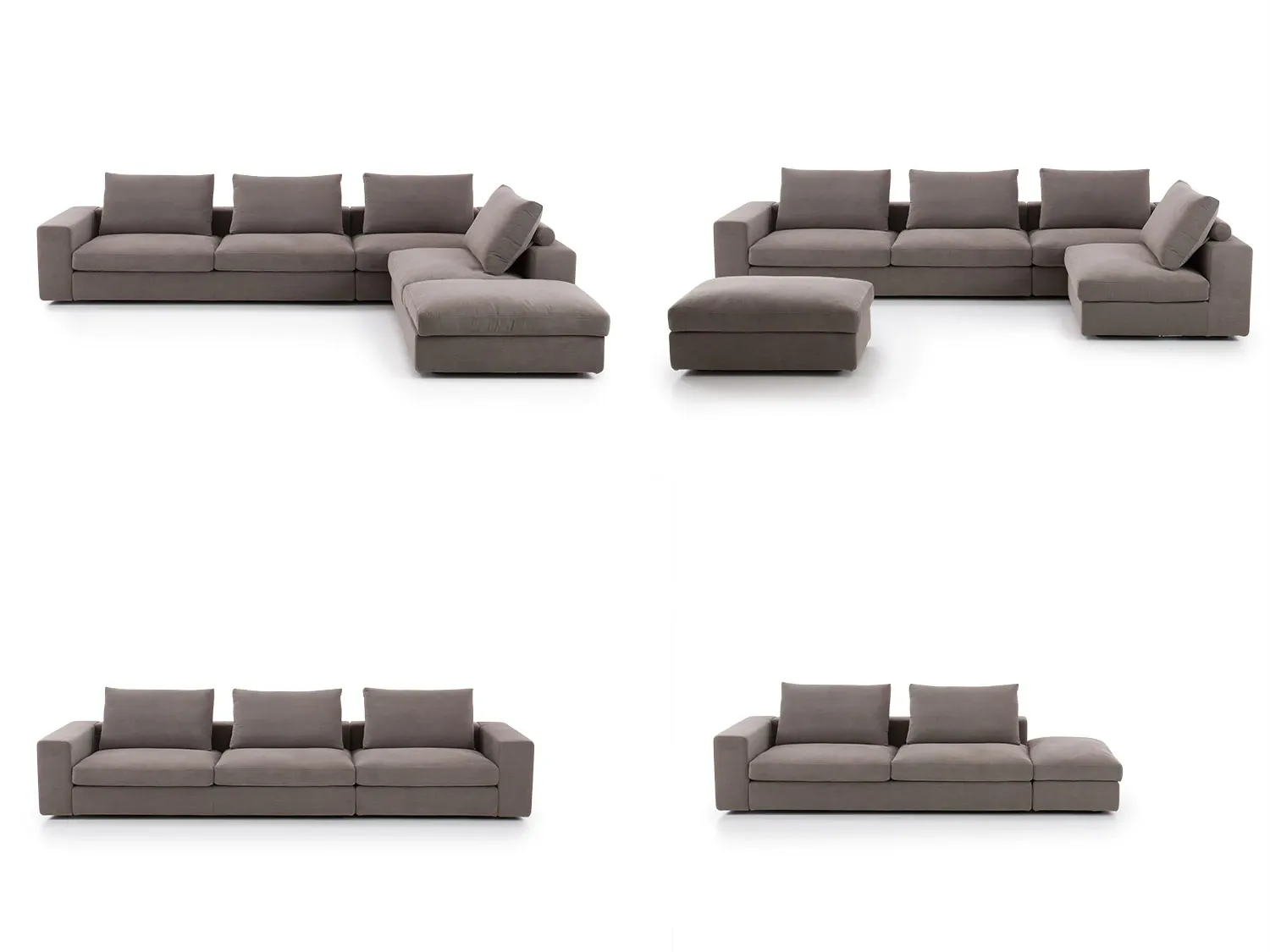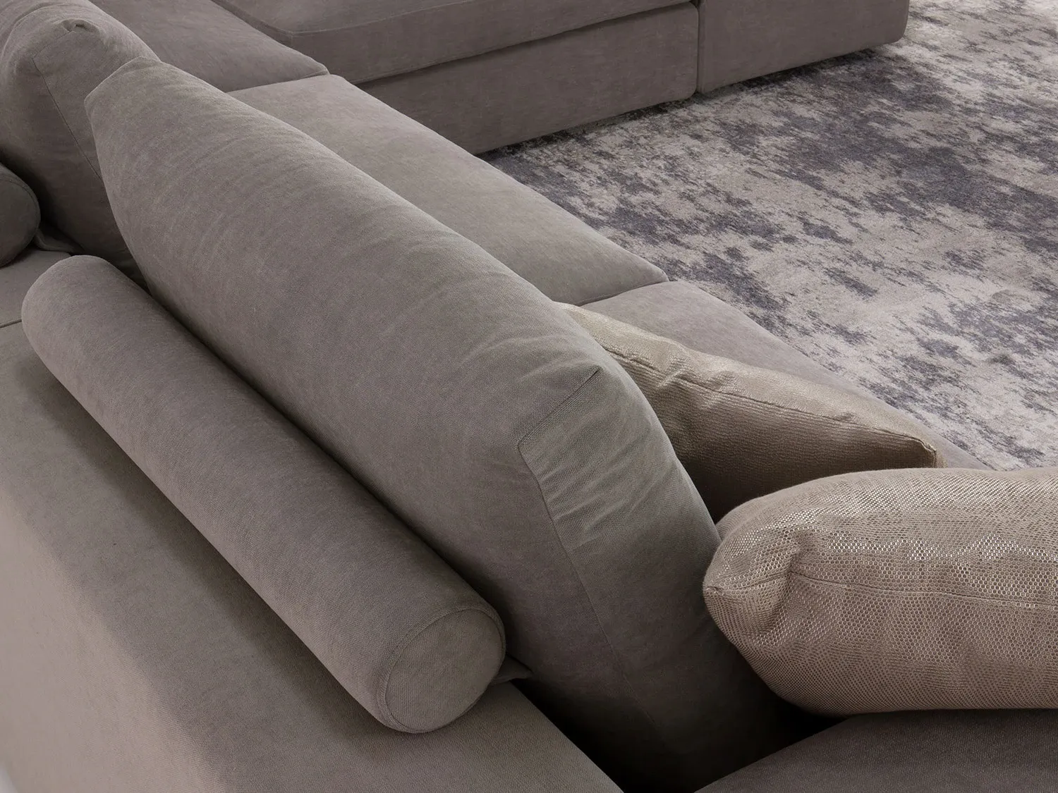 Le cuscinature dello schienale sono dotate di un rullo posteriore che ne garantisce il supporto, appoggiandosi al basso schienale. Proposte in una larghezza minore rispetto a quella delle sedute, contribuiscono a creare una composizione ariosa ed equilibrata, valorizzata anche dallo spazio che rimane tra un cuscino e l'altro.
