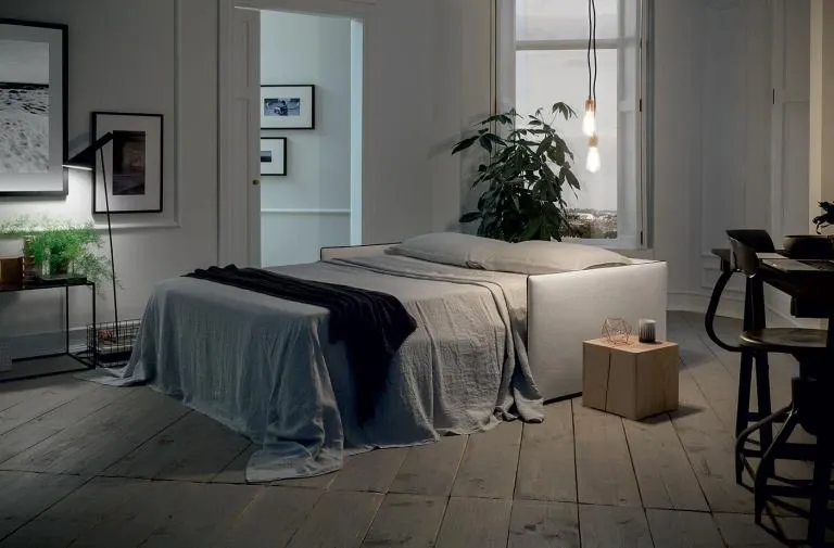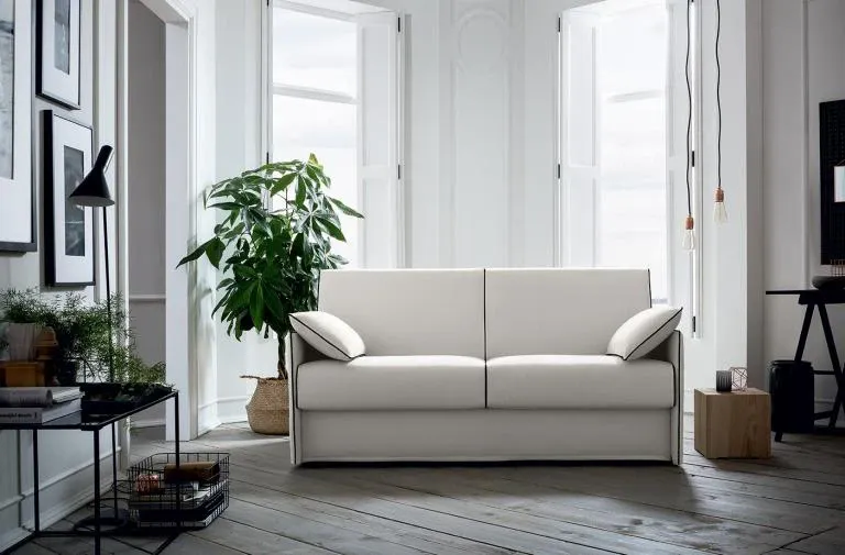 Divano LETTO in PRONTA CONSEGNA realizzato in tessuto color GRIGIO PERLA, COMPLETAMENTE SFODERABILE.