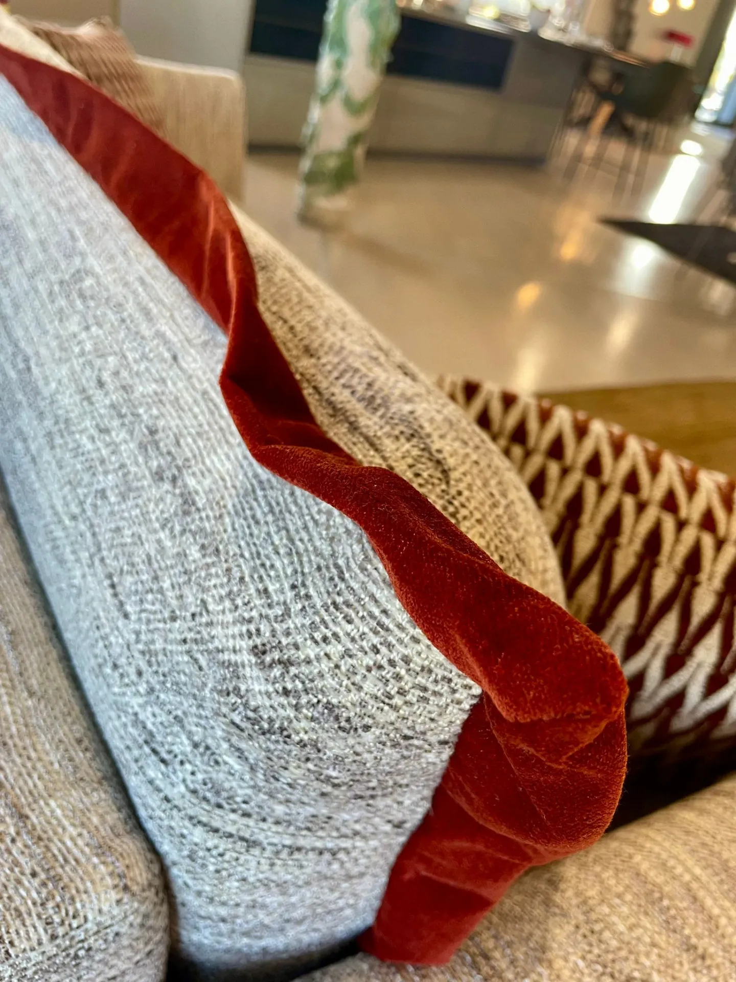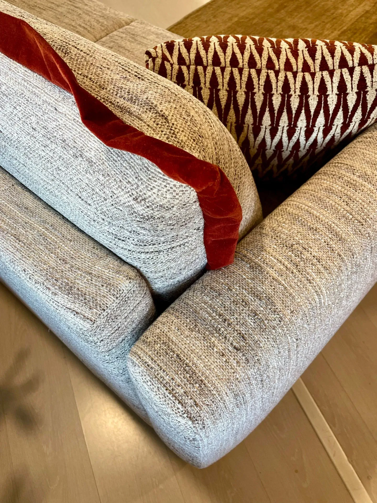 Divano letto con due cuscini a fantasia misura 45x45 in omaggio. Colore grigio melange con profilo in velluto color ruggine sul bordo dei cuscini dello schienale.