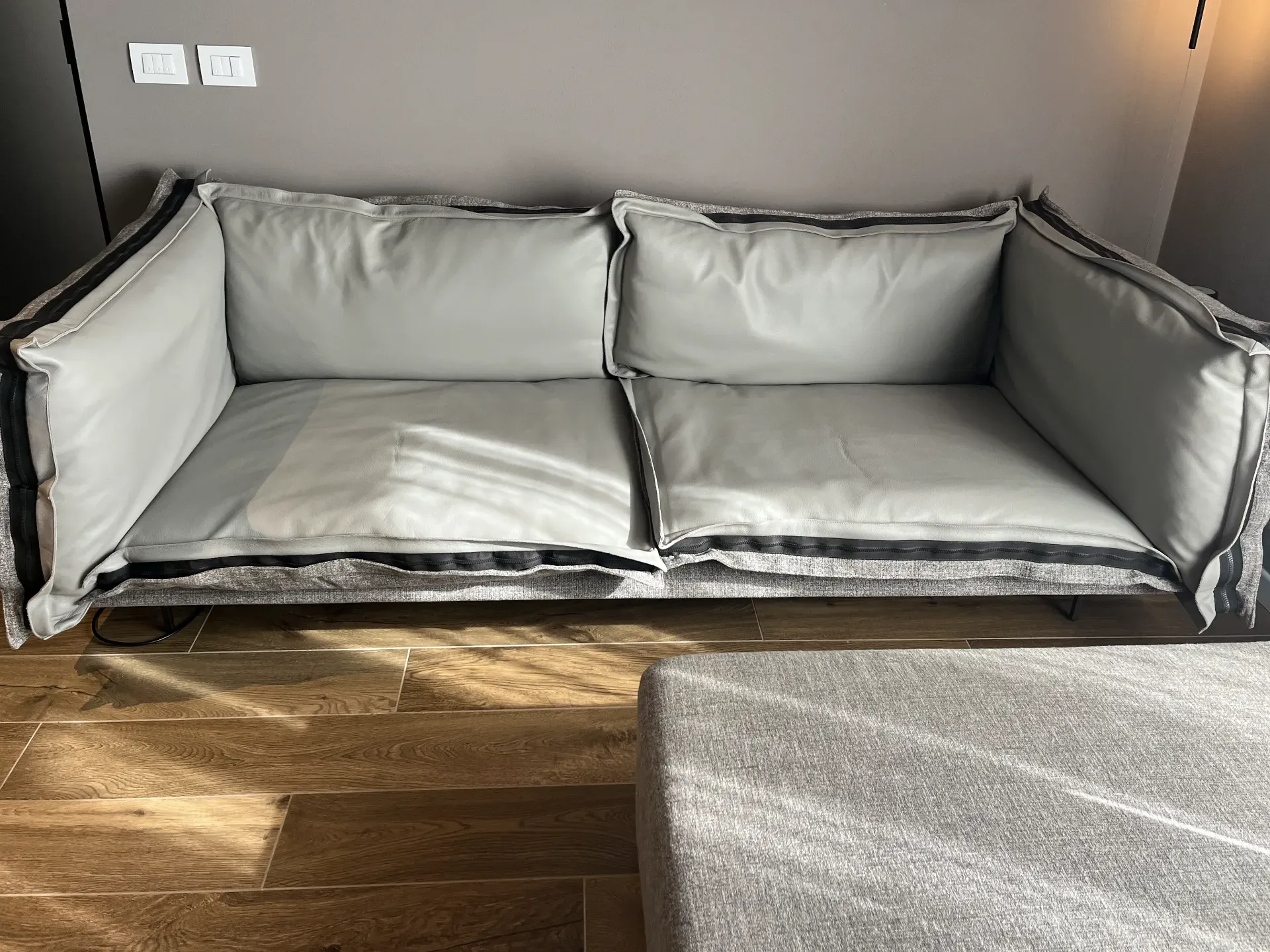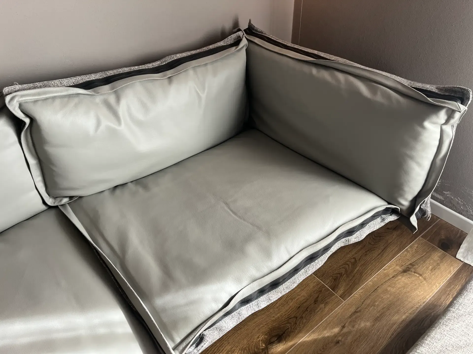 Cuscini reversibili, sia dello schienale che della seduta, con un lato in pelle Plus 4042 e un lato in e uno in tessuto categoria D Maze 4942, bordino nero.
