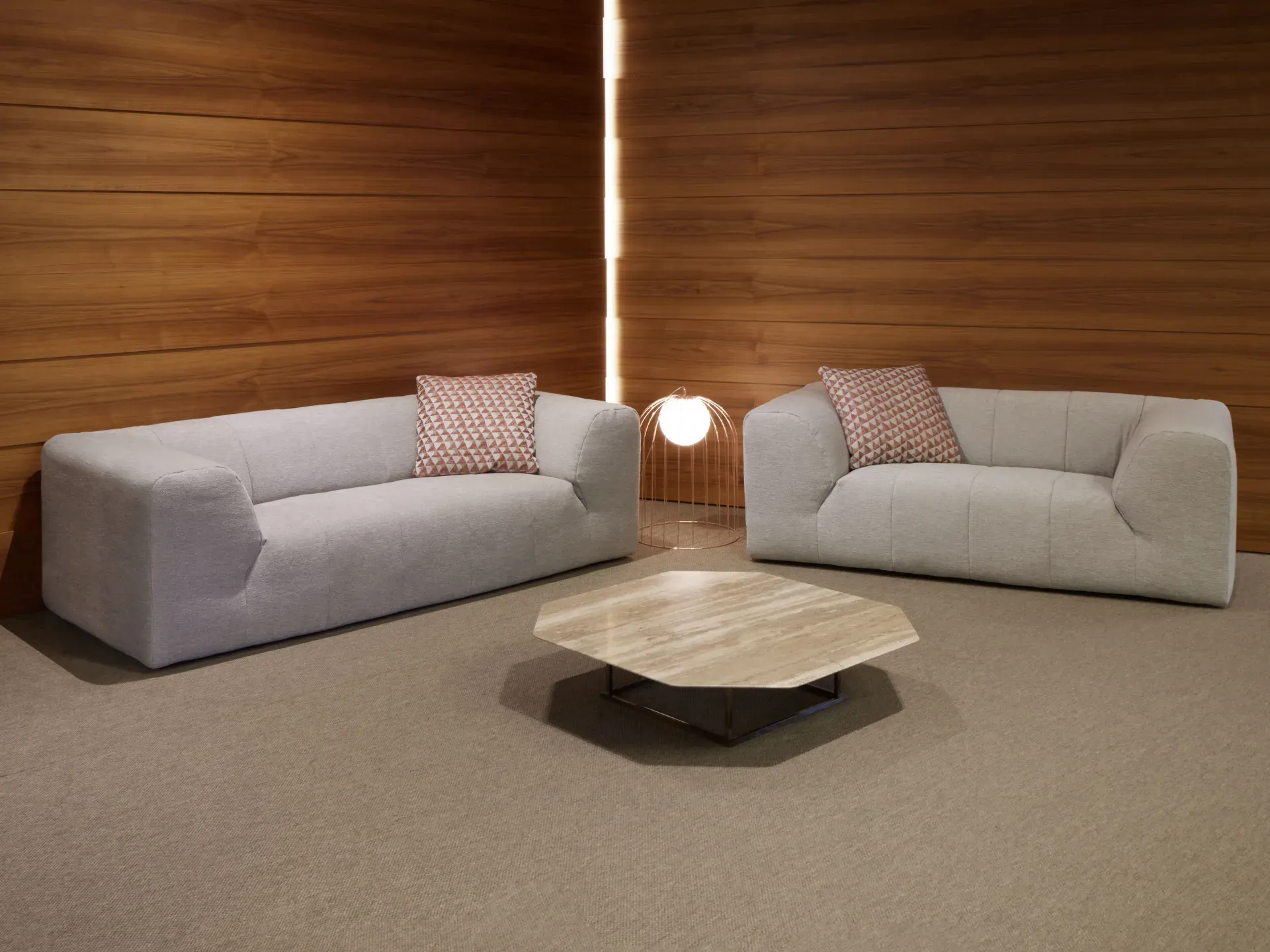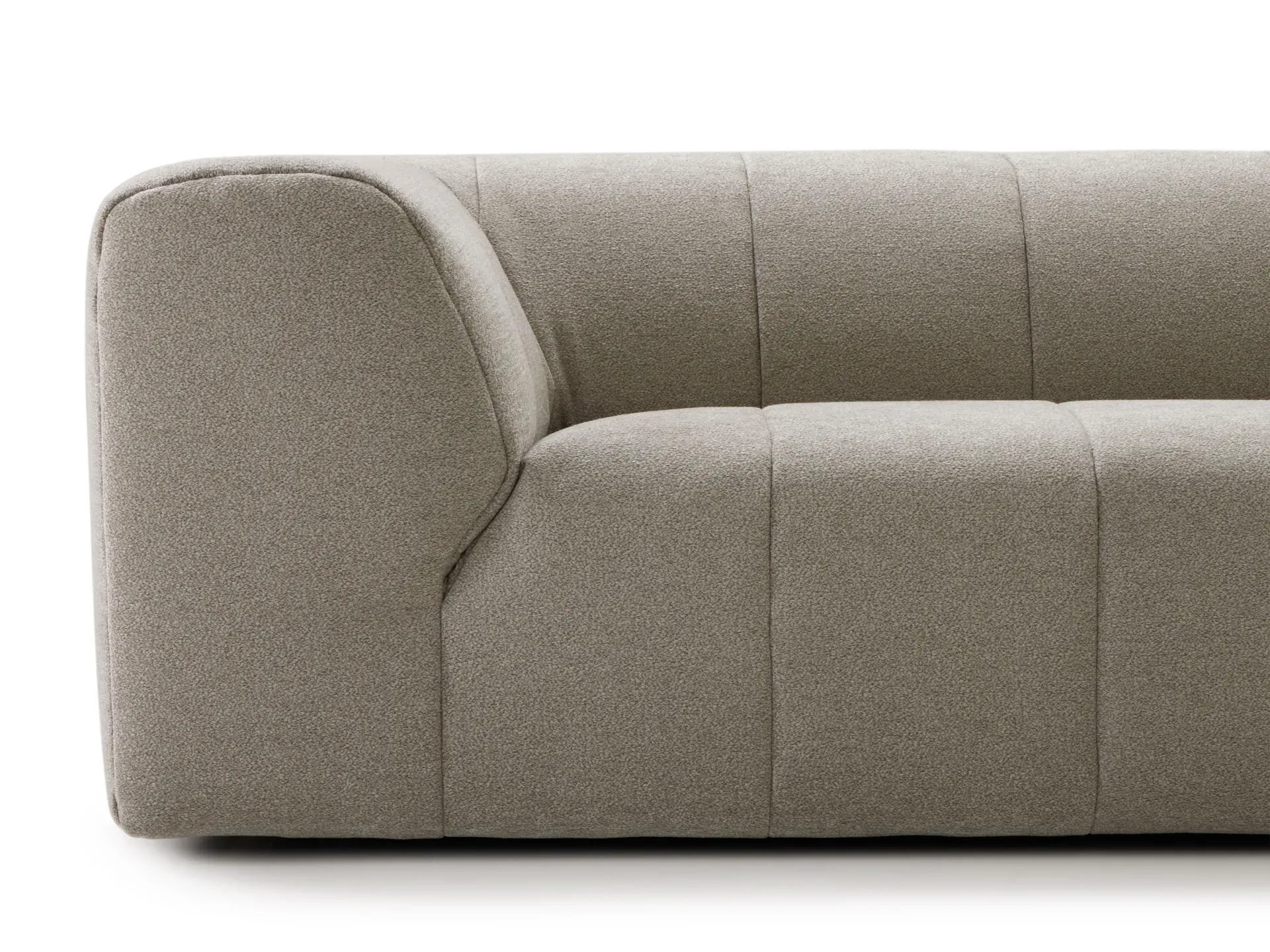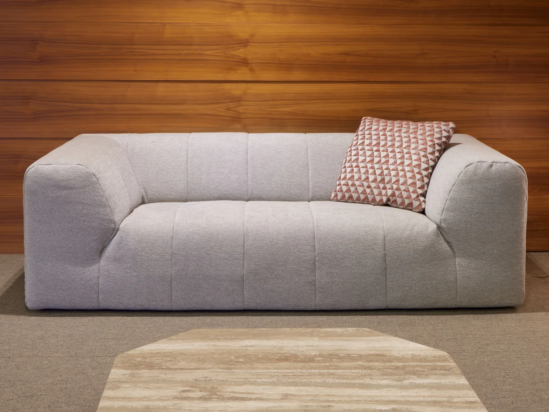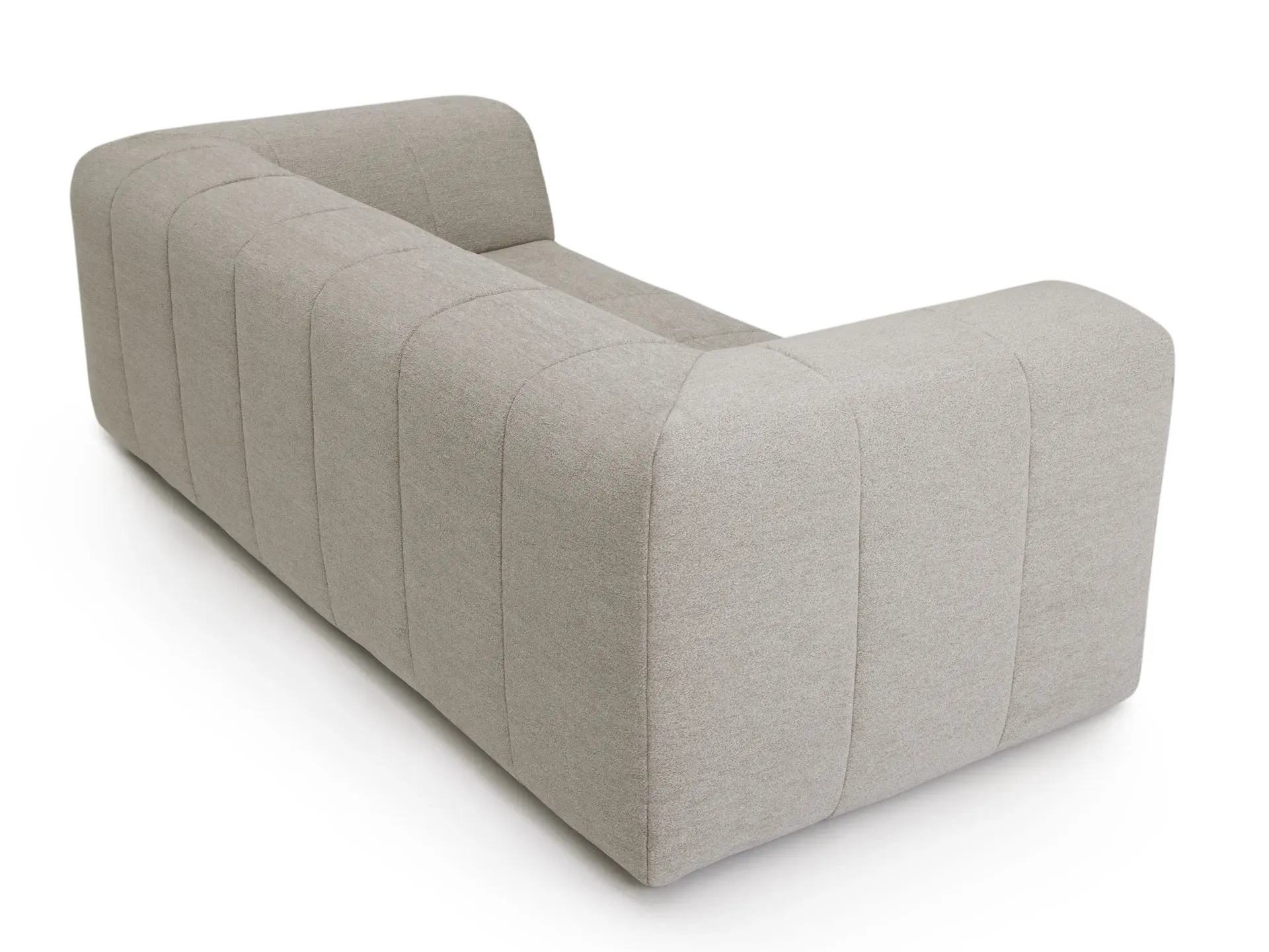 Gli alti e confortevoli braccioli si fondono armoniosamente con lo schienale, impreziosito da raffinate trapuntature verticali. Le forme, essenziali ma dal forte impatto scultoreo, sono ulteriormente valorizzate dai piedini bassi a scomparsa, che conferiscono ai due elementi un senso di solida monumentalità. Perfettamente rifiniti anche sul retro, i divani possono essere liberamente collocati anche a centro stanza.
