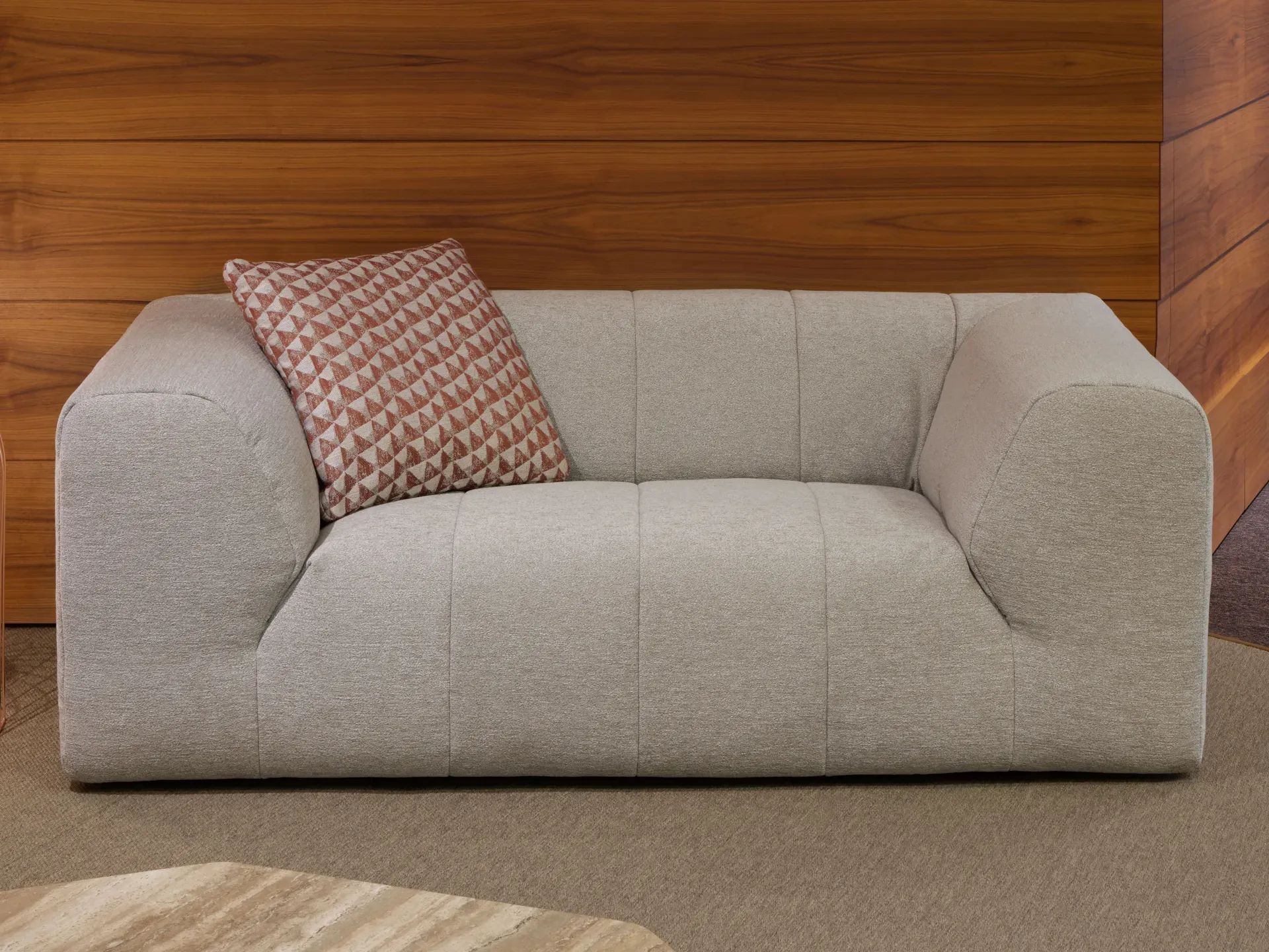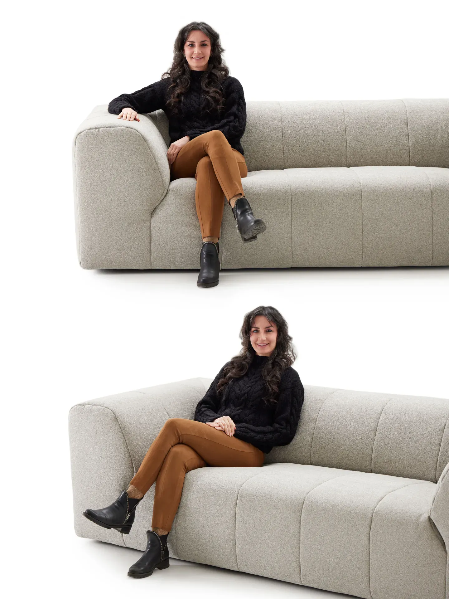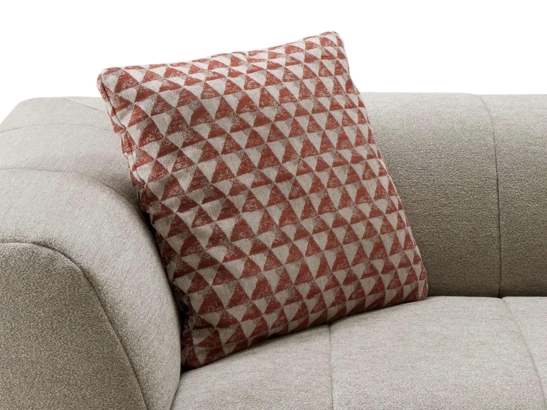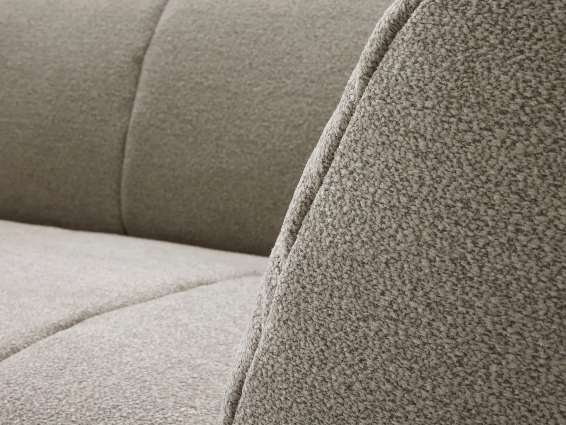 Il rivestimento, completamente sfoderabile, è realizzato in un morbido tessuto ciniglia con trama melange a filato misto, proposto in una delicata tonalità tortora. Completano l'insieme quattro ampi cuscini decorativi inclusi, rivestiti un tessuto misto lino e impreziositi da eleganti motivi geometrici.