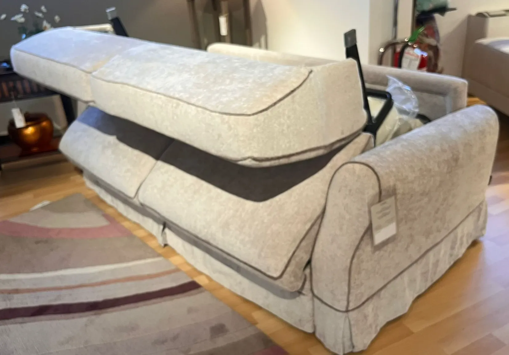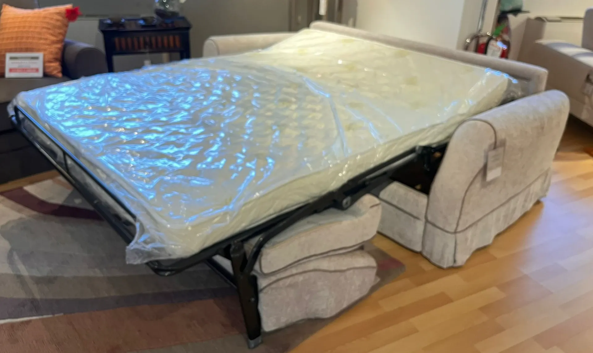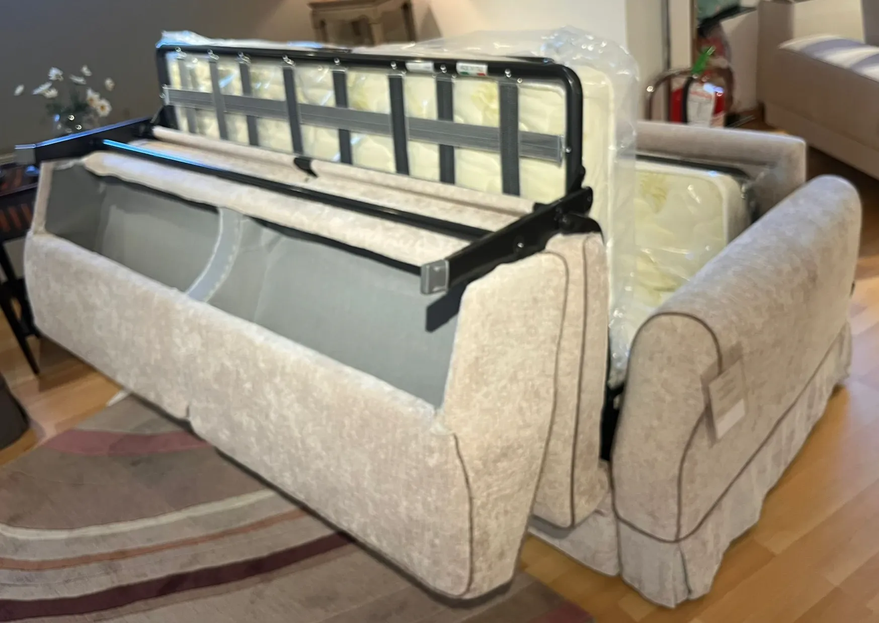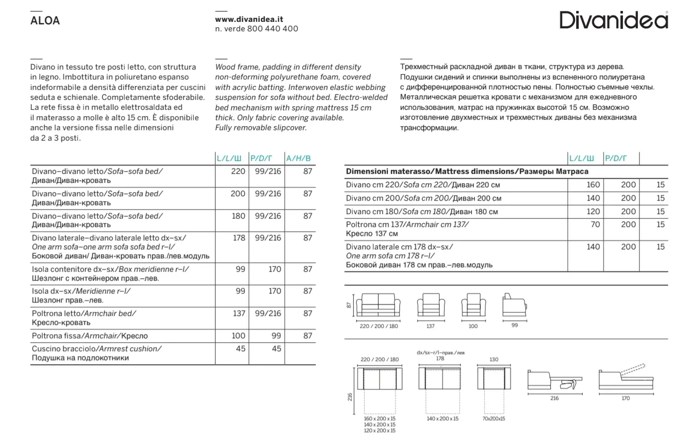 Divano in tessuto tre posti letto, con struttura in legno. Imbottitura in poliuretano espanso indeformabile a densità differenziata per cuscini seduta e schienale. Completamente sfoderabile. La rete fissa è in metallo elettrosaldata ed il materasso a molle è alto 15 cm. È disponibile anche la versione fissa nelle dimensioni da 2 a 3 posti.