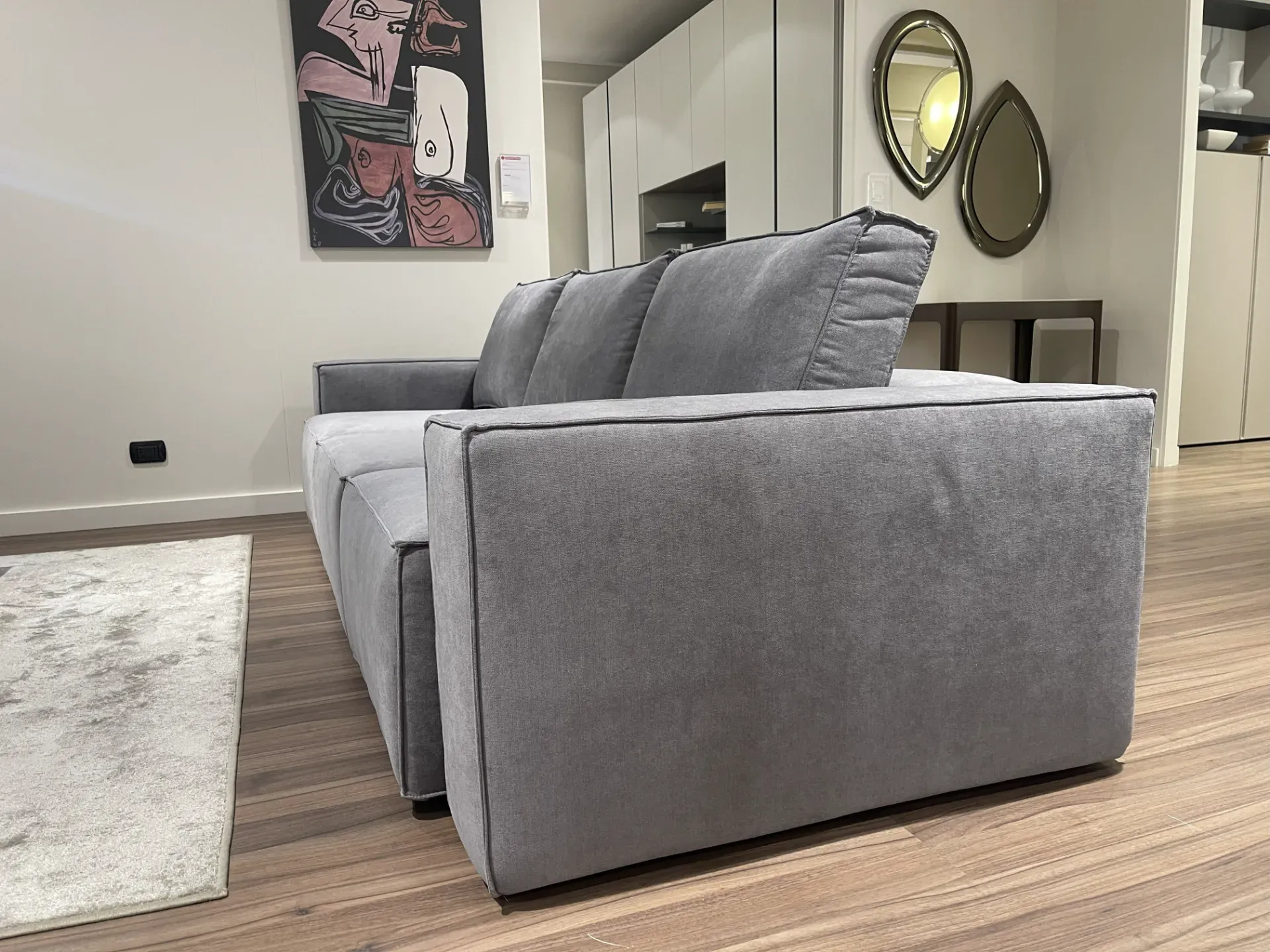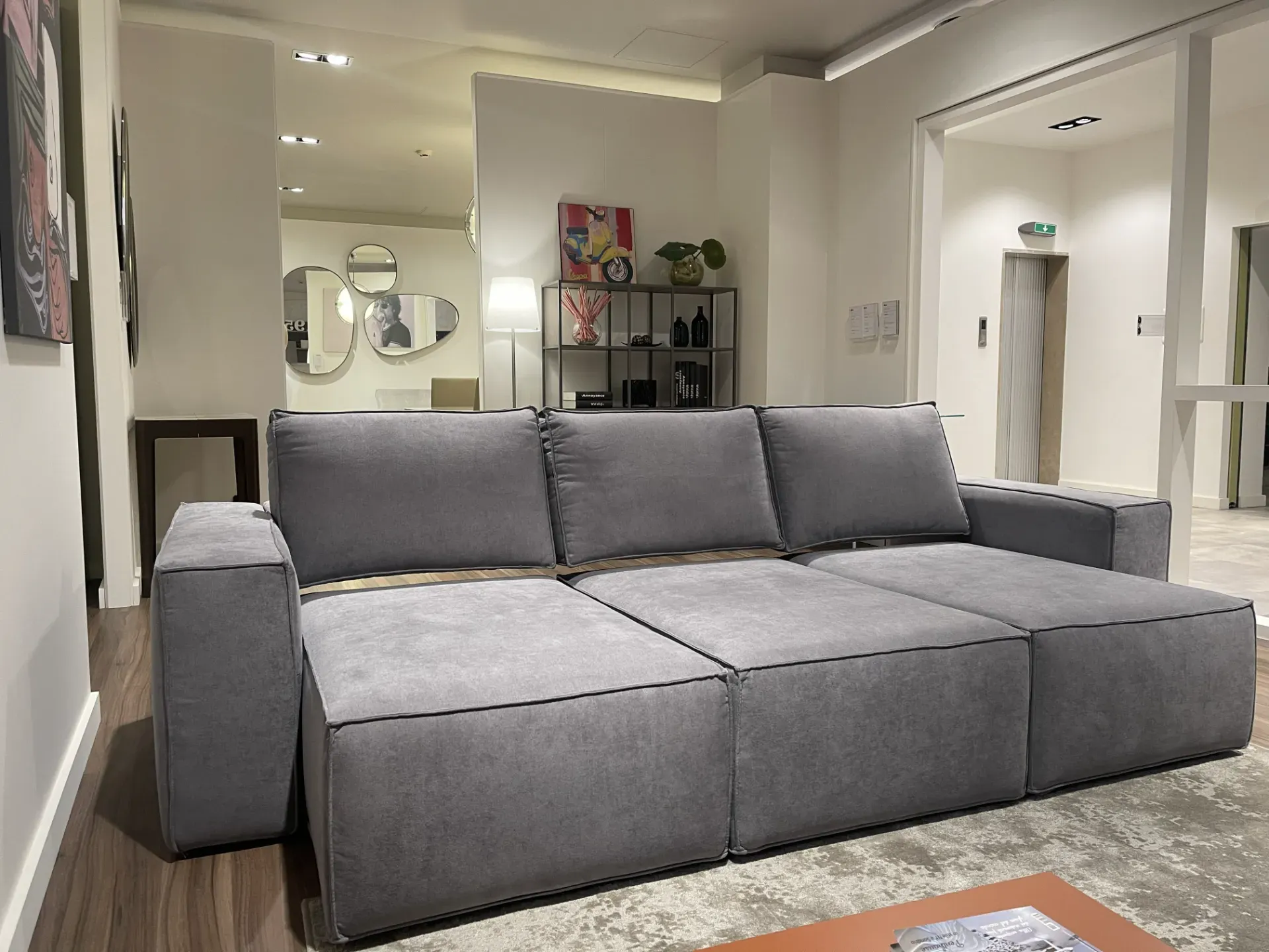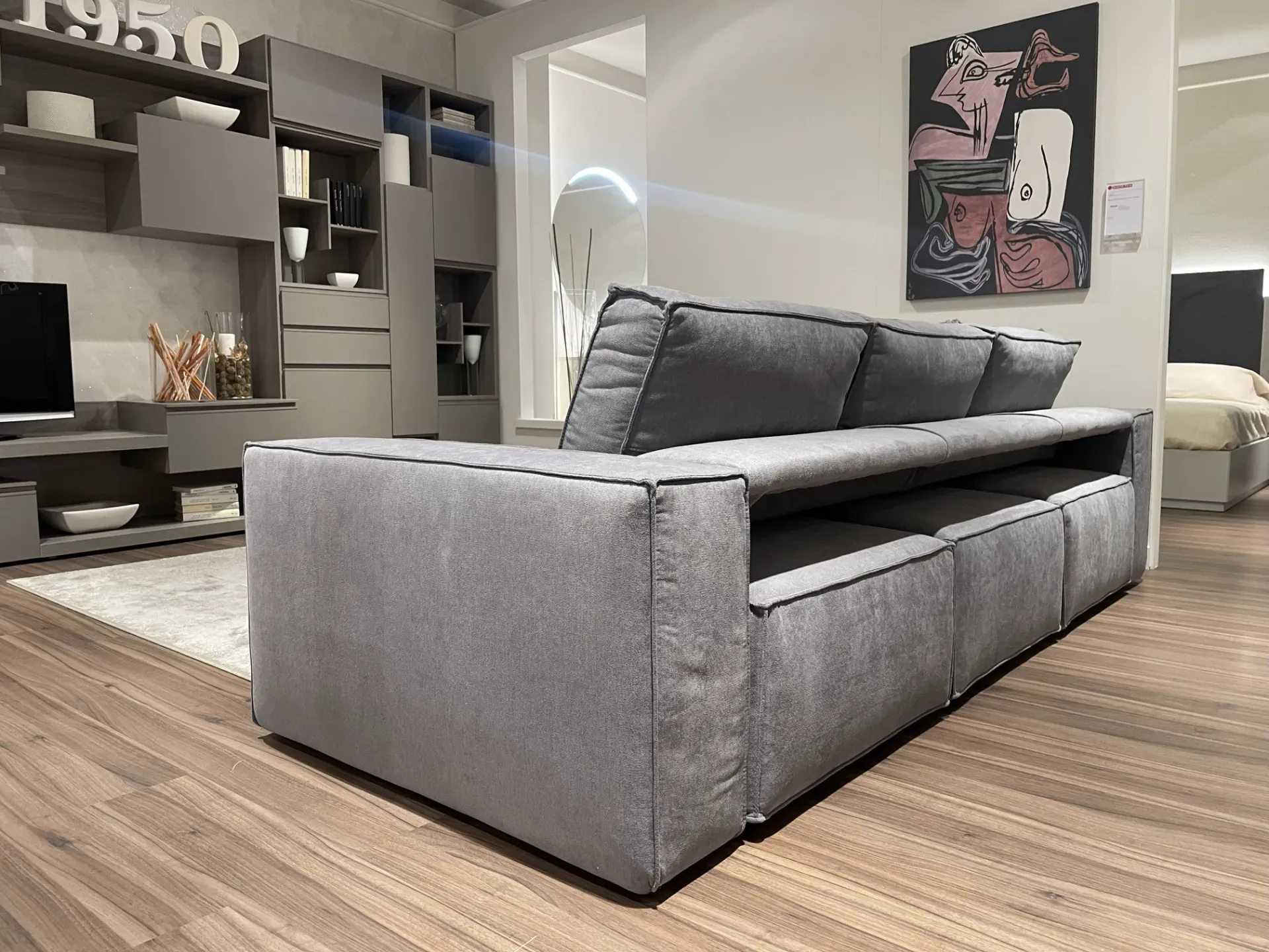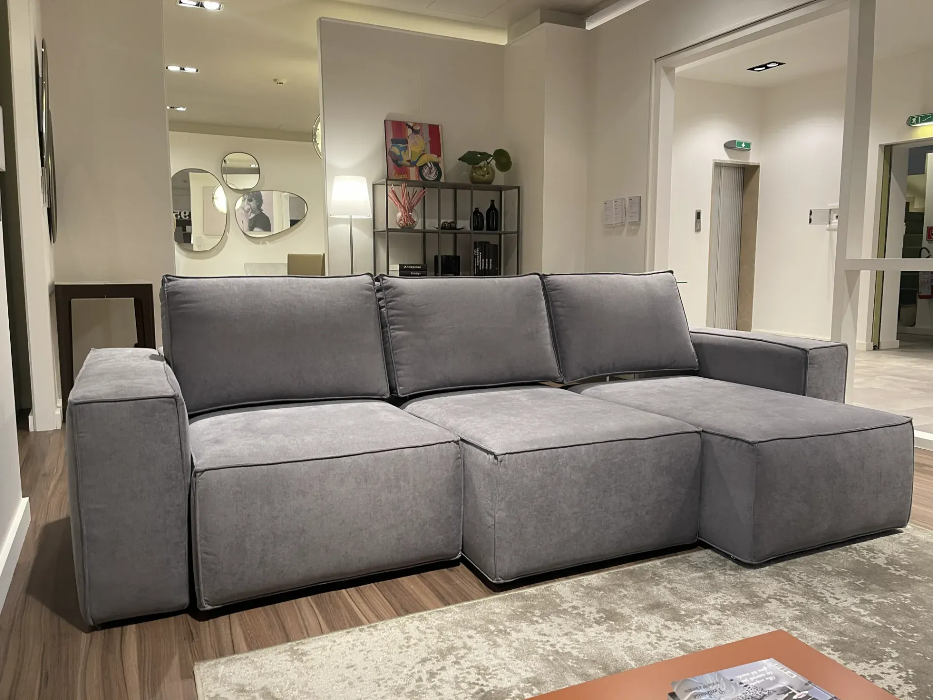 Divano in tessuto completamente sfoderabile con meccanismo sedute per effetto chaise longue.