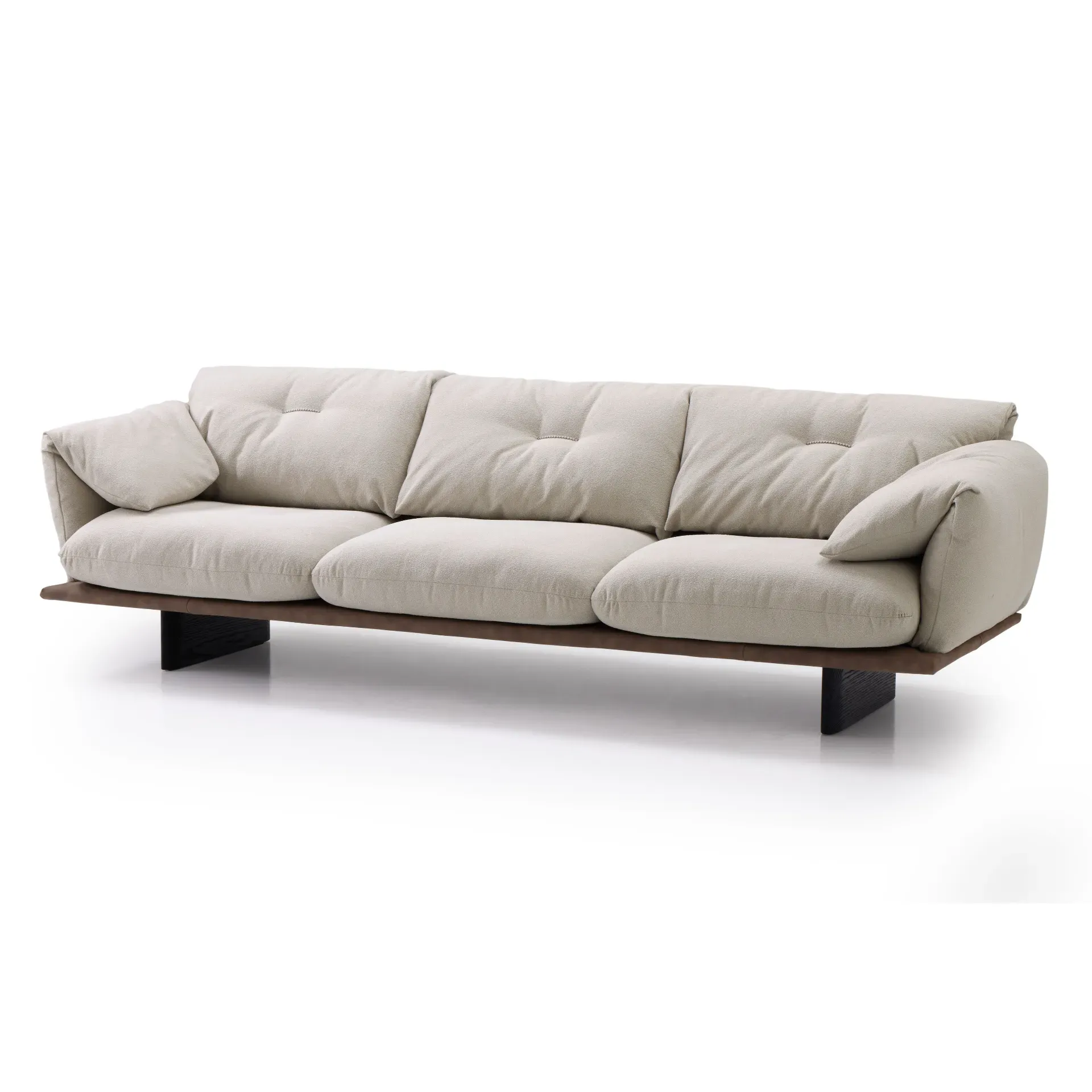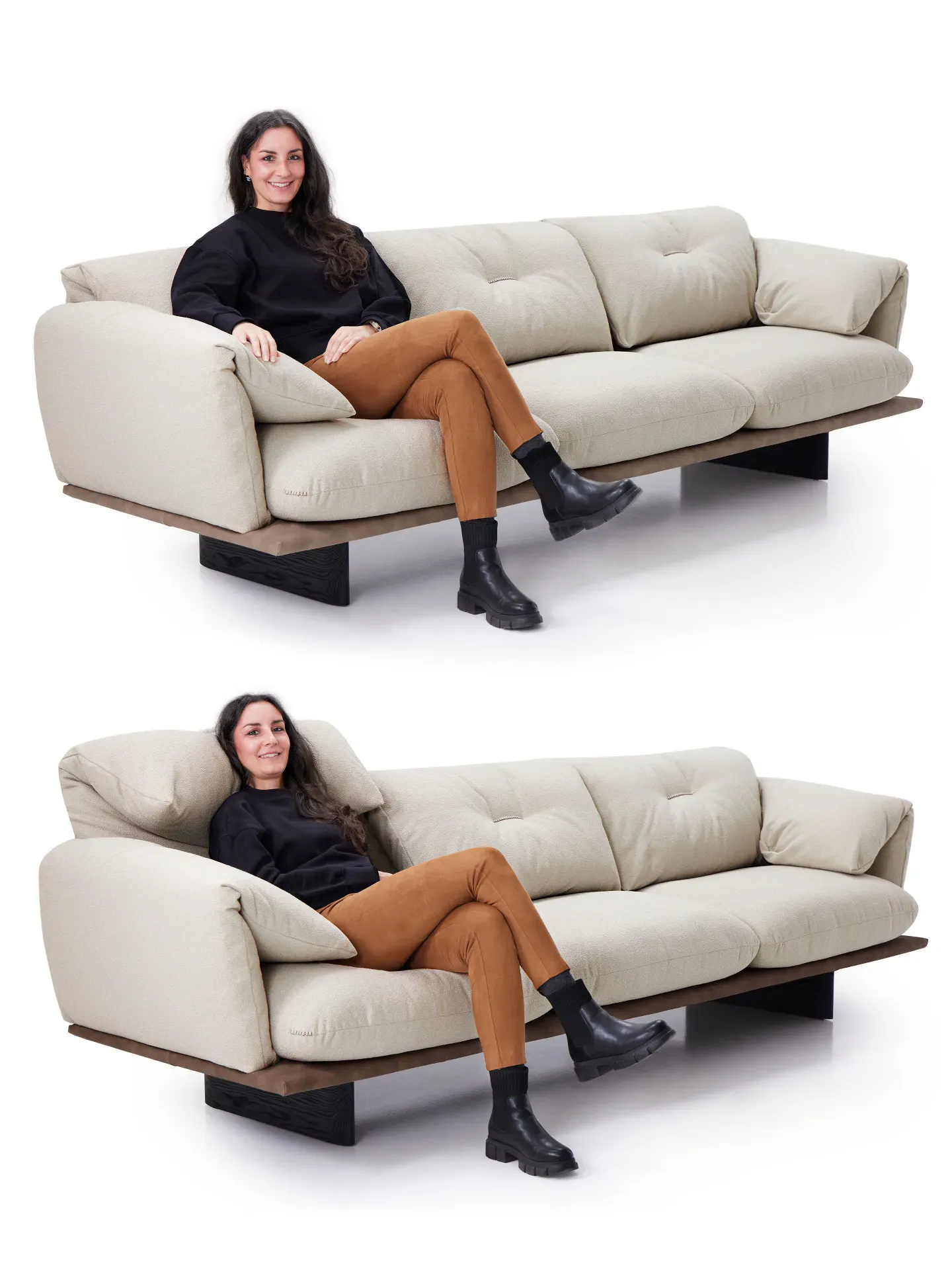 Norman outlet è un divano lineare sorretto da piedini in legno sagomati, espressione di equilibrio e raffinatezza. Proposto in una sofisticata versione bicolore, si distingue per le sue cuscinature morbide ed avvolgenti, rivestite in tessuto mini-bouclè idrorepellente e antimacchia, nella delicata tonalità tortora chiaro. Il rivestimento dialoga armoniosamente con il pianale sottostante, rifinito in similpelle liscia opaca color testa di moro, creando un elegante gioco di contrasti.