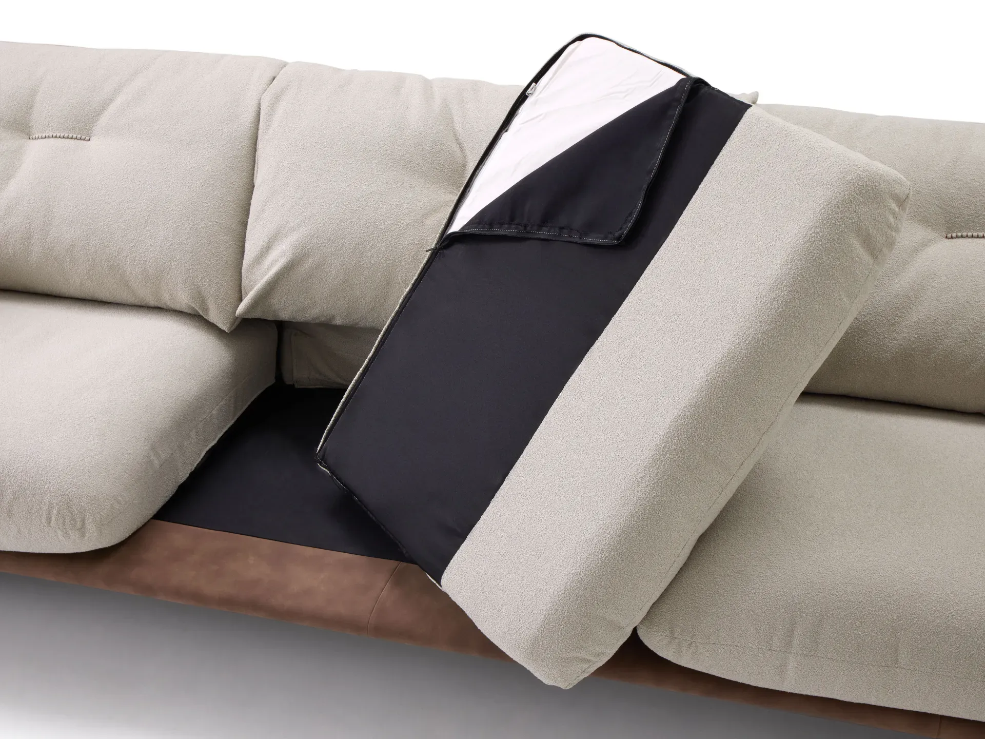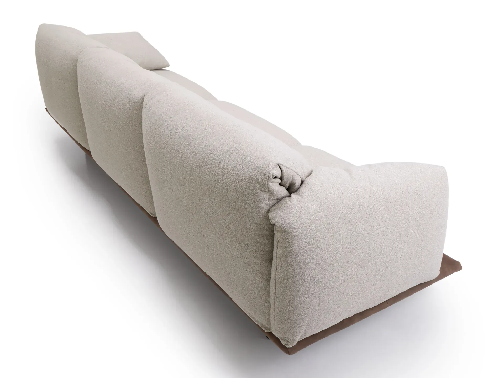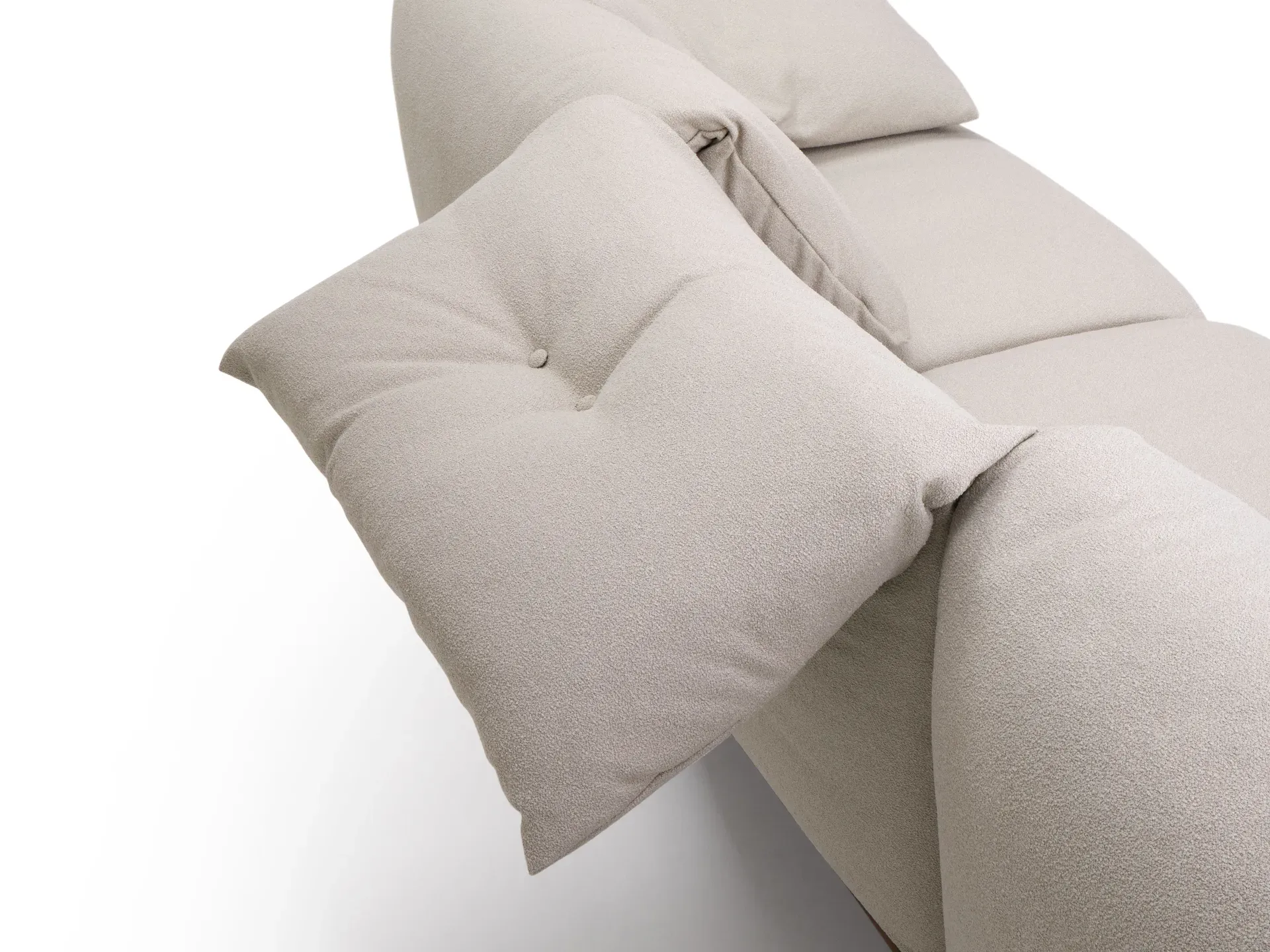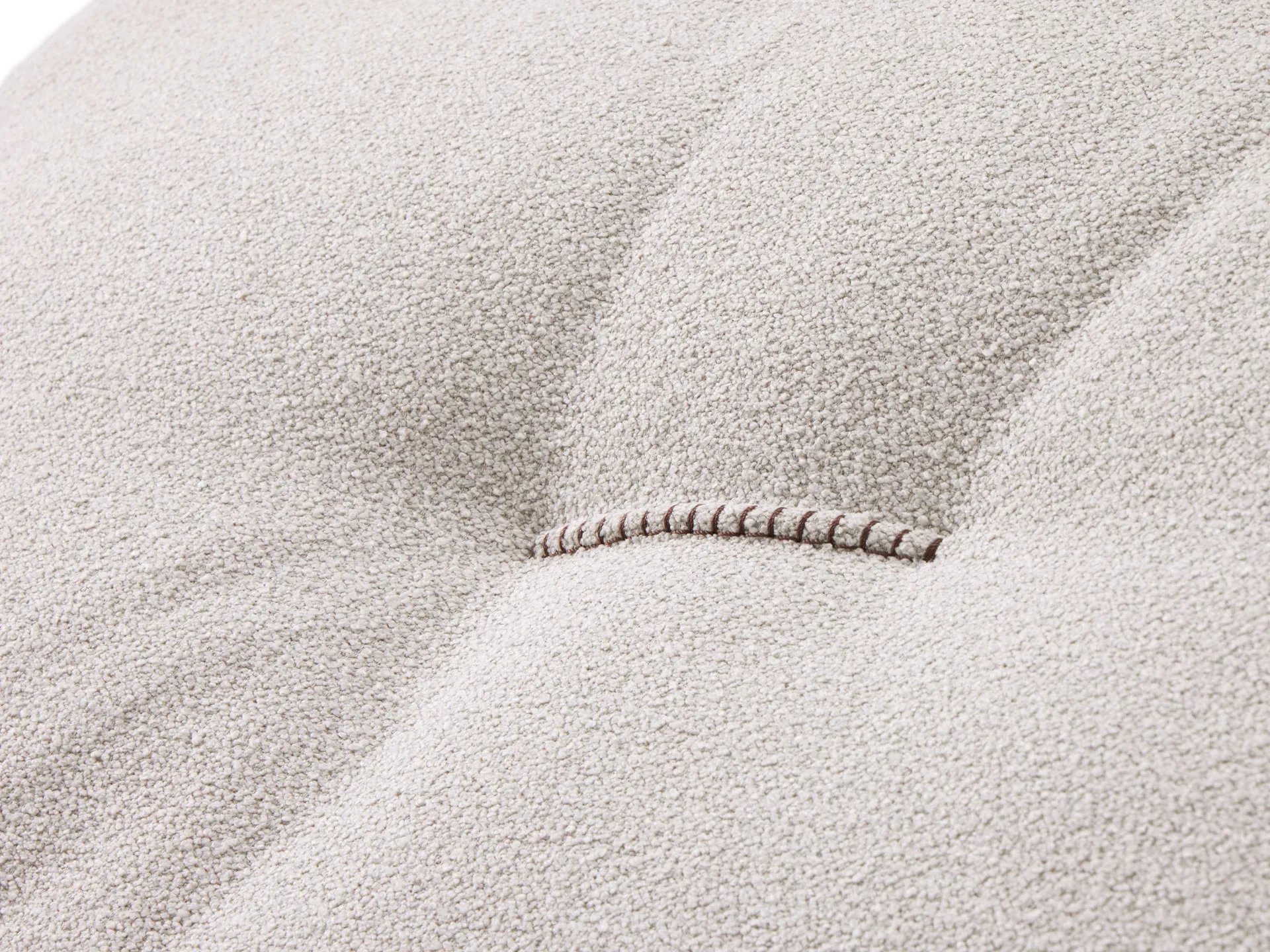 Un ricamo centrale, sottolineato da una leggera tiratura del rivestimento, impreziosisce i cuscini dello schienale. Questo dettaglio discreto dona movimento e carattere all'insieme, senza rinunciare alla sobrietà delle forme.