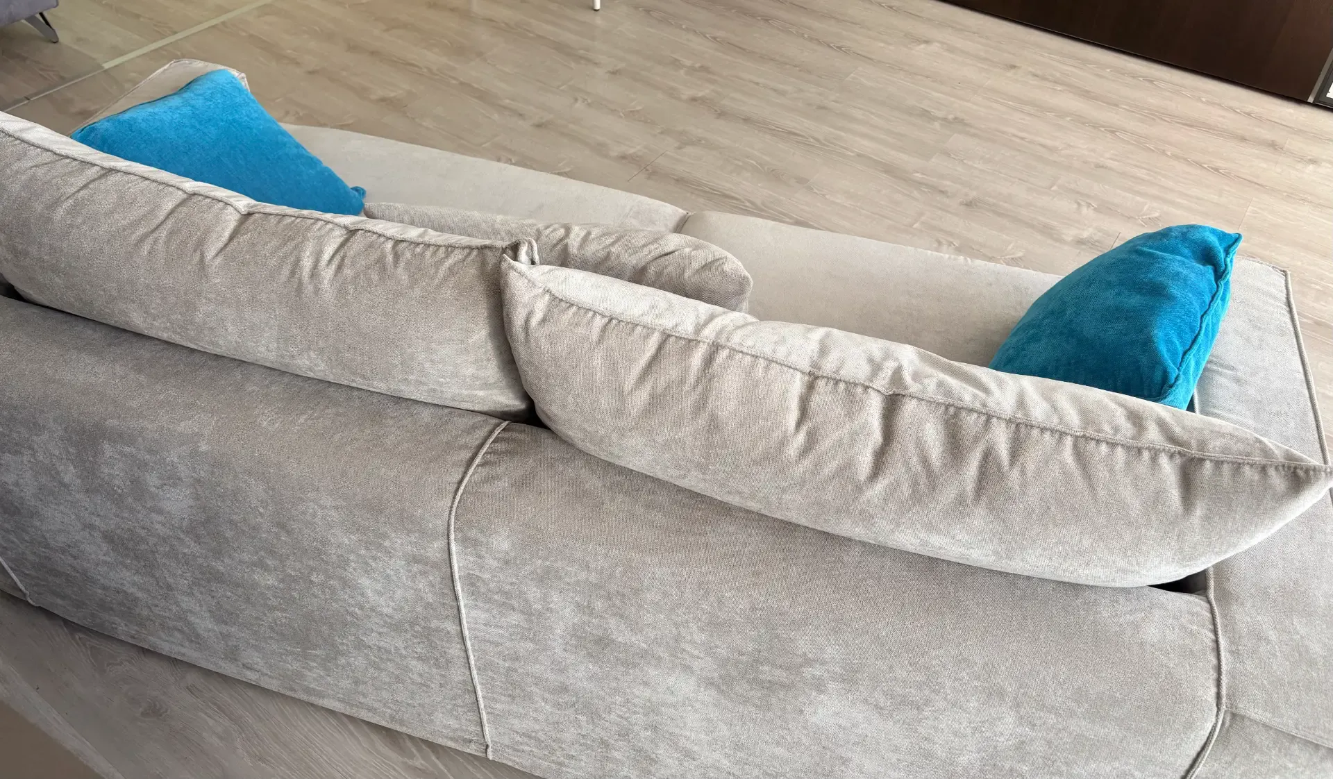 Rivestimento in tessuto morbido grigio completamente sfoderabile, con cuscini accessori compresi.