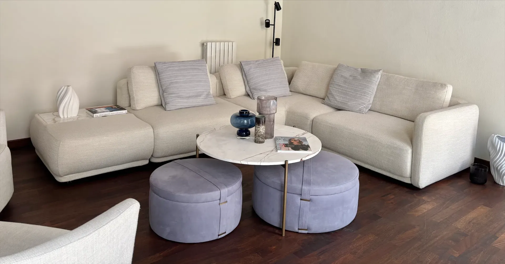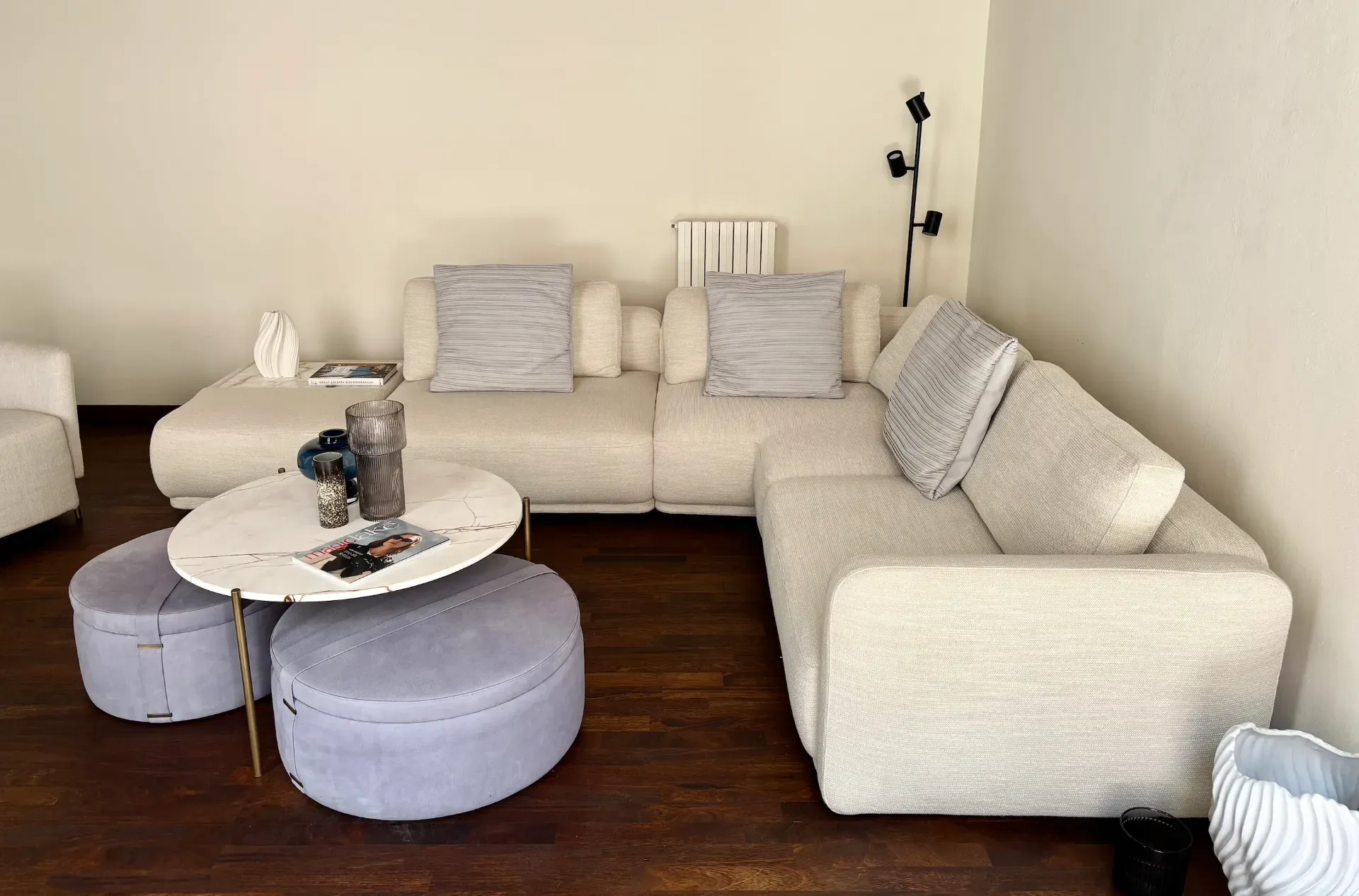 Il divano Kant è completamente modulabile, ideale per adattarsi a ogni spazio. In foto vedete la Composizione 1, con dimensioni 262 x 330 cm. È possibile configurarlo anche in un altra versione, Composizione 2, con dimensioni 372 x 220 cm.