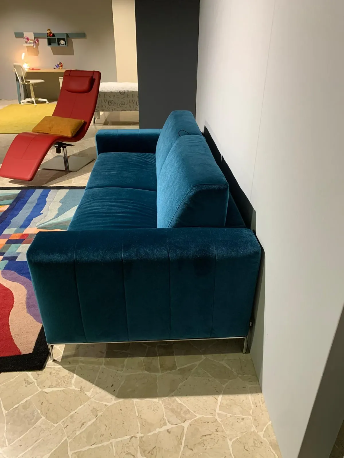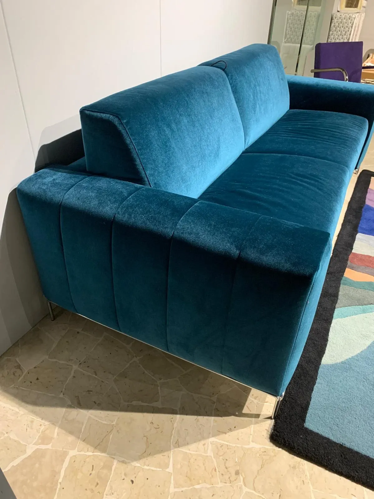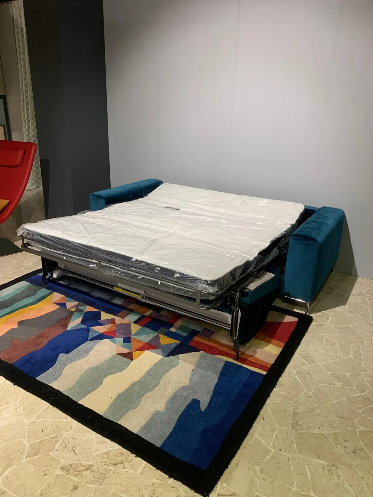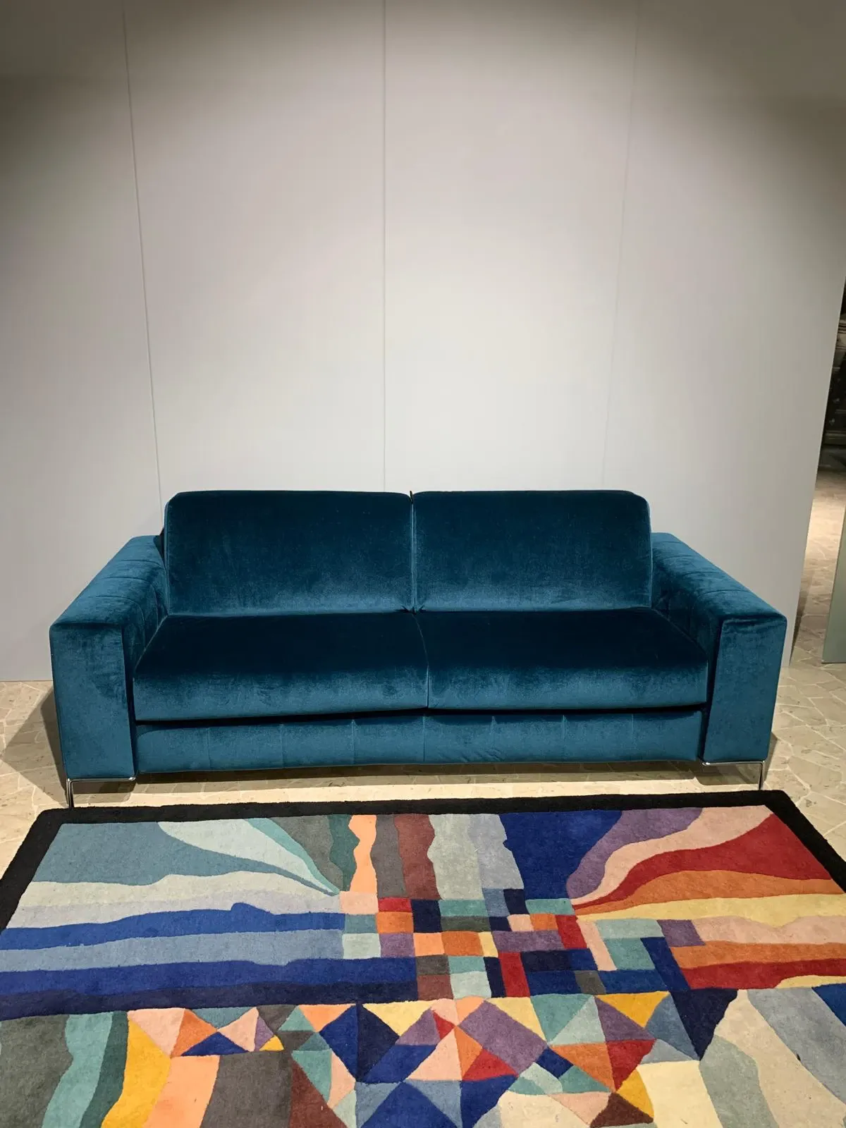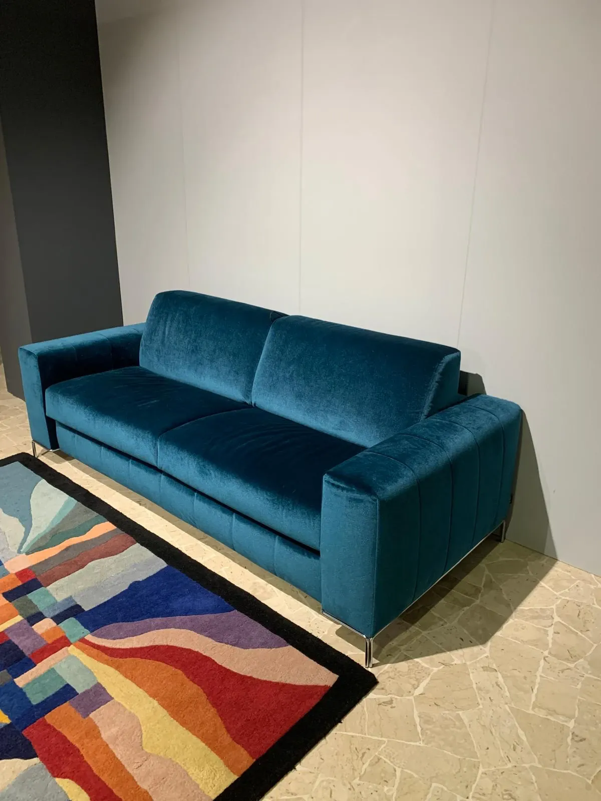 Divano letto con piedini, rivestito in elegante tessuto velluto colore petrolio, piedi cromati