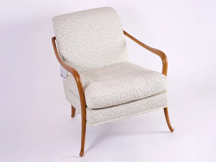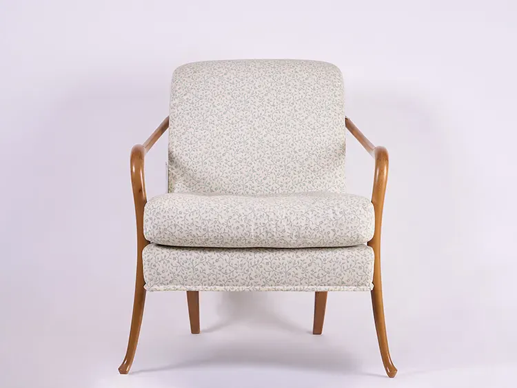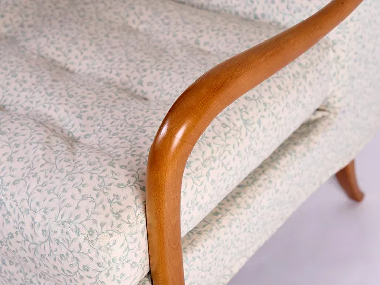 La poltroncina è caratterizzata da un bracciolo in noce curvato e rivestimento in tessuto verde fiorito. Un mix di artigianato e design elegante.