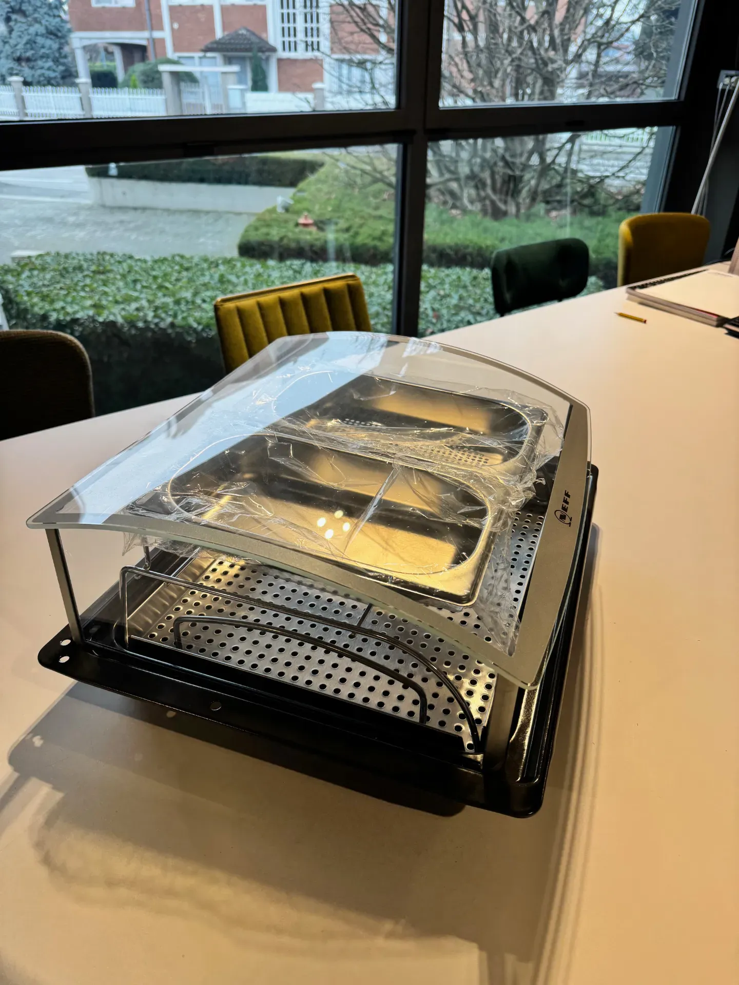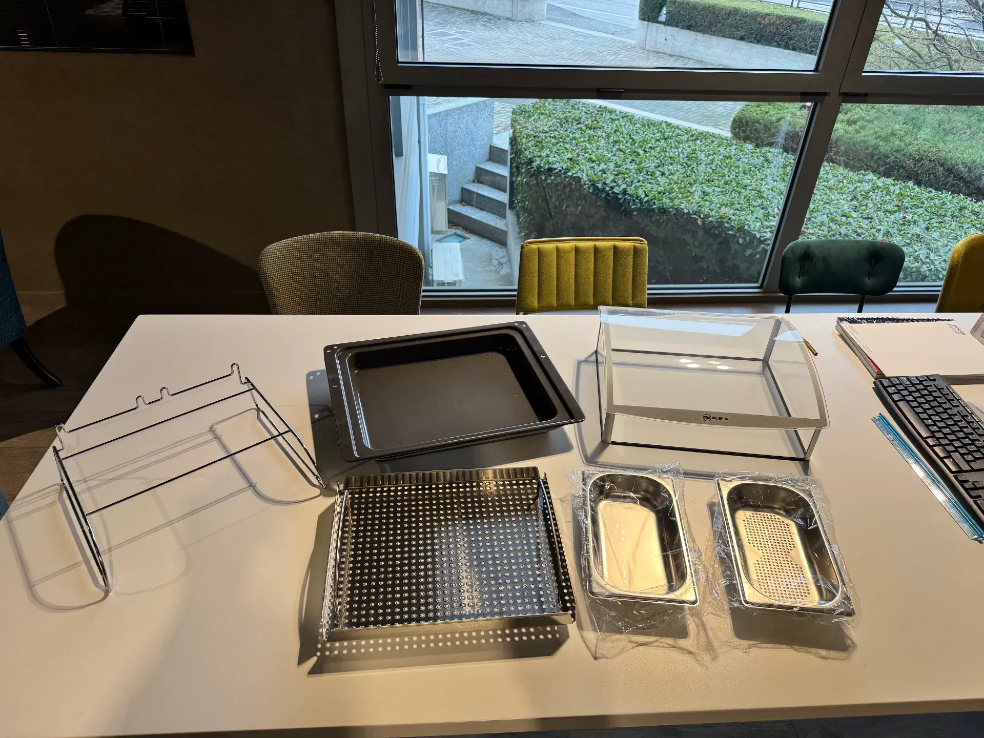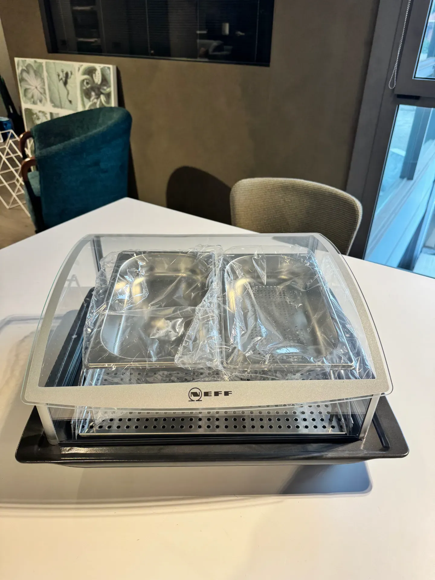 Set cottura a vapore N8642X0EU della Neff in offerta a 95,00 euro. Set completo di teglia in acciaio smaltata colore titanio con base forata al livello inferiore e una struttura a due vaschette in acciaio inox a livello superiore, con coperchio in vetro infrangibile. Misura di larghezza 47, profondità 37 e altezza 18 centimetri, adatto ad un forno di 60 centimetri. Prodotto nuovo mai usato, ancora imballato come da acquisto