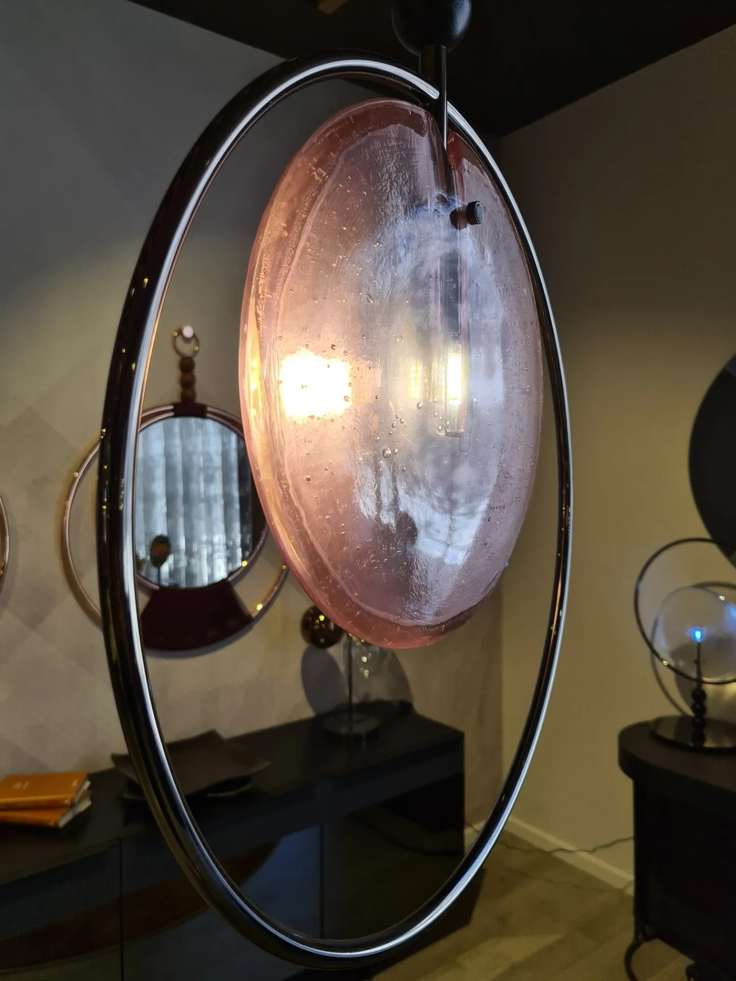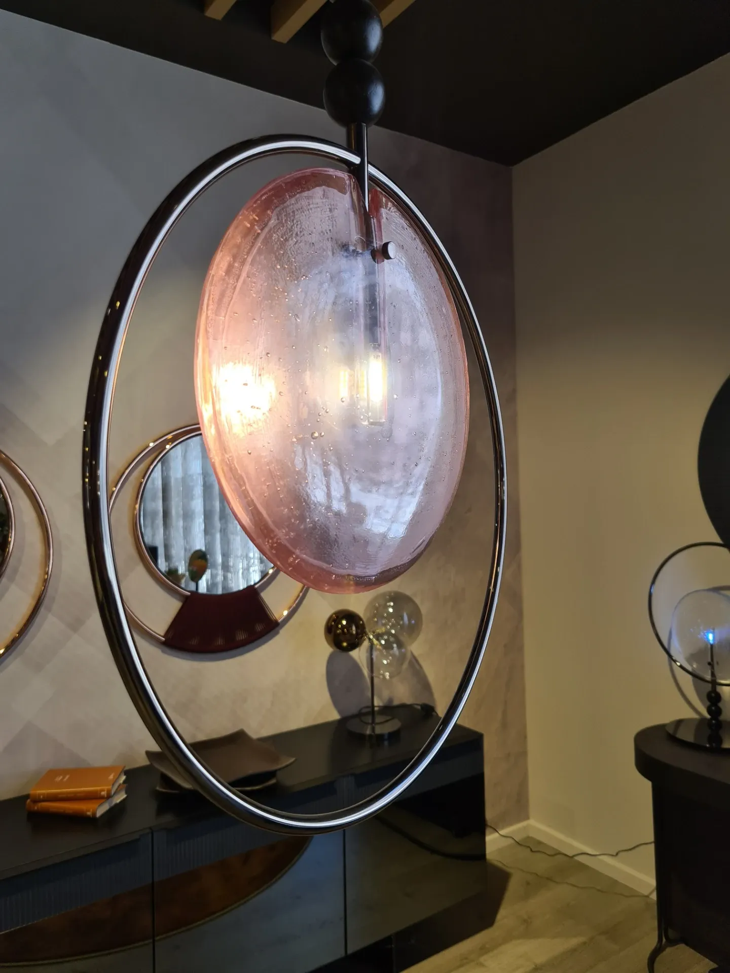 T9113S#06_LAMPADA A SOSPENSIONE MOD. DREAMY 42 H 64 VERSIONE 06 STRUTTURA CROMO NERO; VETRO ROSA TRASPARENTE; TRE SFERE IN ROVERE SCURO