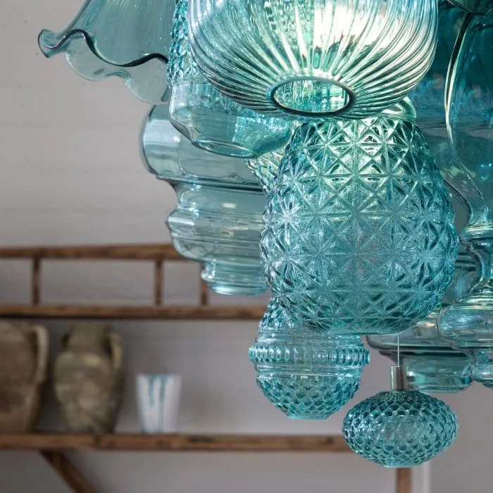 Una reunion di vetri soffiati uno a uno in forme diverse. Molteplici e variegate composizioni possibili. Nuvole informi che la luce penetra e oltrepassa. Infiniti e mutevoli effetti cromatici. La sensazione di essere proiettati oltre le pareti e trovarsi improvvisamente all’aperto sotto un cielo primaverile. A me ricorda il mare. L’acqua turchese, oltre il verde degli ulivi secolari, le pareti bianche calce, la calda pietra dorata e le terre rosse. A me ricorda il cielo.