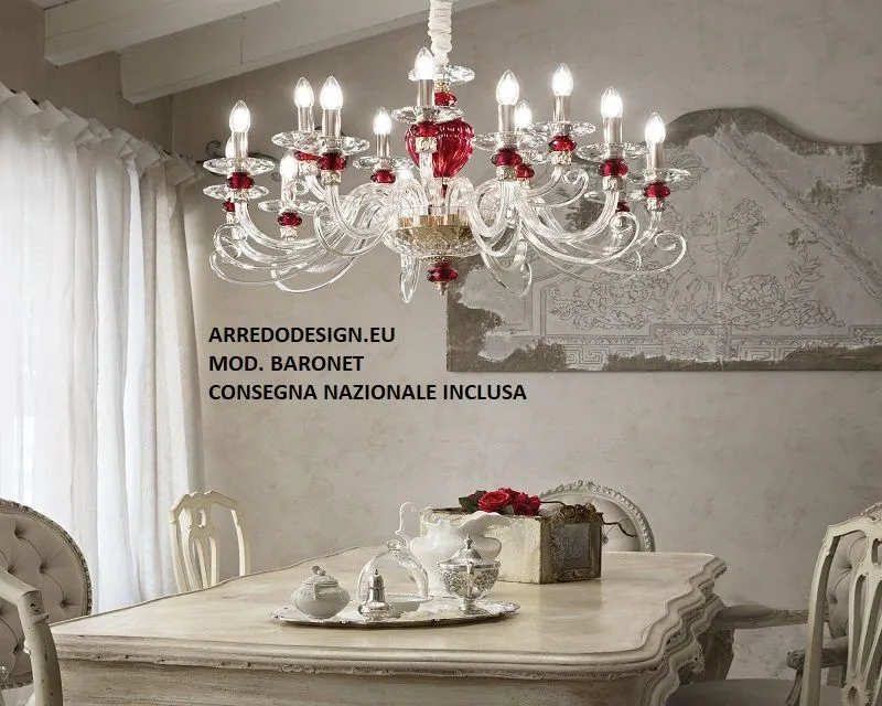 ARREDO DESIGN srls, propone il Lampadario classico Ideal Lux modello Baronet da 14 luci diametro CM 88. montatura in metallo dorato Impreziosito da decori in vetro soffiato in abbinamento al cristallo molato e finiture colorate. Il suo design porta alla mente lo charme dei lampadari veneziani. Il cavo di sospensione ่ rivestito di velluto. Questo lampadario in vetro soffiato ่ perfetto per illuminare un soggiorno classico o per dare un tocco classico ad un ambiente moderno. Disponibile anche a 5 luci diametro cm 60 430,00 Consegna inclusa in tutta Italia