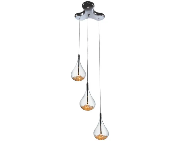 Lampada a sospensione , gocce in vetro trasparente con cristalli colorati trasparenti rosa-oro, cavo con lunghezza regolabile in metallo,rosone in metallo cromato.