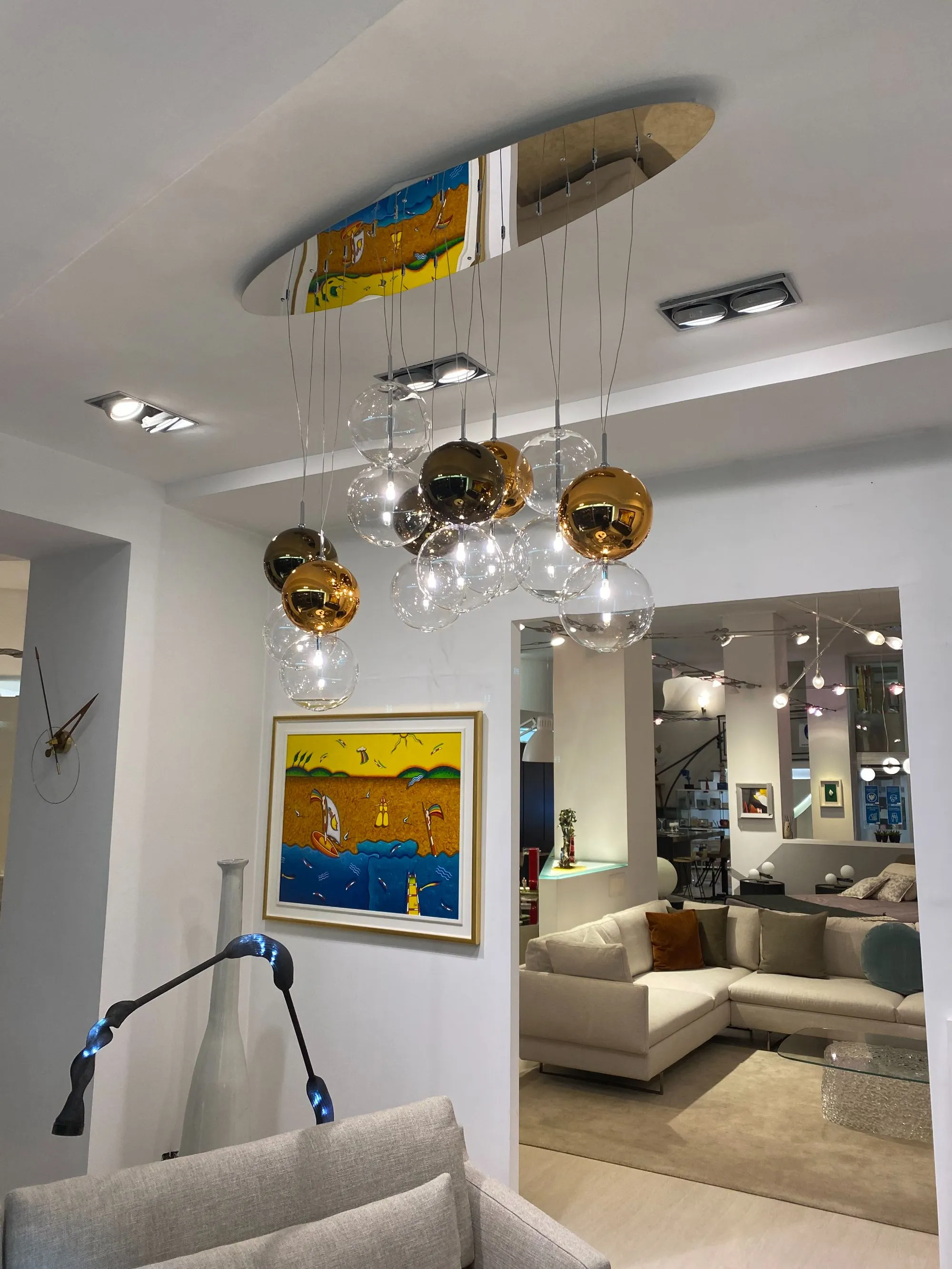 Lampada a soffitto con paralume composto da 2 sfere in vetro borosilicato. Sfera inferiore in vetro trasparente e sfera superiore verniciata bronzo. Attacco a soffitto in acciaio inox. Lampadina inclusa. Dimmerabile con lampadina idonea (non inclusa) e multidimmer (non incluso). Il prezzo č da intendersi come da composizione delle foto.