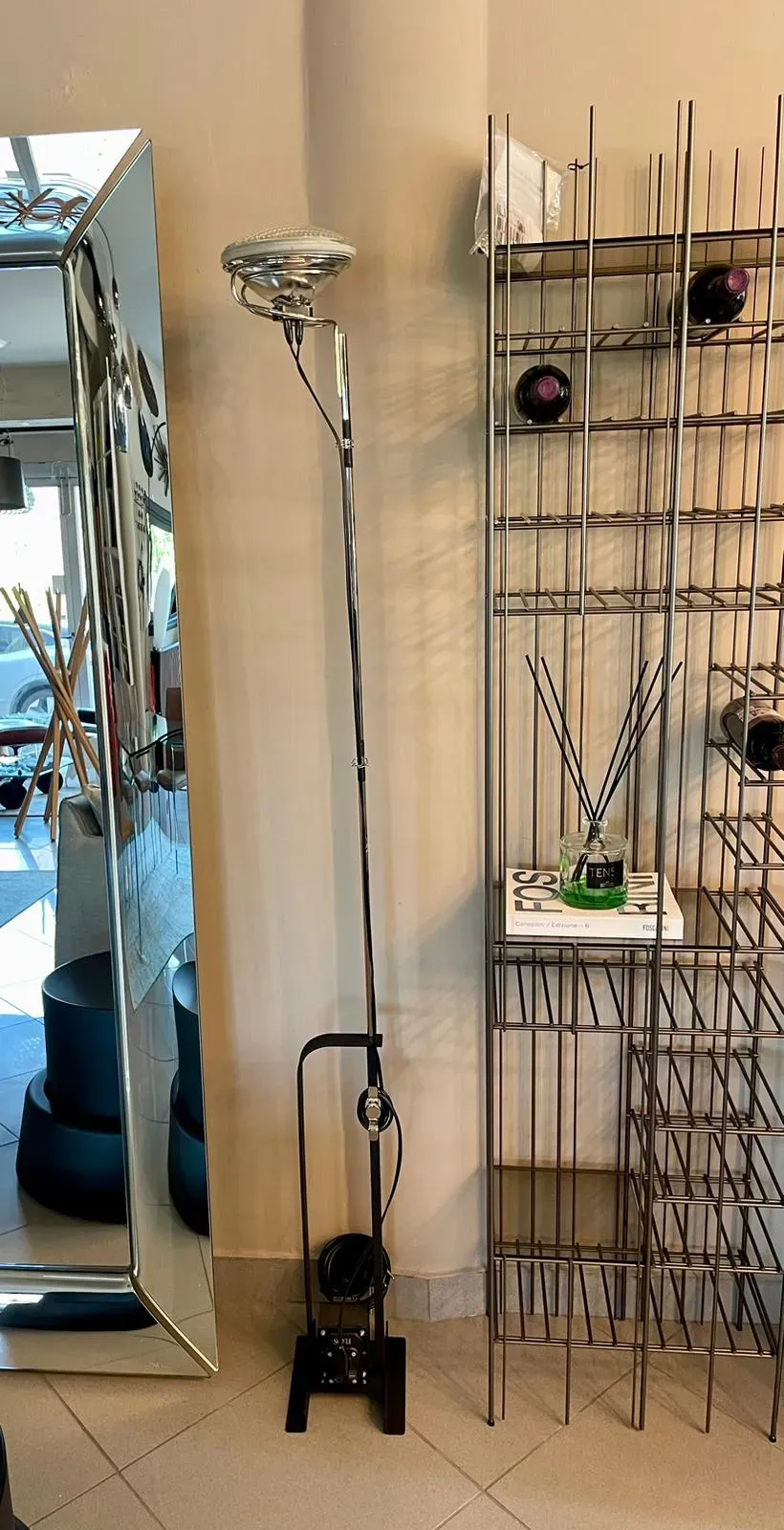 Lampada da terra a luce indiretta. Base di acciaio tranciato e piegato e struttura in profilati d'acciaio, entrambi verniciati a liquido, nei vari colori. Stelo con sezione esagonale in ottone nichelato. Il movimento telescopico dell'asta consente la regolazione dell'altezza dell'apparecchio.