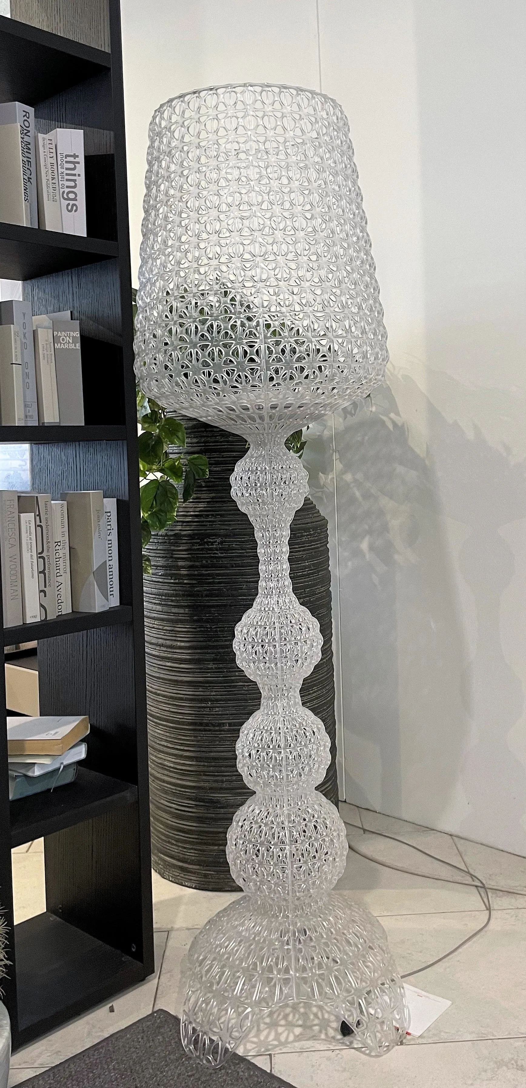 Kartell lampada Kabuki indoor design Ferruccio Laviani. La lampada a piantana Kabuki ่ realizzata ad iniezione che consente di avere una struttura a trama che riproduce il pizzo con una particolare superficie traforata da cui si diffonde la luce. Disponibile nelle versioni indoor e outdoor. Altezza 166 cm.