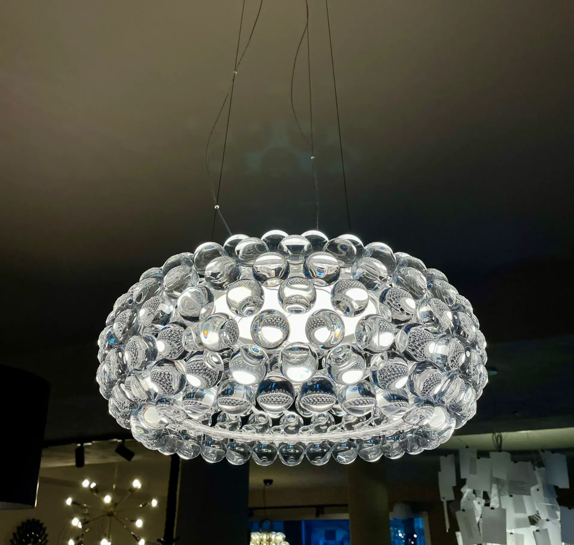Le lampade Caboche trasformano la luce in una scintillante composizione di sfere trasparenti: un gioiello di design che nasce da una sintesi di tecnologia e creatività. Caboche Plus media led. Dimensioni diam. 50 cm x h 20 cm.