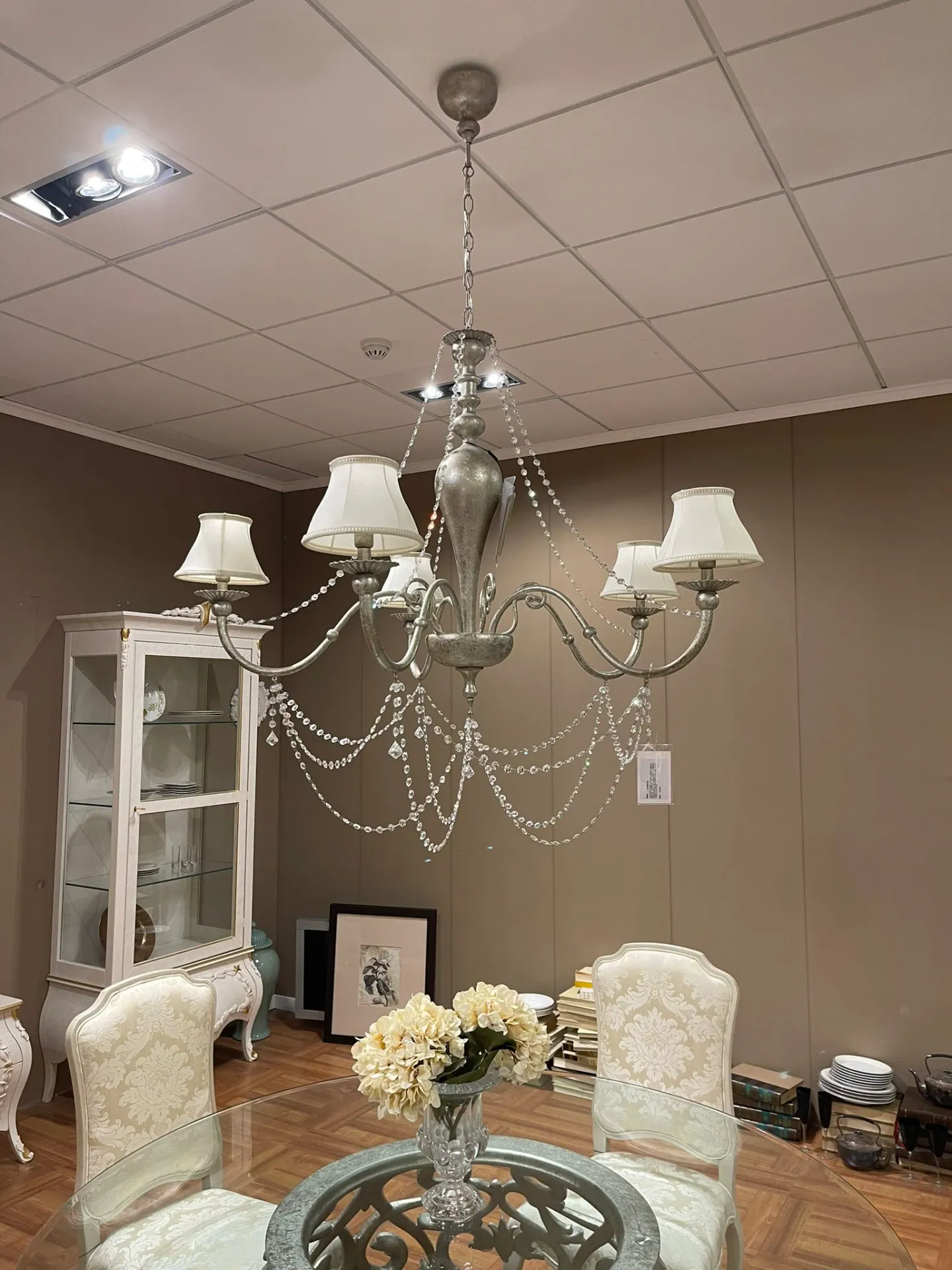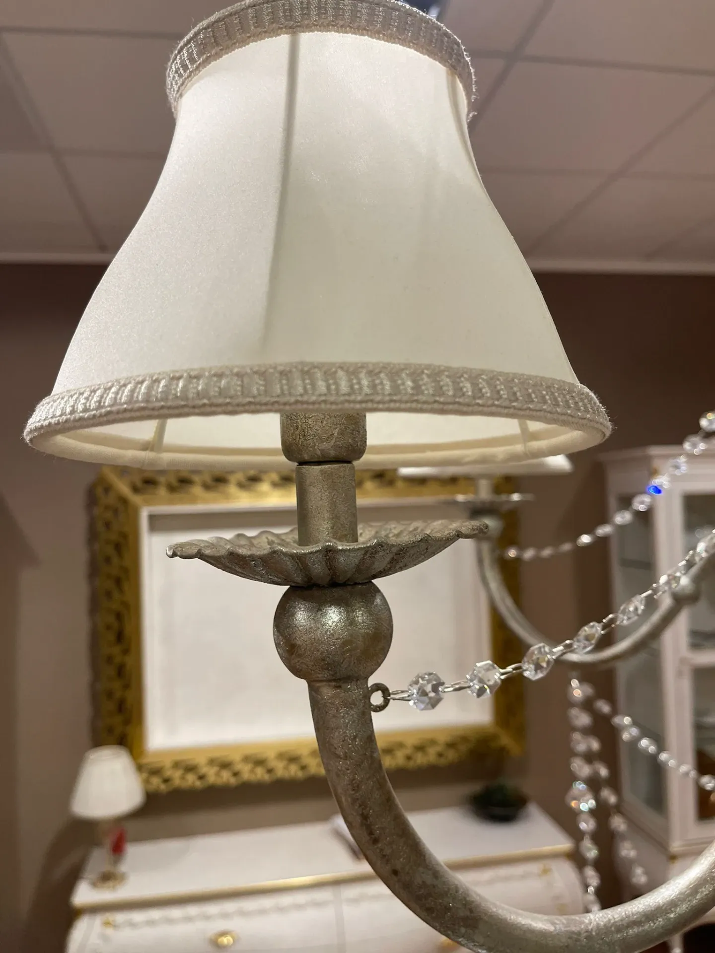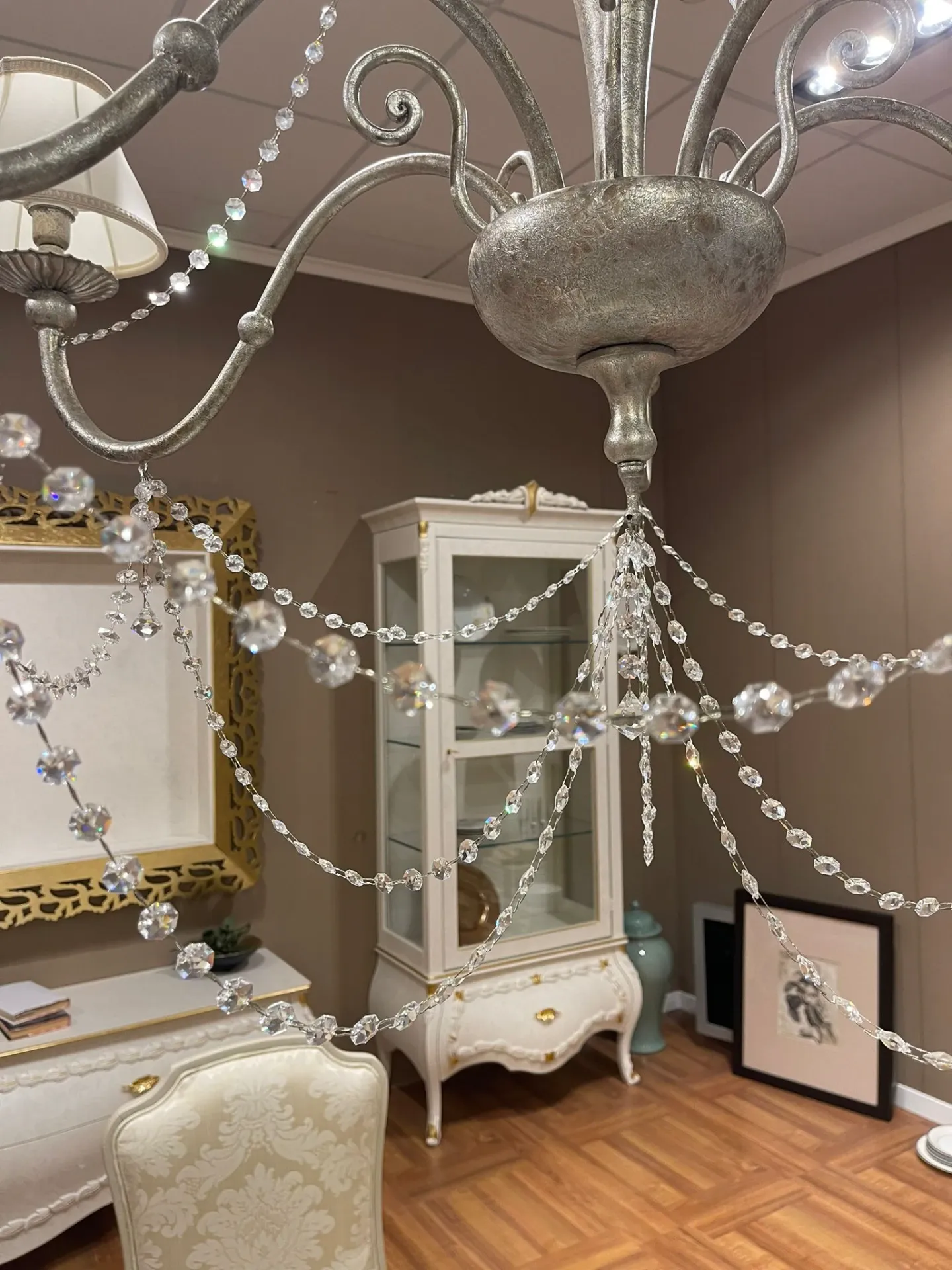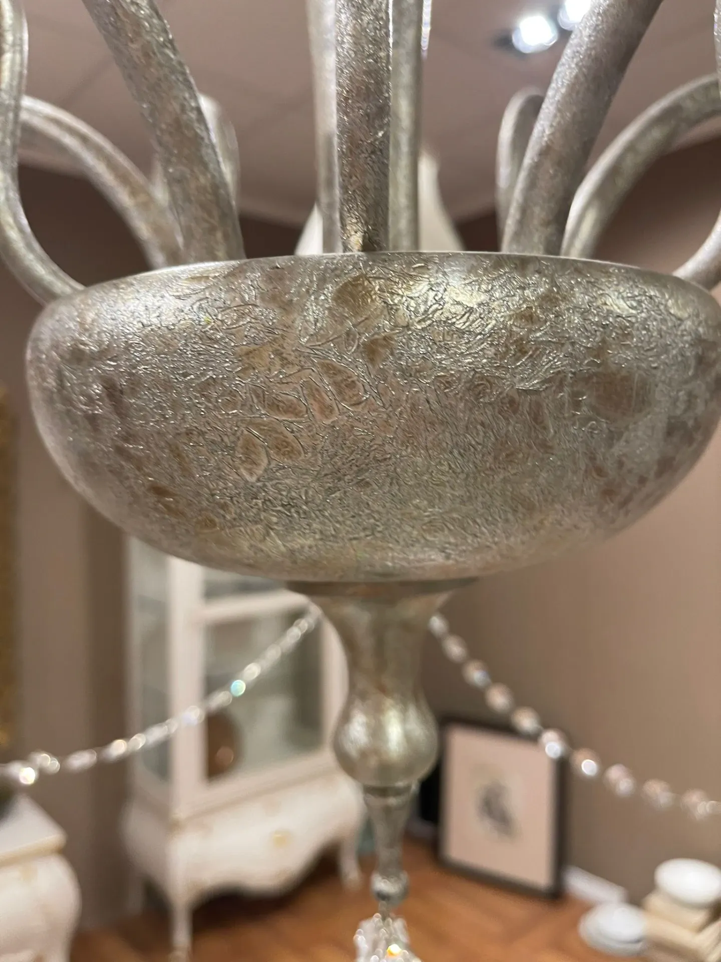518-C-C_LAMPADARIO OPERA’ Ø CM 110 H. CM 90IN LEGNO E METALLO LAVORATO C46 FOGLIA ARGENTO TORTORA CON 5 LUCI, CON PENDENTI SWAROVSKI CRYSTAL E PARALUMI IN TESSUTO PONGE COL.41C - PORTATA MAX 60 W