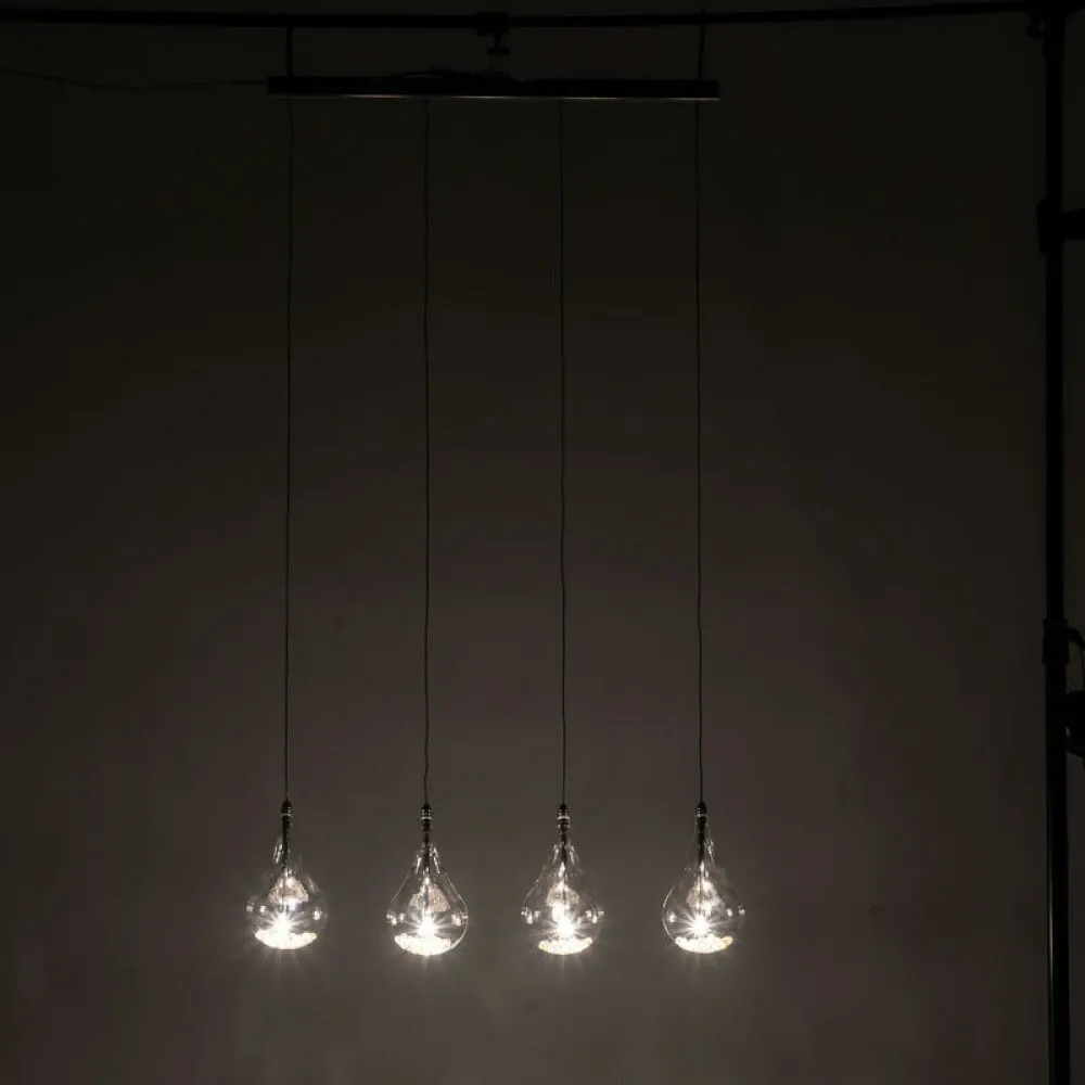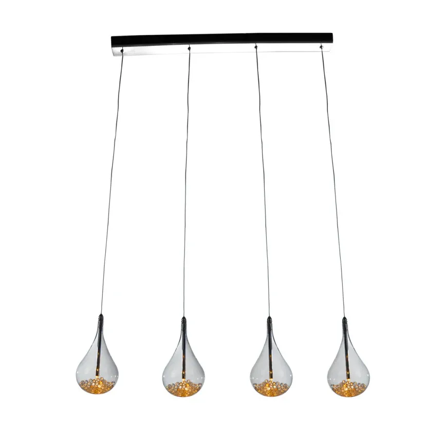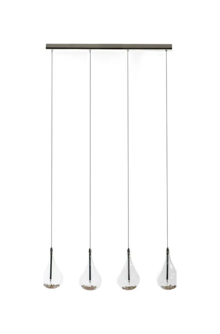 Realizzato in metallo cromato, questo lampadario a sospensione si distingue per la sua struttura lineare e contemporanea, arricchita da quattro diffusori in vetro borosilicato trasparente.