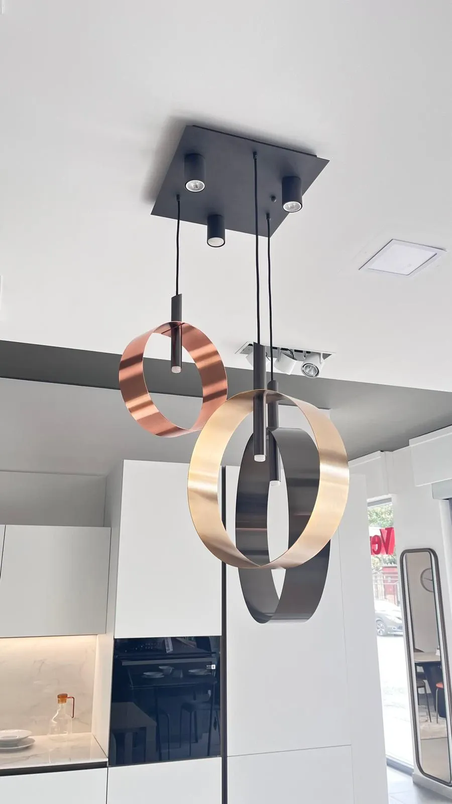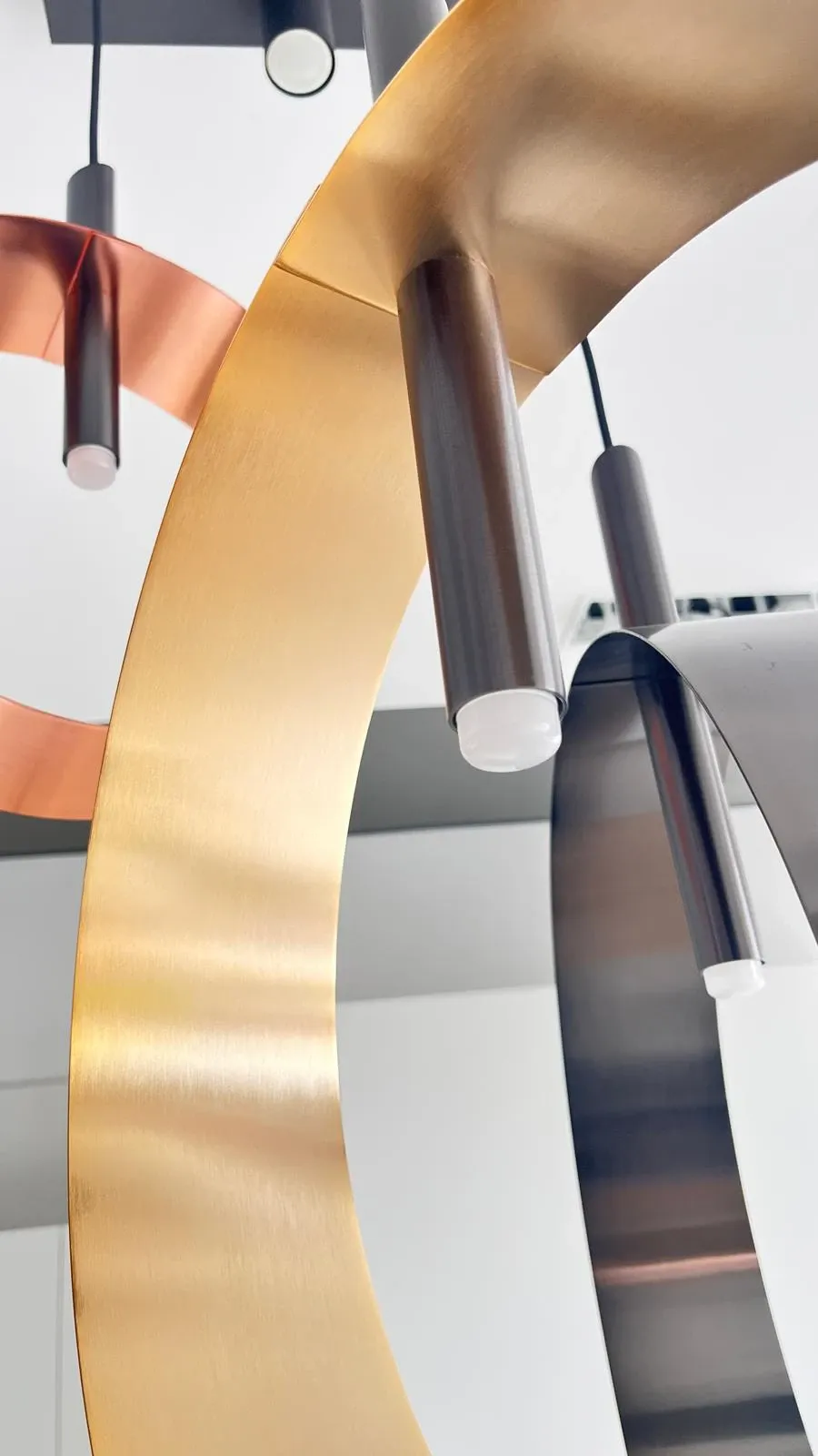 LAMPADA SOSPESA A SOFFITTO RIFLESSI MODELLO LED LOOP S3 CON ROSONE QUADRATO E 3 ANELLI IN FINITURE RAME SATINATO,ORO SATINATO,NERO SATINATO. MISURE in cm L 40 X H fino a 170. led 3000k 820 lumen