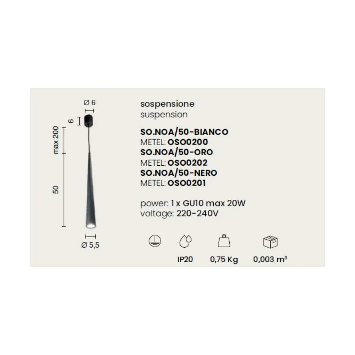Noa 50 di Ondaluce è una sospensione conica dal design semplice ed estremamente versatile. Ideale per una luce focalizzata e diretta su un piano specifico, un tavolo, isola in cucina, ma è perfetta anche in ambienti commerciali, come ristoranti, bar, alberghi e tanto altro. Disponibili nelle finiture oro opaco o nero opaco. Cavo regolabile in altezza.