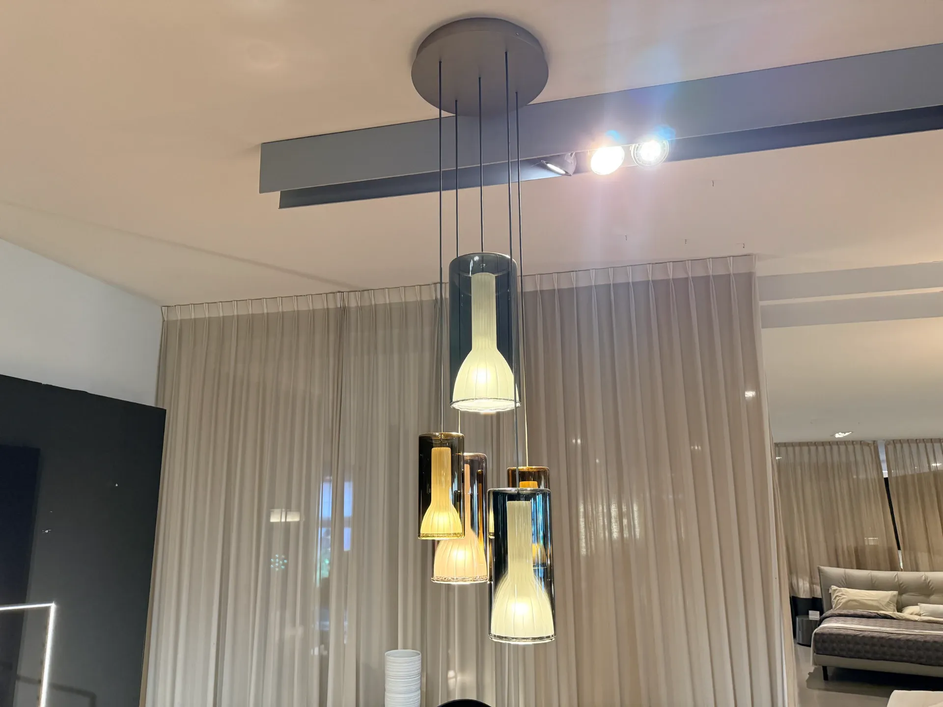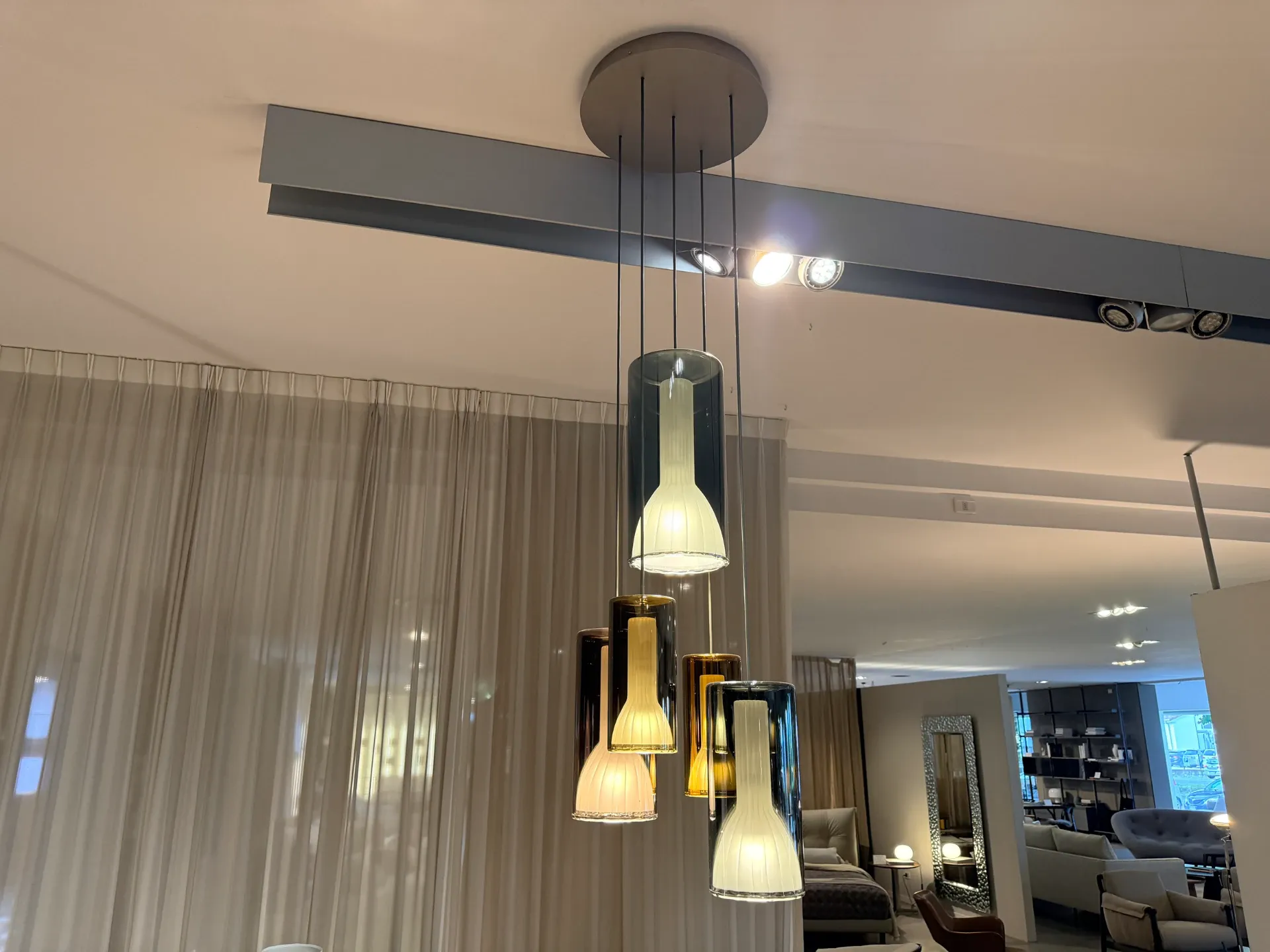 Il lampadario è composto da una varietà di lampade: una Lit Large blu, due Lit Medium (una blu e una viola) e due Lit Small (una oro e una arancio).
