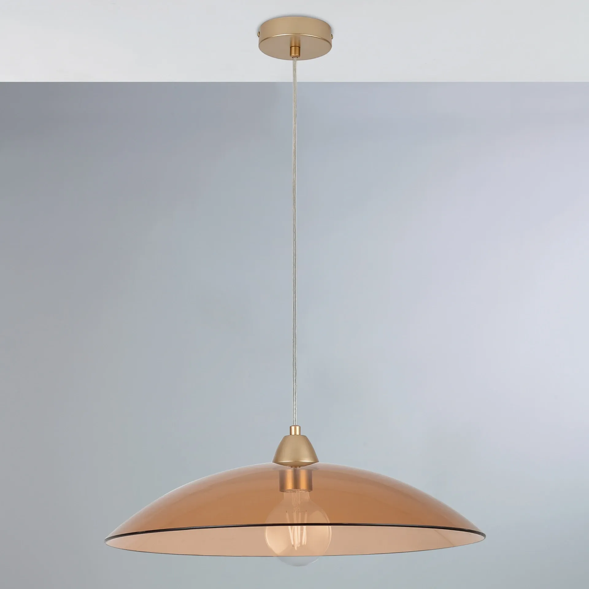 L'illuminazione è complemento d'arredo di grande impatto decorativo anche grazie alle tonalità delle finiture con cui le lampade sono state costruite: se non vuoi ricreare un'ambientazione eccessivamente vivace, ma allo stesso tempo non vuoi rinunciare a un tocco di colore, il brand propone diverse proposte abbellite da qualche dettaglio colorato ma armonioso; la lampada qui presente è di colore ambra e si dimostrerà in grado di conquistare la scena in modo brioso ma equilibrato.