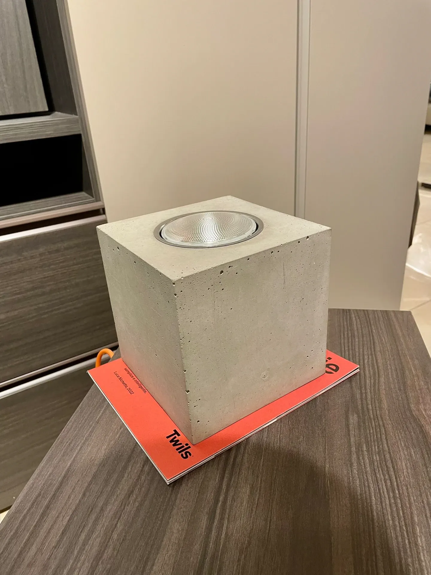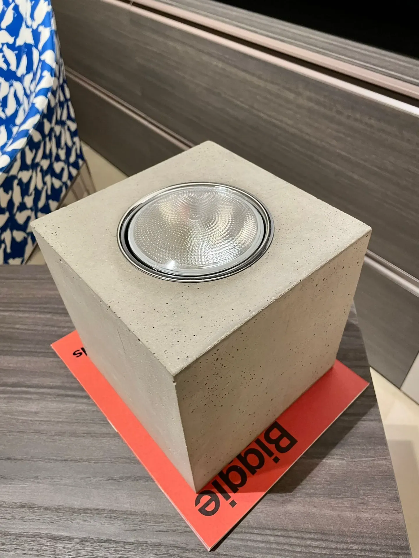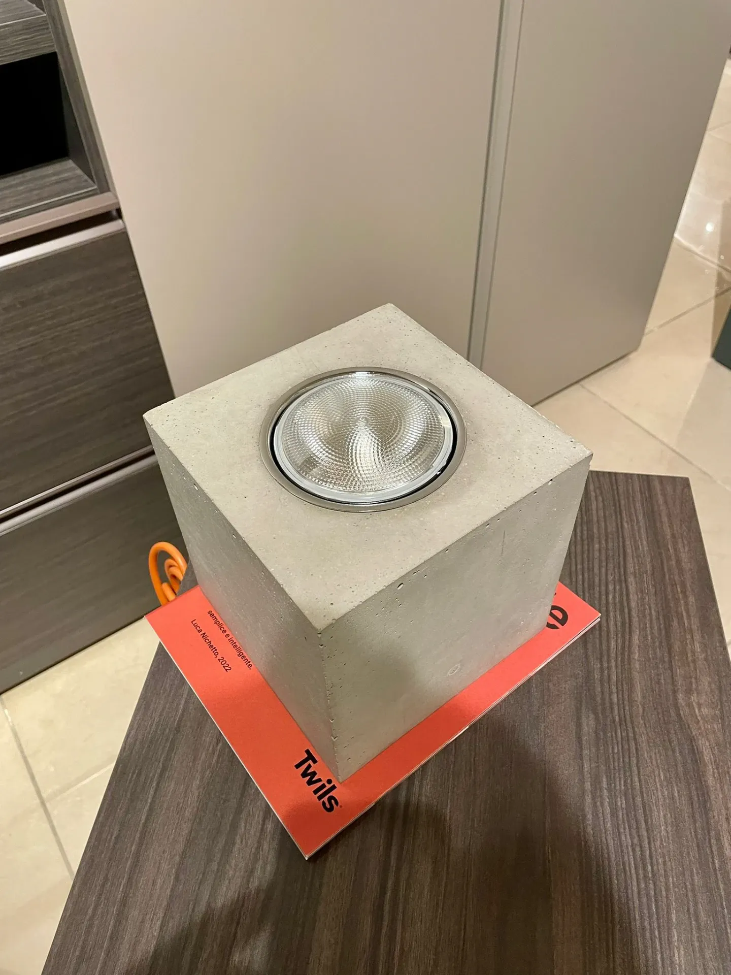Q è una lampada da terra realizzata in metallo, cemento e vetro.