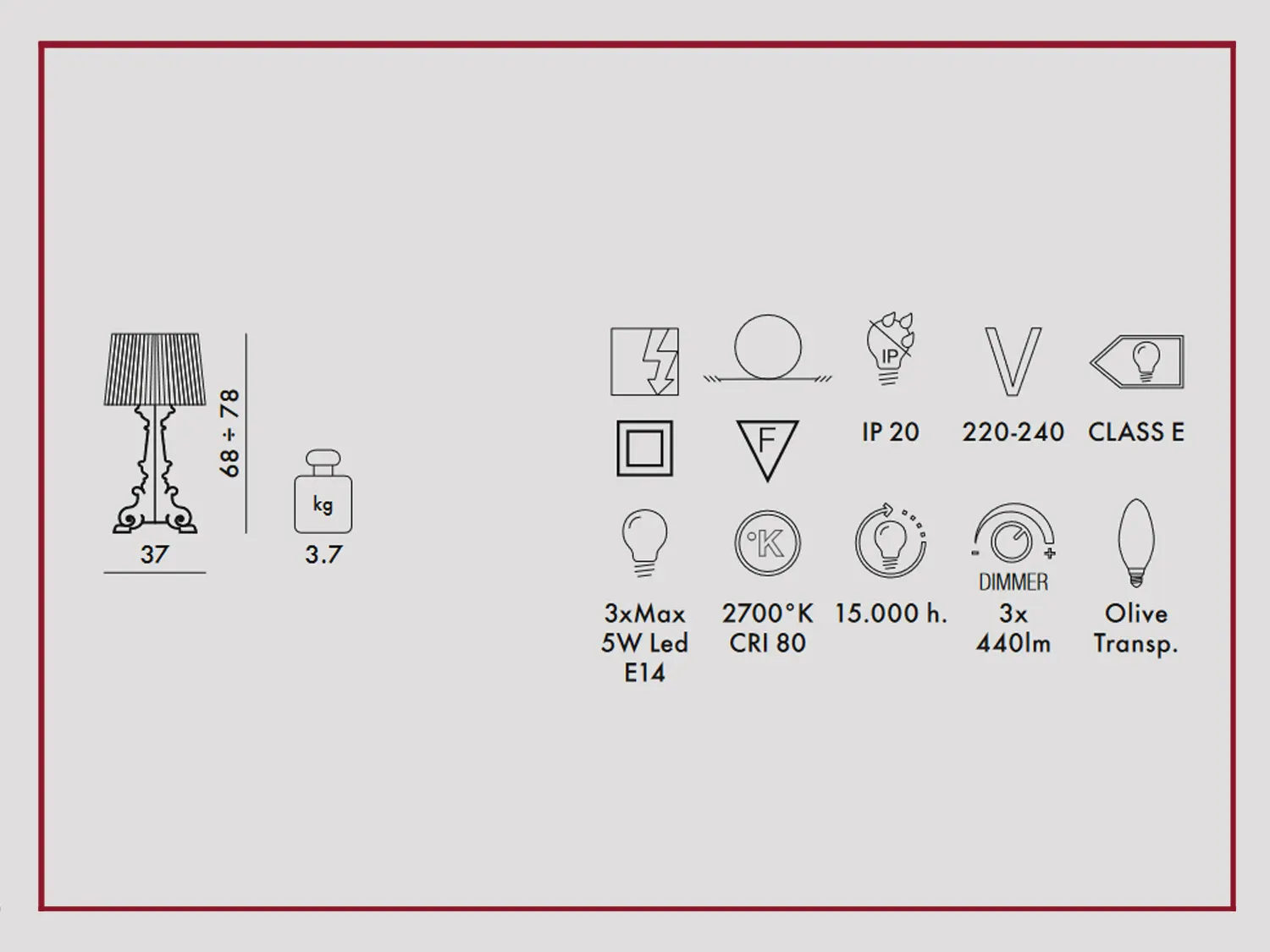 Le svariate proposte di illuminazione del brand sono disponibili in un'ampia gamma di materiali e texture; il modello qui presente, ad esempio, è costruito in plastica, materiale pensato per rispondere alle più svariate richieste funzionali, garantendoti di completare esteticamente la tua abitazione. Le zone della casa, dalla cucina alla camera da letto, dal giardino alla stanza da bagno, si distinguono profondamente tra di loro: non per altro è davvero importante l'acquisto degli arredi, tra cui c'è anche l'illuminazione; ogni ambiente richiede mobili che siano stati studiati appositamente, ad esempio questa lampada è pensata per gli da interni. In una casa di tutto rispetto, anche le lampade devono seguire una peculiare coerenza di stile: presentiamo in Offerta Outlet il modello di illuminazione Bourgiemania limited edition del brand, ideale per completare ottimamente un luogo in stile moderno; design unico e materiali pregiati che resistano negli anni rendono questa lampada una soluzione arredativa dall'estetica raffinata. Per questa soluzione con la Da tavolo Bourgiemania limited edition è bene prendere in considerazione anche il prezzo della consegna trasporto escluso per questa proposta. Gli ambienti domestici sono sempre differenti l'uno dall'altro, sia per quanto concerne la funzione e lo stile, sia per quanto concerne le misure e la disposizione degli arredi; per questo esiste una gamma praticamente infinita di svariate tipologie di illuminazione, dalle lampade da terra a quelle a parete: ecco a te a prezzo scontato il modello di da tavolo Bourgiemania limited edition Kartell.