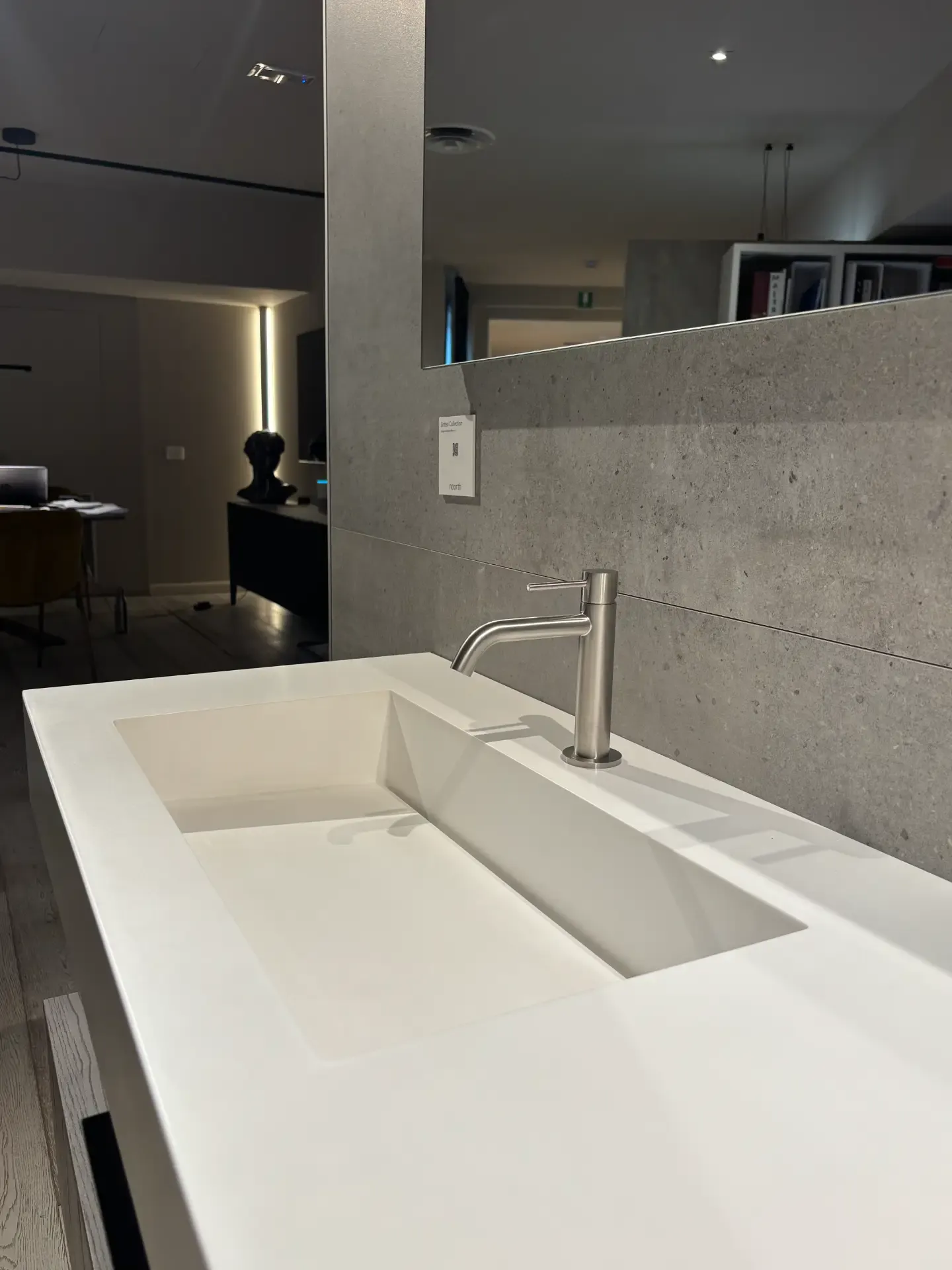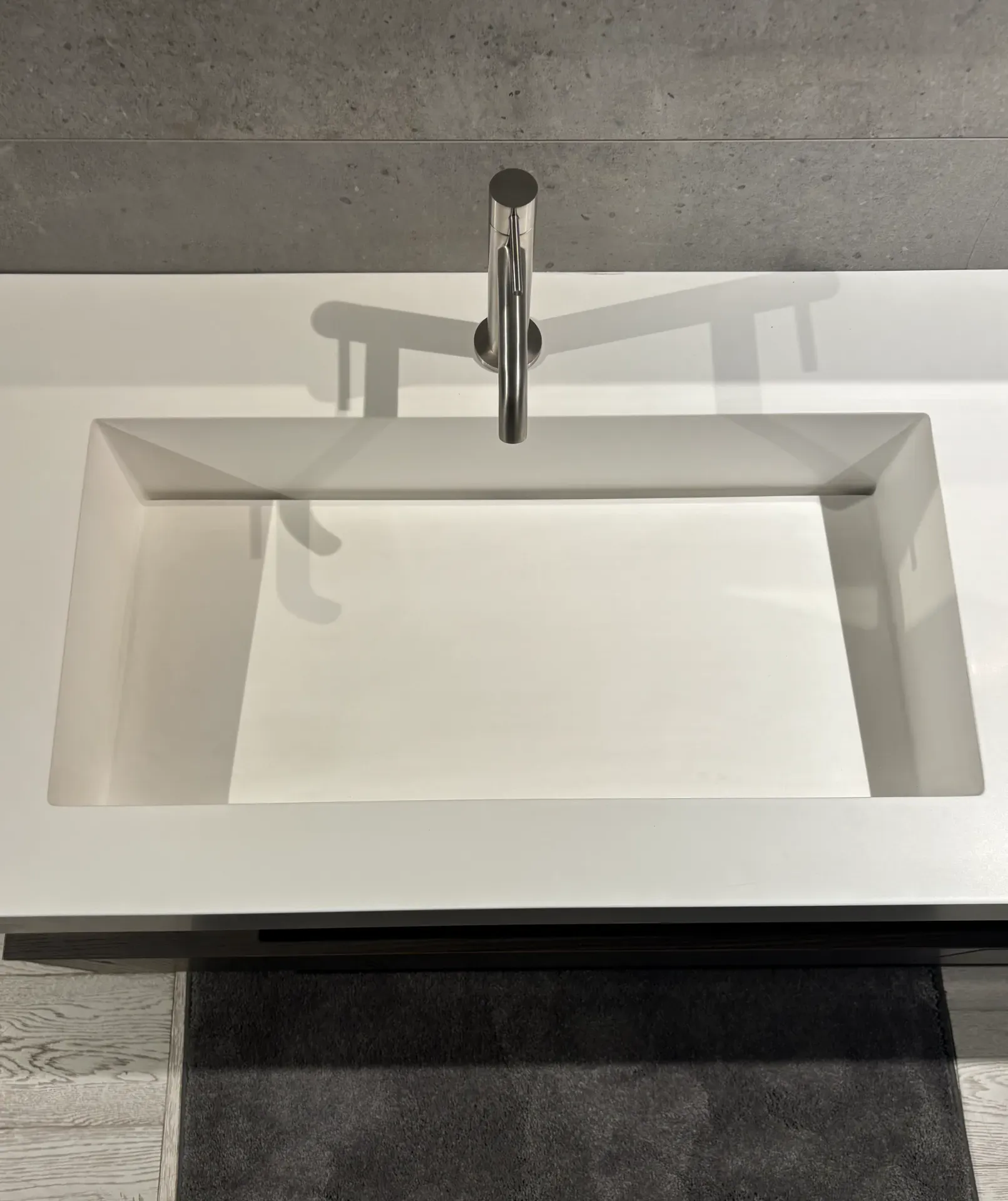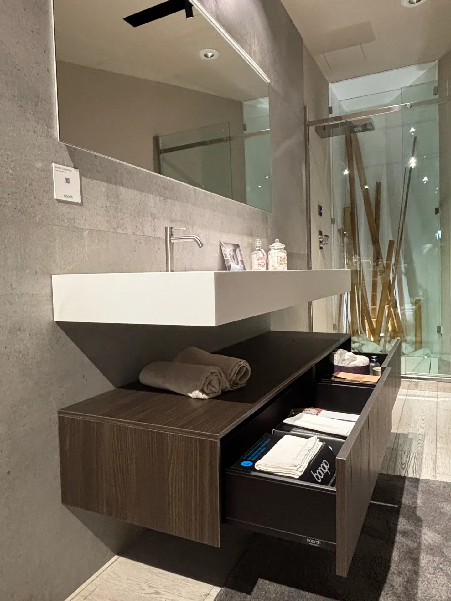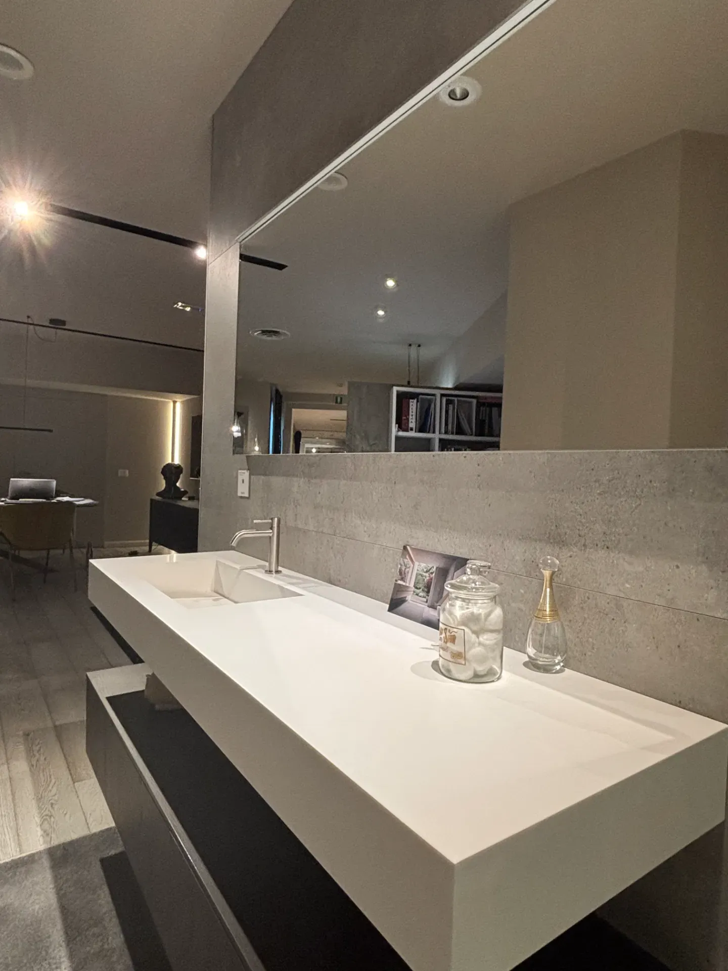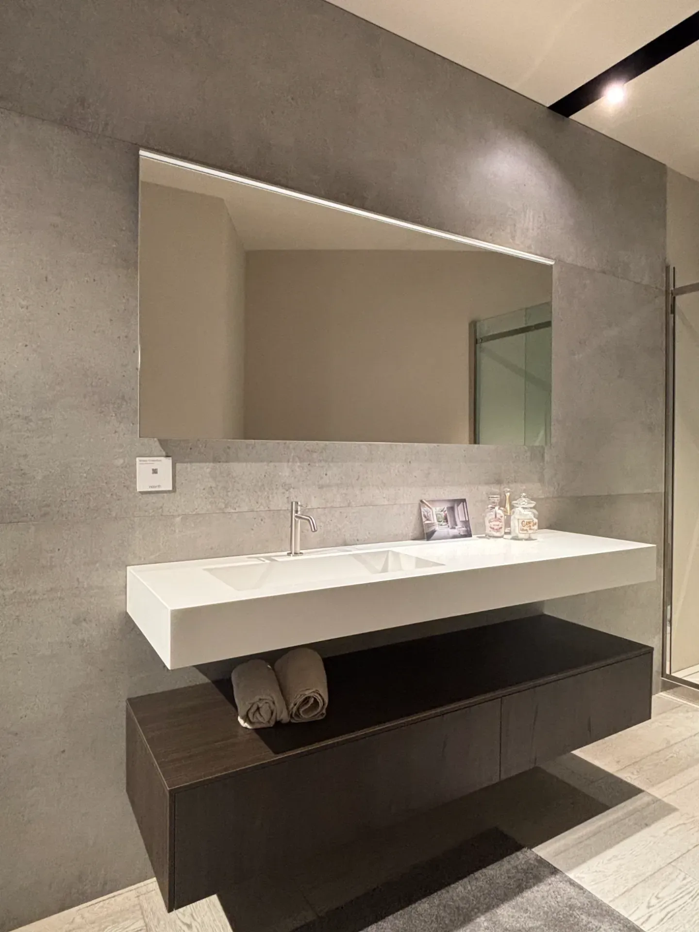 Mobile bagno Milldue modello Sintesi sospeso con cassettoni laminato moro, con apertura a pressione e top di finitura. Consolle sospesa di 12 cm con vasca integrata Miltech opaco bianco. Specchiera con retro illuminazione e barra led orizzontale per illuminazione.