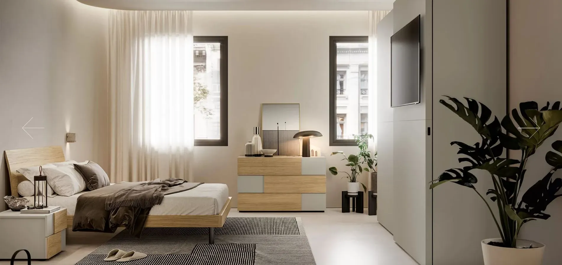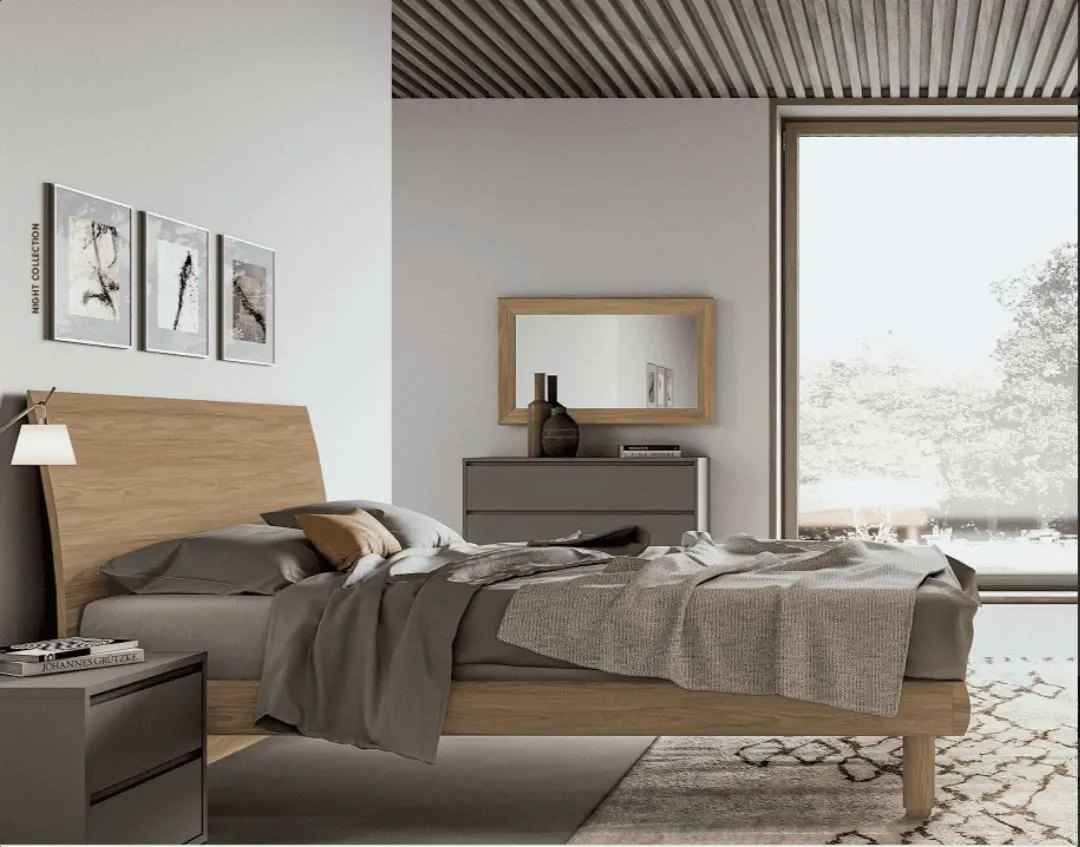 Il progetto è semplice ma non banale: testiera con pannello che si incurva leggermente verso il retro, solido e visivamente presente, tutto in essenza o colore eco. Nessun dettaglio che divide, nessuna scelta che polarizza.
