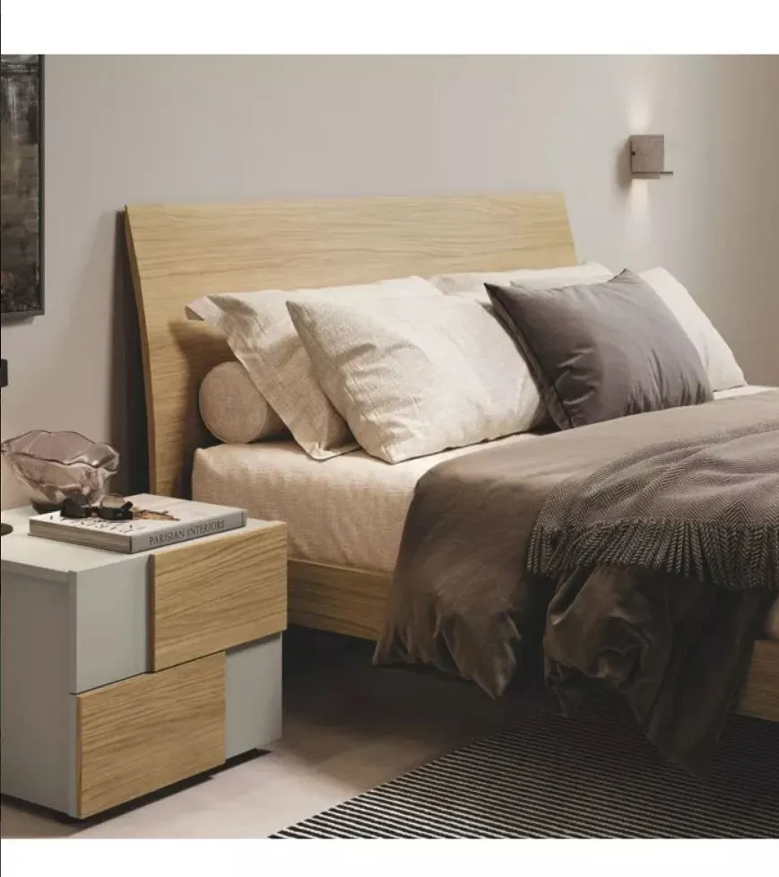 La curvatura della testiera è il dettaglio che fa la differenza rispetto ai letti con pannello piatto: ammorbidisce le geometrie senza caricare il design, dà una sensazione visiva di accoglienza che i pannelli a 90° non hanno. È sottile chi non ci fa caso non la nota, chi la vede non può smettere di notarla.