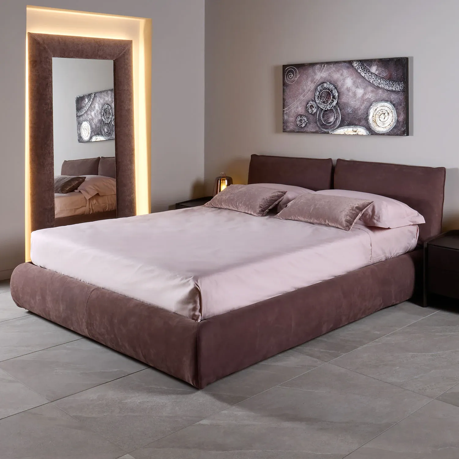 Il letto matrimoniale imbottito con contenitore Astoria outlet si distingue per le sue linee generose e avvolgenti.