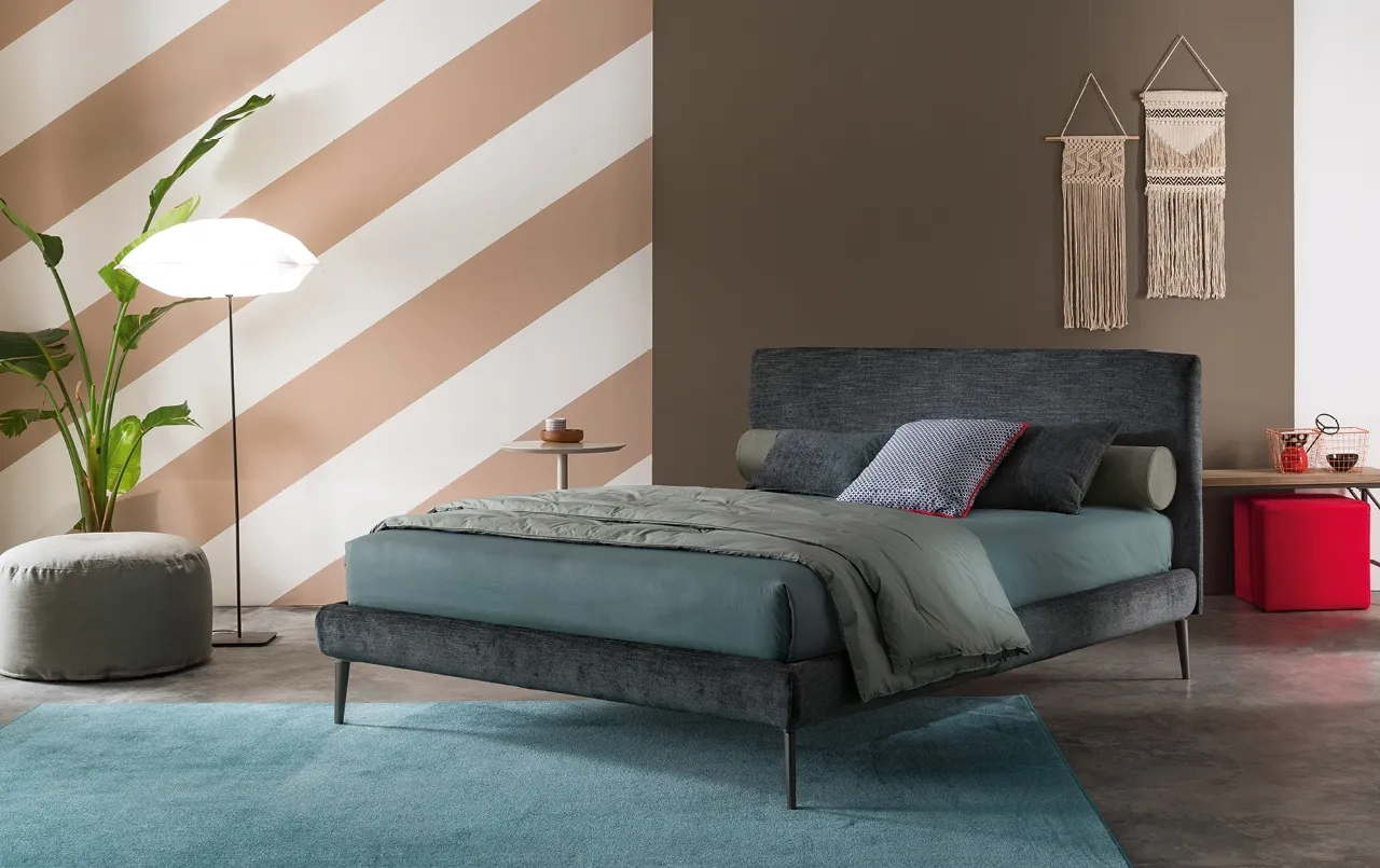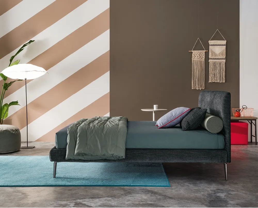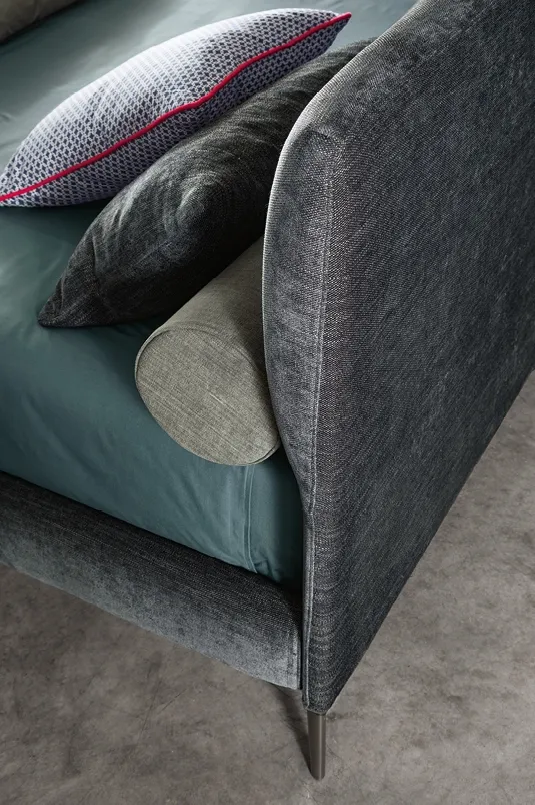 La forma particolare della testata consente di avere un letto imbottito con testiera morbida mantenendo una profondità ridotta, perfetto per ambienti con spazi limitati. Garantisce comfort senza compromessi sulla praticità.