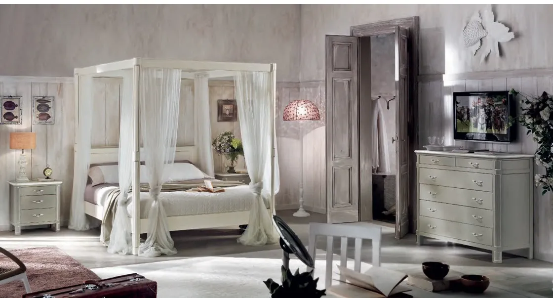 Il letto Letto a baldacchino dell'azienda è classici, per questo motivo va abbinato ai restanti pezzi d'arredo della camera da letto secondo questa peculiare coerenza di stile.
