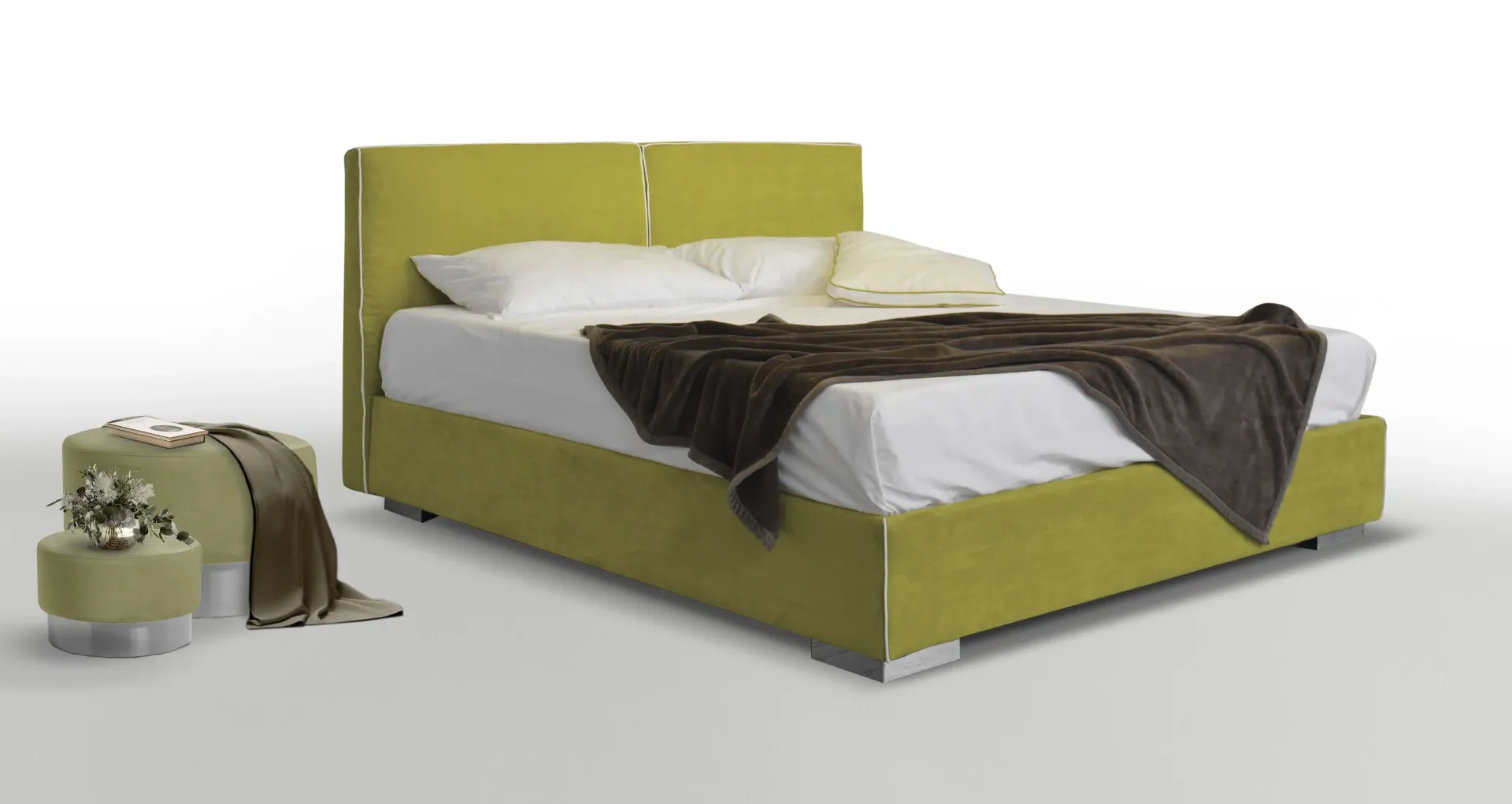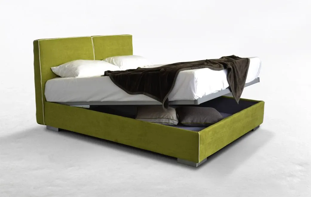 Letto matrimoniale imbottito completamente sfoderabile e con tessuto a scelta antimacchia, giroletto alto H28 cm con contenitore ad alzata normale, piedi in PVC nero h.8 cm di serie.