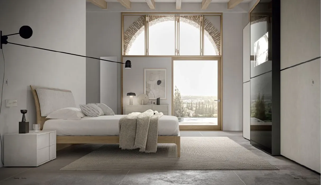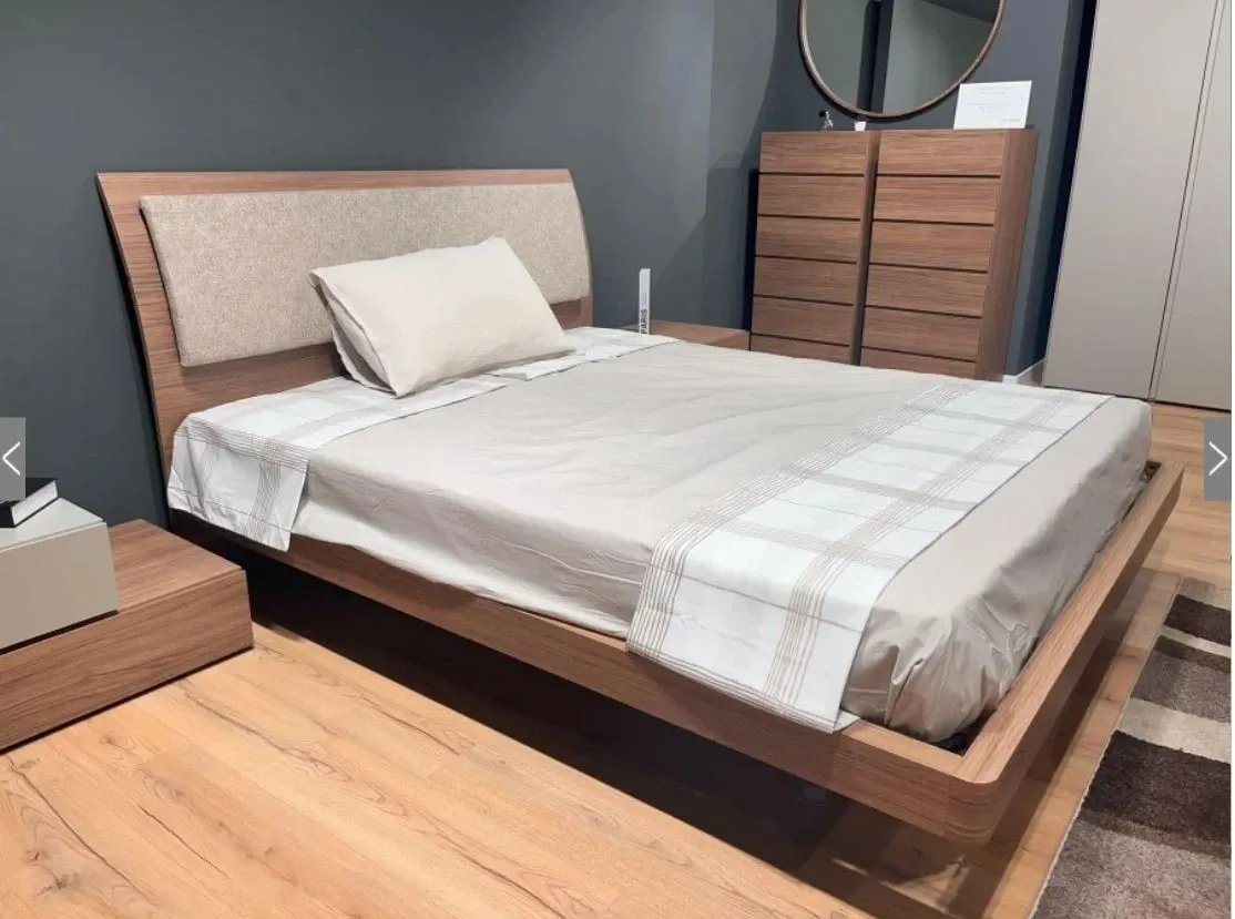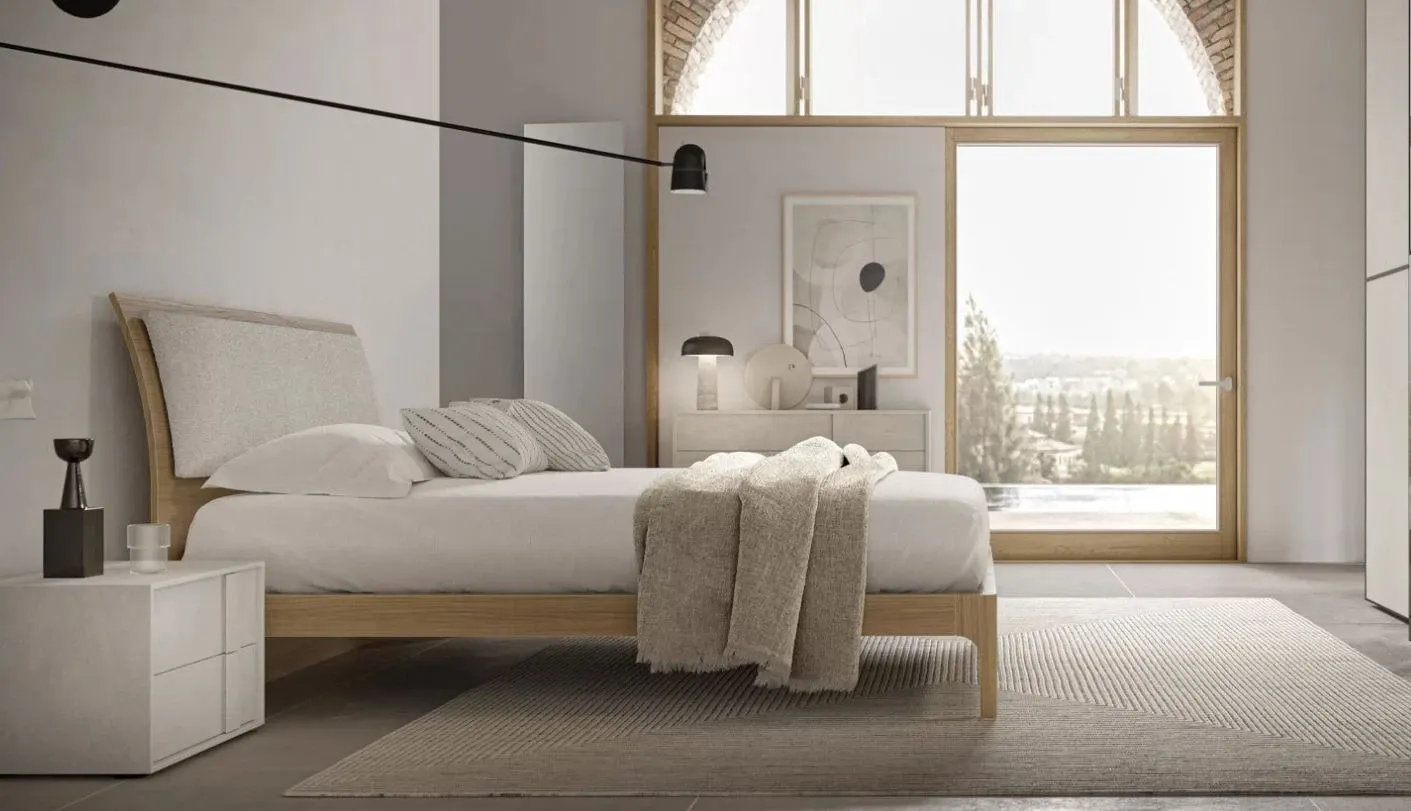 Il prezzo si riferisce al letto con testiera legno, finitura essenza, eco, materico con ring con piede curvo