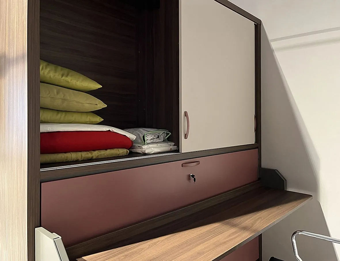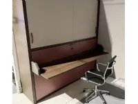 Hiro è un letto singolo a scomparsa orizzontale con scrivania incorporata, apribile tramite rotazione laterale brevettata e apprezzato per la sua profondità ridotta. Soluzione salvaspazio 2 in 1 adatta a una stanza-studio, un monolocale, un appartamento in affitto o una seconda casa, consente di passare dalla zona giorno alla zona notte rapidamente e senza sforzo. Ispirato al funzionamento del tradizionale letto a vagone, Hiro è un mobile trasformabile compatto capace di assolvere due funzioni in una: scrittoio di giorno, piano di riposo di notte. Durante la giornata, la scrivania poco profonda integrata alla struttura consente infatti di allestire un piccolo angolo home office nel quale studiare o lavorare, dedicarsi alla lettura o allo smart working. La sera, invece, Hiro assume un aspetto completamente diverso trasformandosi in un letto singolo con dormita trasversale parallela alla parete. Il passaggio da armadio-letto a piano di riposo avviene in pochi secondi grazie al meccanismo brevettato che governa la movimentazione del frontale. Tirato a sé e accompagnato verso terra, il pannello lascia spazio a un pianale a doghe con materasso da 190x90 cm alto 18. In fase di apertura, lo scrittoio scivola automaticamente sotto il letto mantenendo la posizione di partenza: grazie a questo accorgimento funzionale, non è necessario rimuovere gli oggetti presenti sulla scrivania al momento della trasformazione, né liberare ulteriore spazio a centro stanza. L'attenzione rivolta alla meccanica e alla sicurezza, incarnati da un meccanismo brevettato per prevenire l'apertura accidentale e la caduta violenta del letto, vanno di pari passo con una ricerca estetica volta a nobilitare il classico letto a scomparsa per farne un complemento elegante e di tendenza. Saranno le finiture, declinate in colori d'accento, sfumature neutre o effetti legno, a determinare lo stile e il carattere dell'arredo. 209 p.32,8 h.232 Profondità massima con letto aperto: 106 cm Profondità totale: profondità struttura + scrittoio Altezza scrittoio da terra: 75 cm Caratteristiche Letto a scomparsa Clever Hiro Struttura: Cotto Rivestimento: Cotto Anta Tortor. Siamo rivenditori ufficiali Clever e possiamo fornire tutti gli articoli del catalogo Clever ad un prezzo particolare. Contattateci per un preventivo personalizzato.