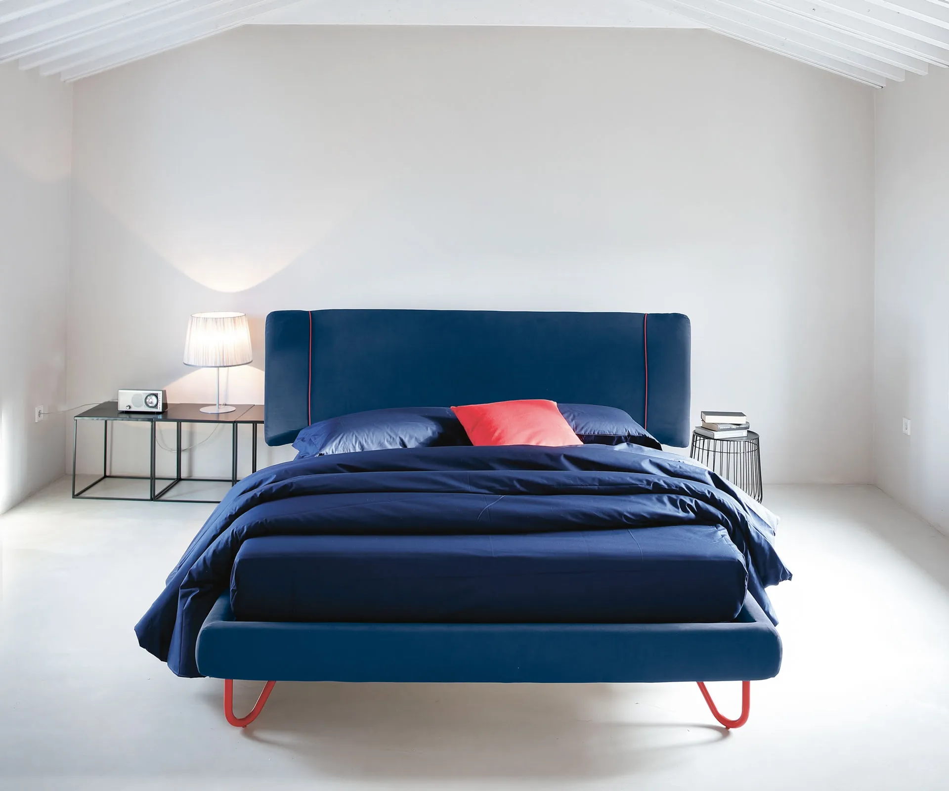 Il dettaglio che lo rende riconoscibile è il bordino a contrasto che segue il profilo curvo della testiera e del giroletto un filo sottile, quasi sartoriale, che si abbina al colore dei piedini in ferro. Cambi il colore del piedino, cambia anche il carattere del letto. Con i piedini neri e bordino nero diventa essenziale e deciso. Con un Pantone vivace diventa un pezzo di arredo con personalità propria.
