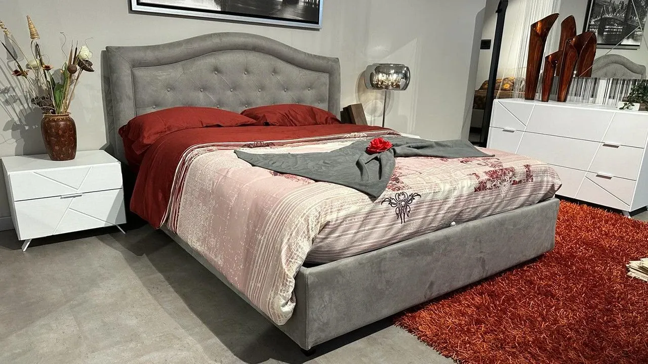 Letto matrimoniale Hamily con contenitore in econabuk grgio con pidini in finitura cromo, con testiera lavorata e trapuntata con bottoni.