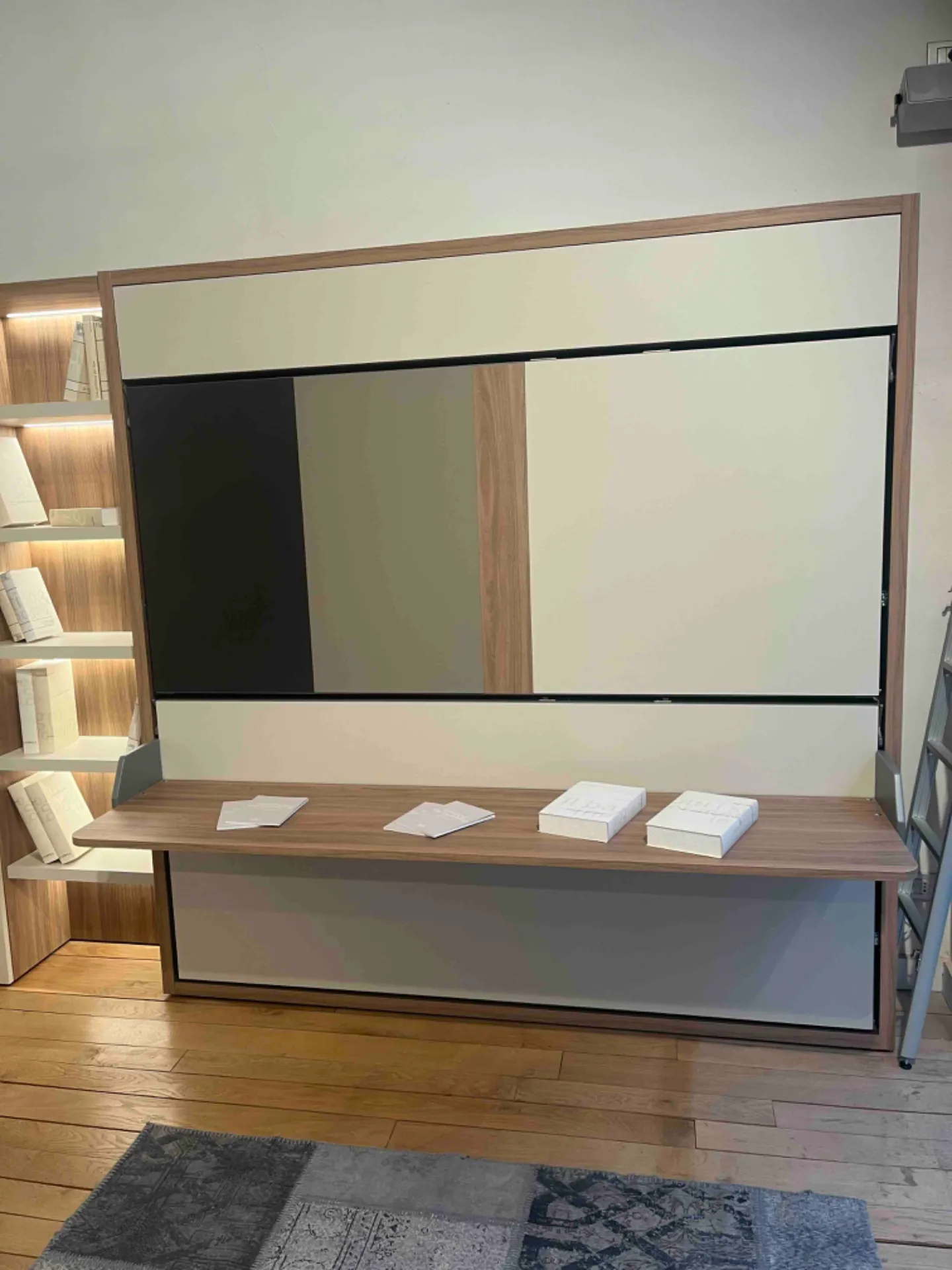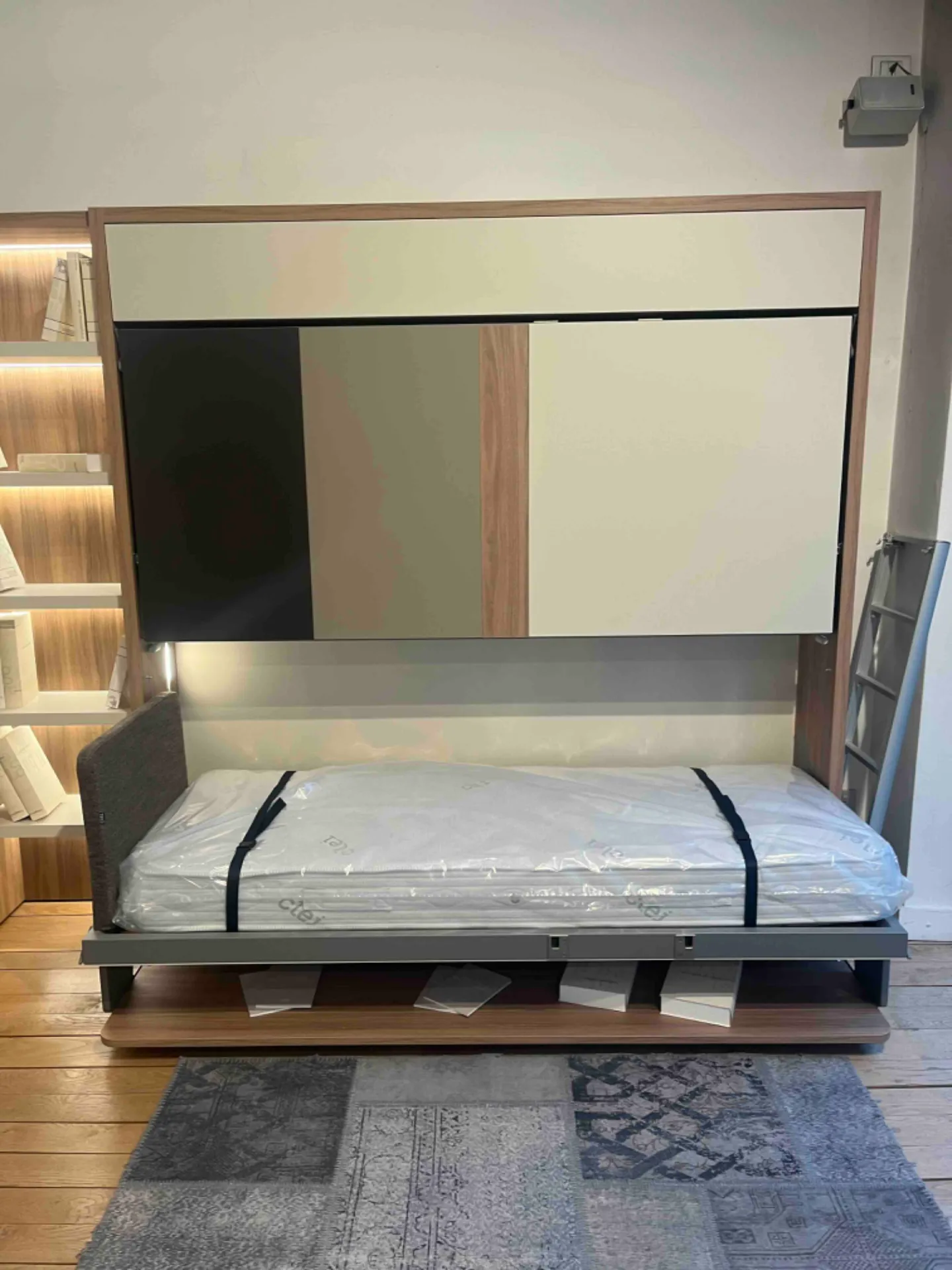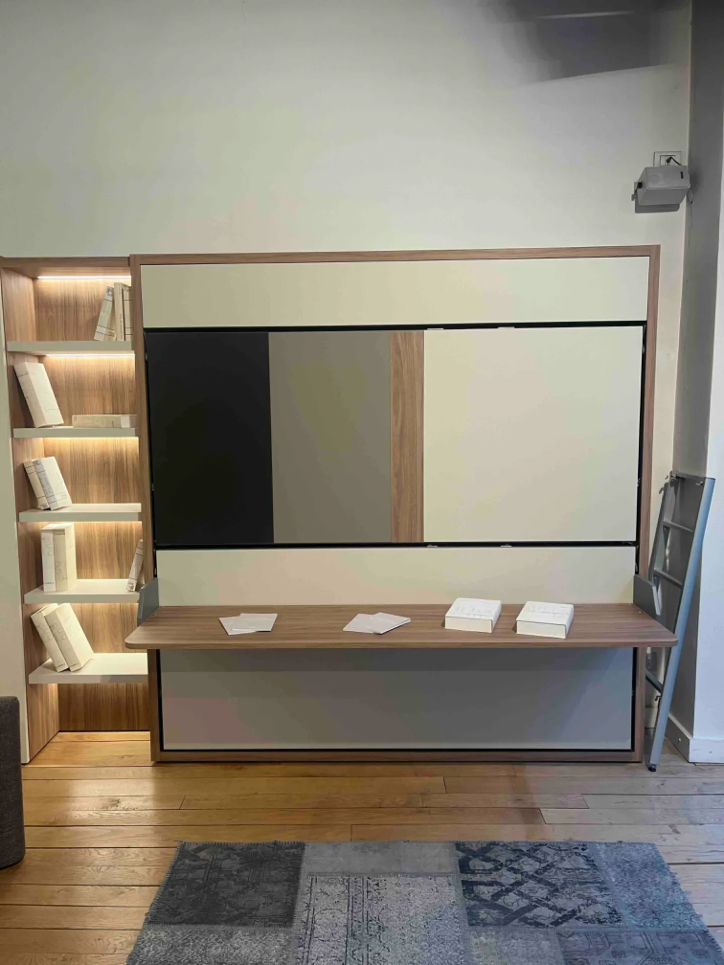 Il letto a castello a scomparsa con scrivania Kali Duo ha un sistema luce LED con paracolpi (opzionale), certificato e conforme alla normativa in materia. Il mobile è realizzato nelle altezze 194,3 e 220 cm; in H 220 cm è completo di elemento contenitore con anta a scomparsa. Kali Duo è disponibile nelle versioni Standard, Board (scrittoio maxi), Sofa.