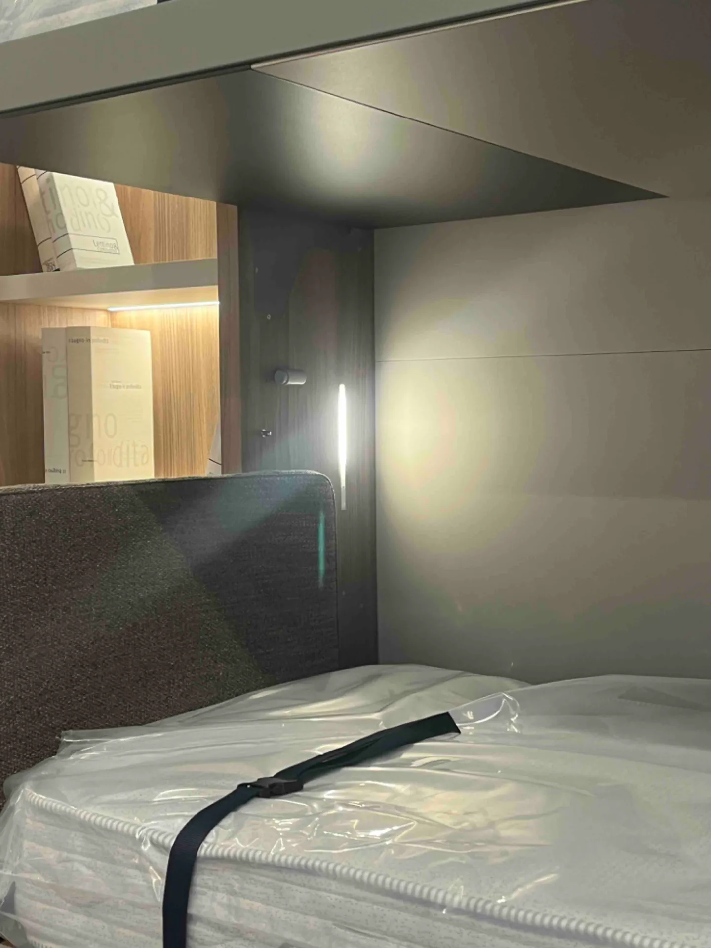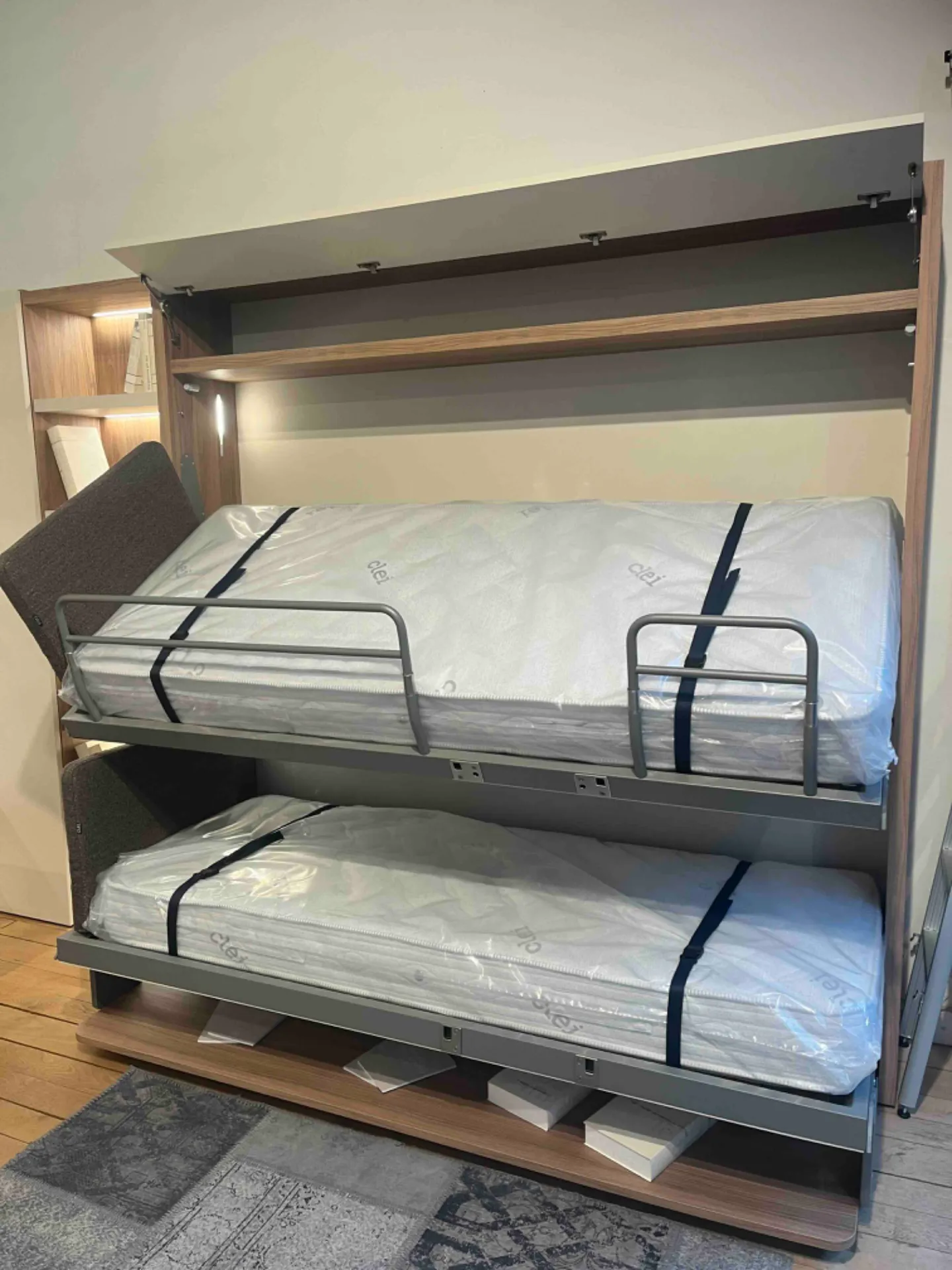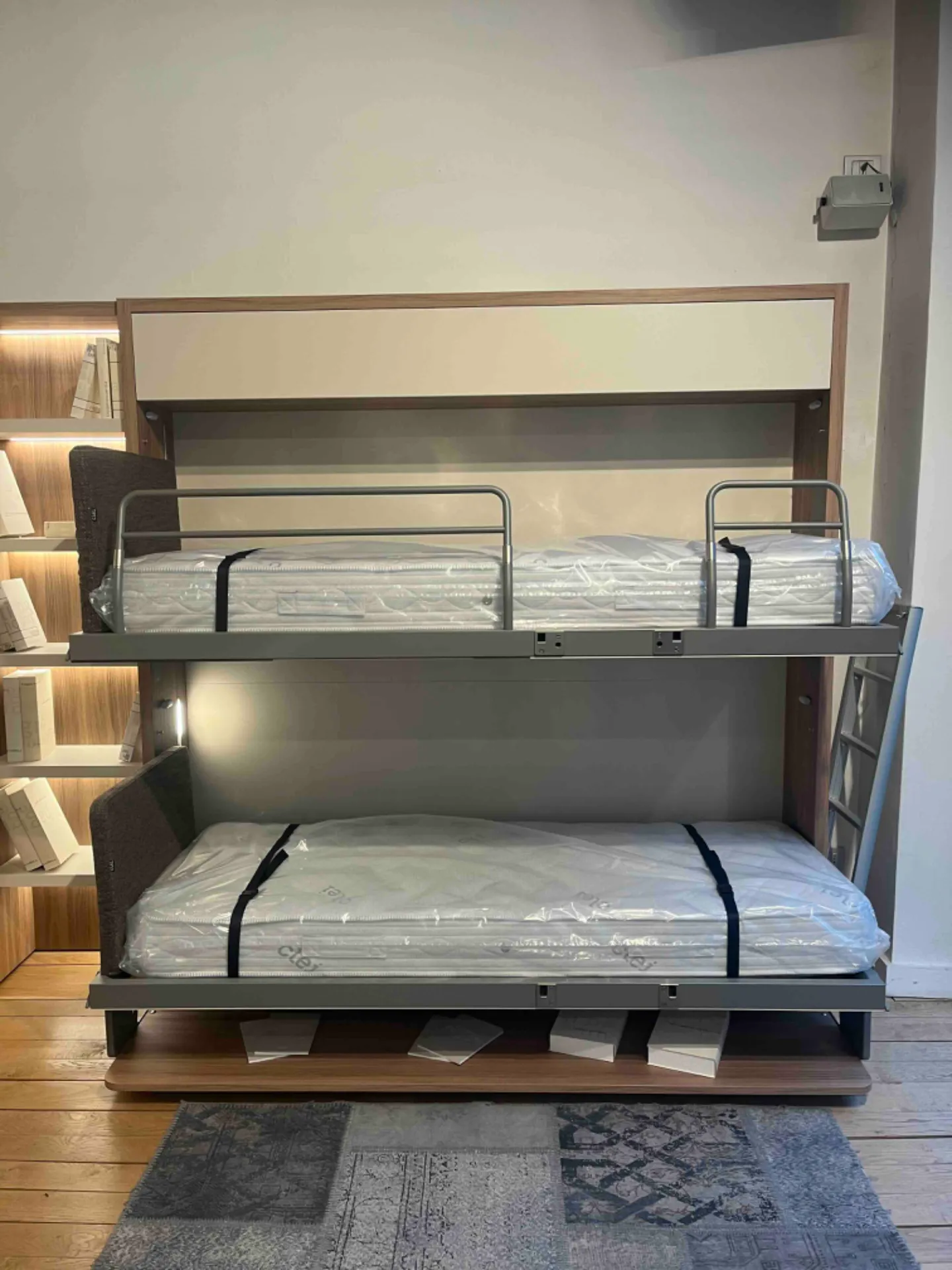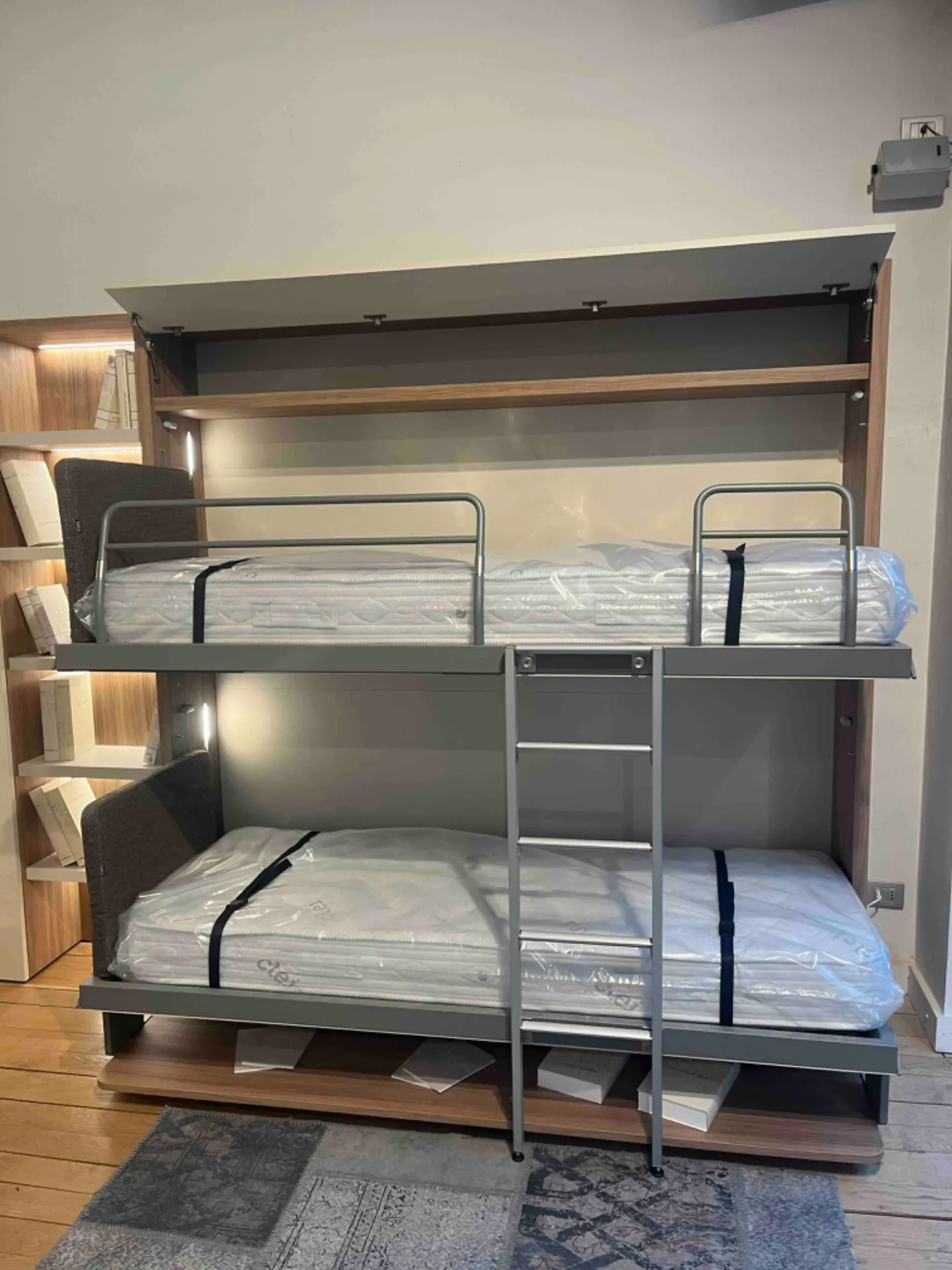Nella posizione con letti a castello, la scaletta in alluminio anodizzato, è fissata ad entrambi i letti e funge anche da ulteriore supporto. Il letto superiore è dotato del meccanismo di inclinazione per facilitarne il rifacimento, e le barriere di protezione sono reclinabili nelle versioni metallo e imbottite. La testata tessile è reclinabile, in base al tipo di barriera utilizzata.