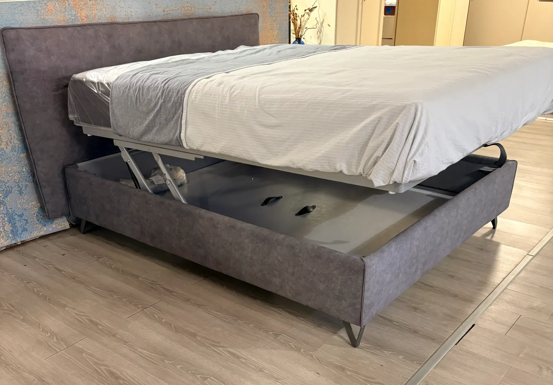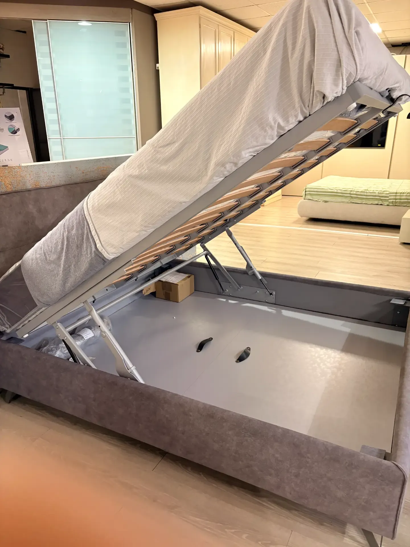 Letto con contenitore con meccanismo doppio , verticale e orizzontale che facilità il rifacimento del letto , contenitore è capiente con pannelli removibili il piede in metallo consente la pulizia sotto .