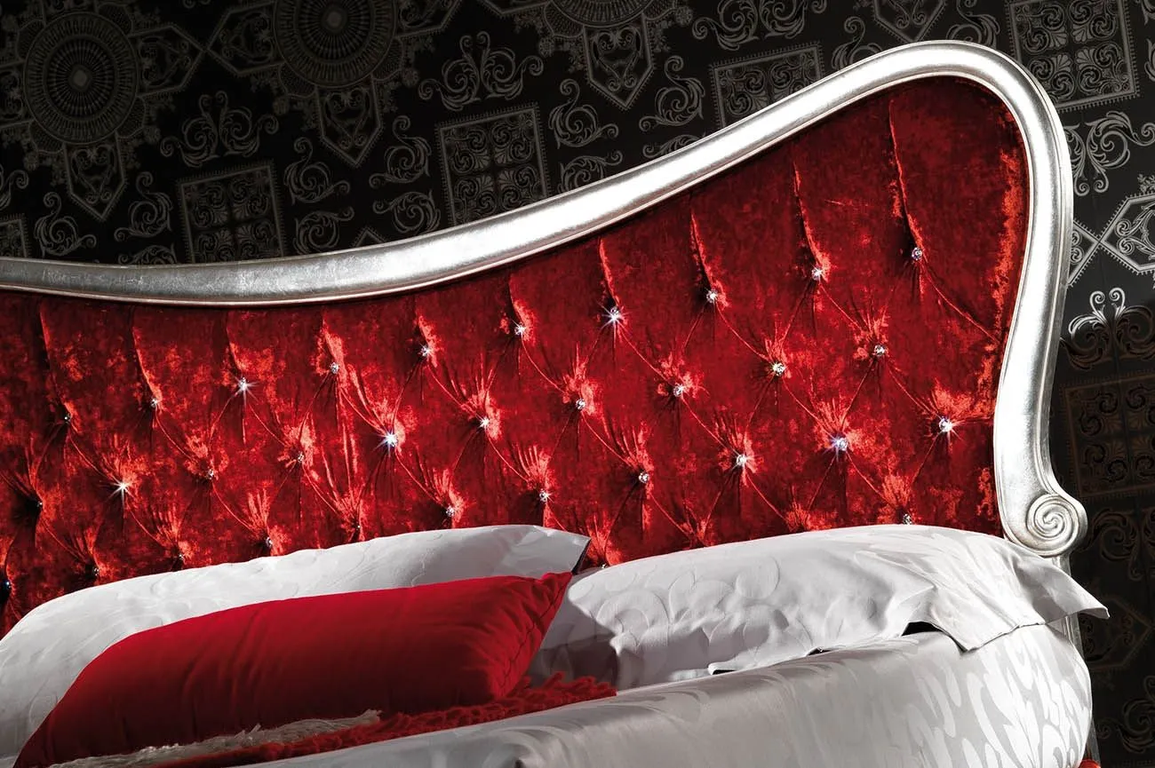 LETTO MATRIMONIALE PREDISPOSTO PER MATERASSO DA 160 X 200, COMPLETO DI RETE A DOGHE DI FAGGIO CORNICE TESTIERA IN LEGNO MASSELLO FOGLIA ARGENTO ( DISPONIBILE ANCHE IN ALTRI COLORI) IMBOTTITURA IN ESPANSO AD ALTISSIMA GRADAZIONE A QUOTE DIFFERENZIATE, RIVESTIMENTO FIRMATO ALESSANDRO BINI DISPONIBILE ANCHE IN ALTRE COLORAZIONI IL PREZZO č COMPLETO DI APPLICAZIONE DI VERI SWAROSKI SU OGNI PUNTO DI CUCITO PIEDINO SEMI CIPOLLA IN LEGNO FOGLIA ARGENTO COME CORNICE TESTIERA LARGHEZZA 182 CM LUNGHEZZA 218 CM ALTEZZA TESTIERA 128 CM