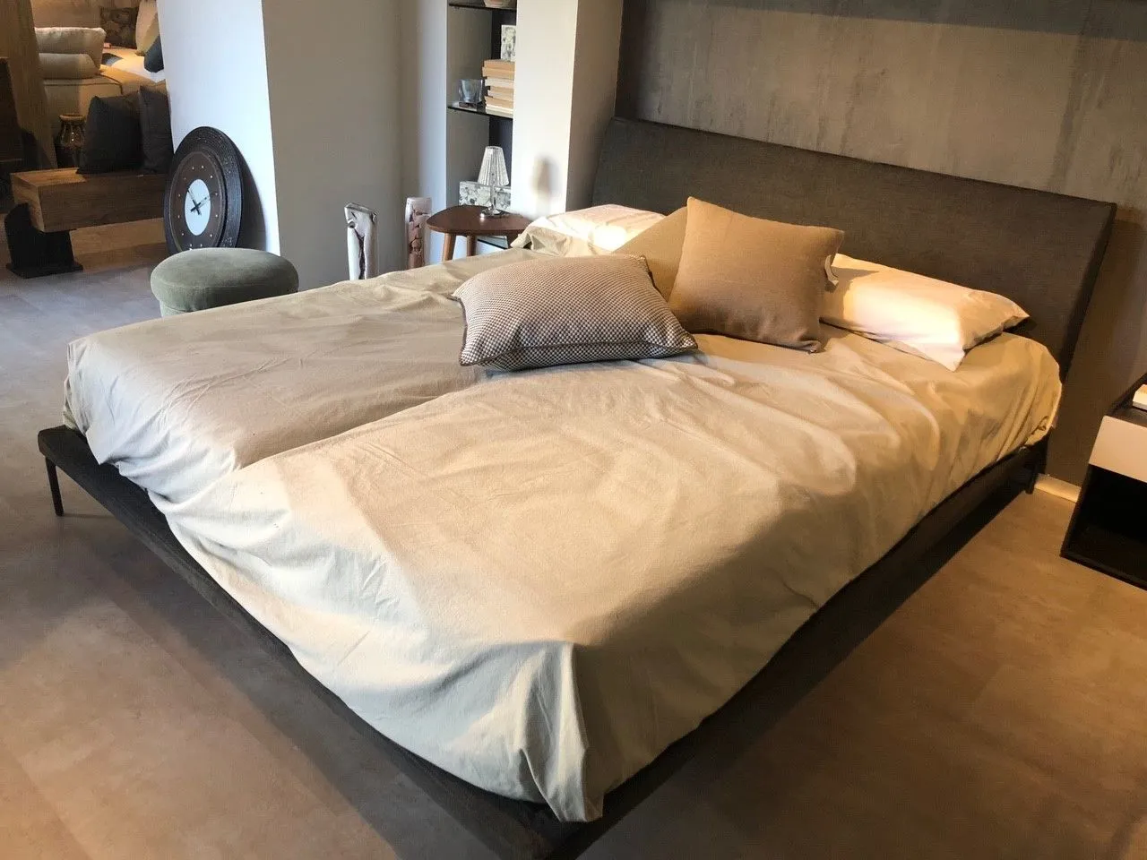 Letto con rete unica. Piedini in lega di alluminio lucidato, oppure nichelsatinato colore naturale o nero, oppure verniciato nero. Struttura in acciaio con doghe in faggio curvato. Imbottitura testiera in poliuretano/fibra poliestere termolegata. Rivestimento sfilabile in stoffa o pelle. Dimensioni L 166 P 216 H testiera 88 h piedino H 24 cm Categoria di tessuto 30