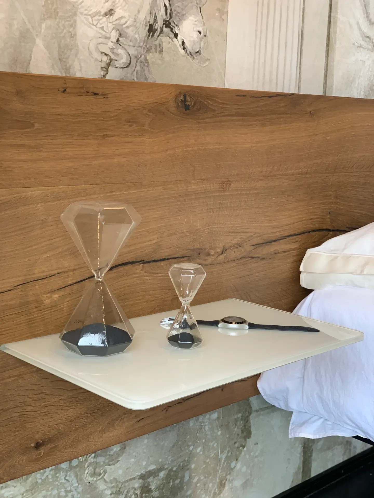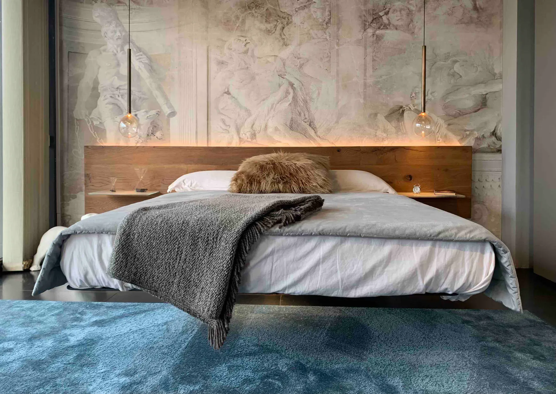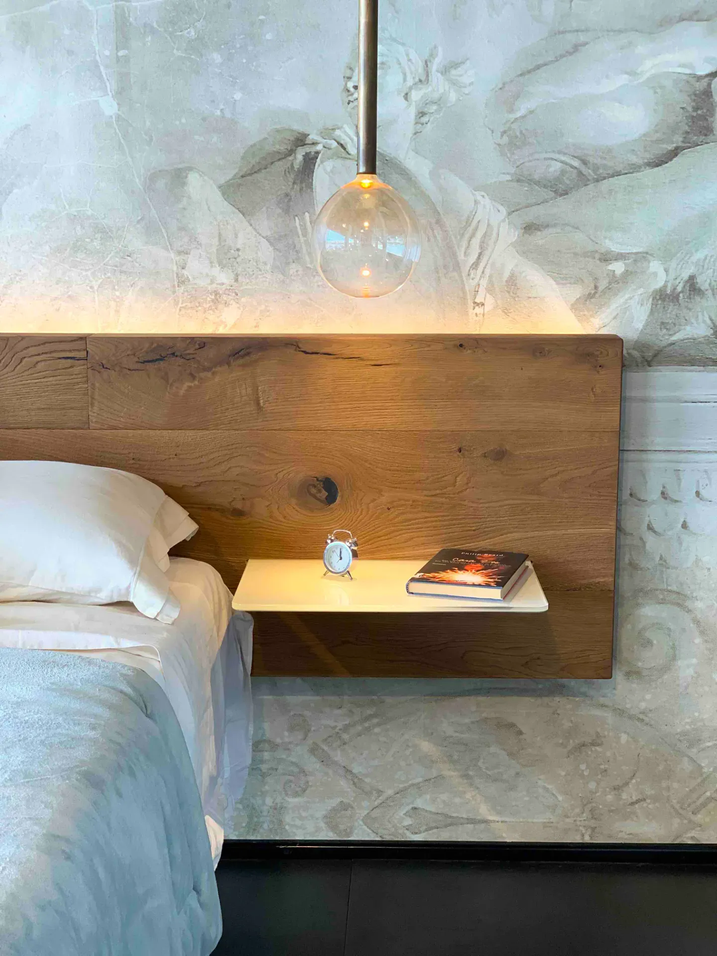 Il magico letto Fluttua, ad effetto sospeso, si "veste" con una testata in Rovere Centenario termotrattato, finitura Wildwood Naturale. Il letto matrimoniale comprende il pianale rete con struttura per materasso da cm 160x200 e la testata in legno Wildwood Naturale da cm 303 di larghezza per 56 cm di altezza.
