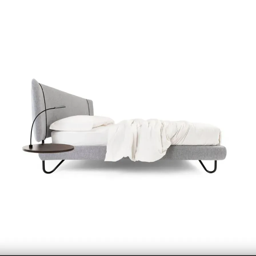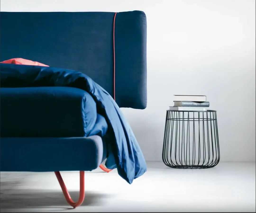 Il dettaglio che lo rende riconoscibile è il bordino a contrasto che segue il profilo curvo della testiera e del giroletto un filo sottile, quasi sartoriale, che si abbina al colore dei piedini in ferro. Cambi il colore del piedino, cambia anche il carattere del letto. Con i piedini neri e bordino nero diventa essenziale e deciso. Con un Pantone vivace diventa un pezzo di arredo con personalità propria. Noctis ha pensato questo modello esattamente così: il dettaglio cromatico come variabile di stile.